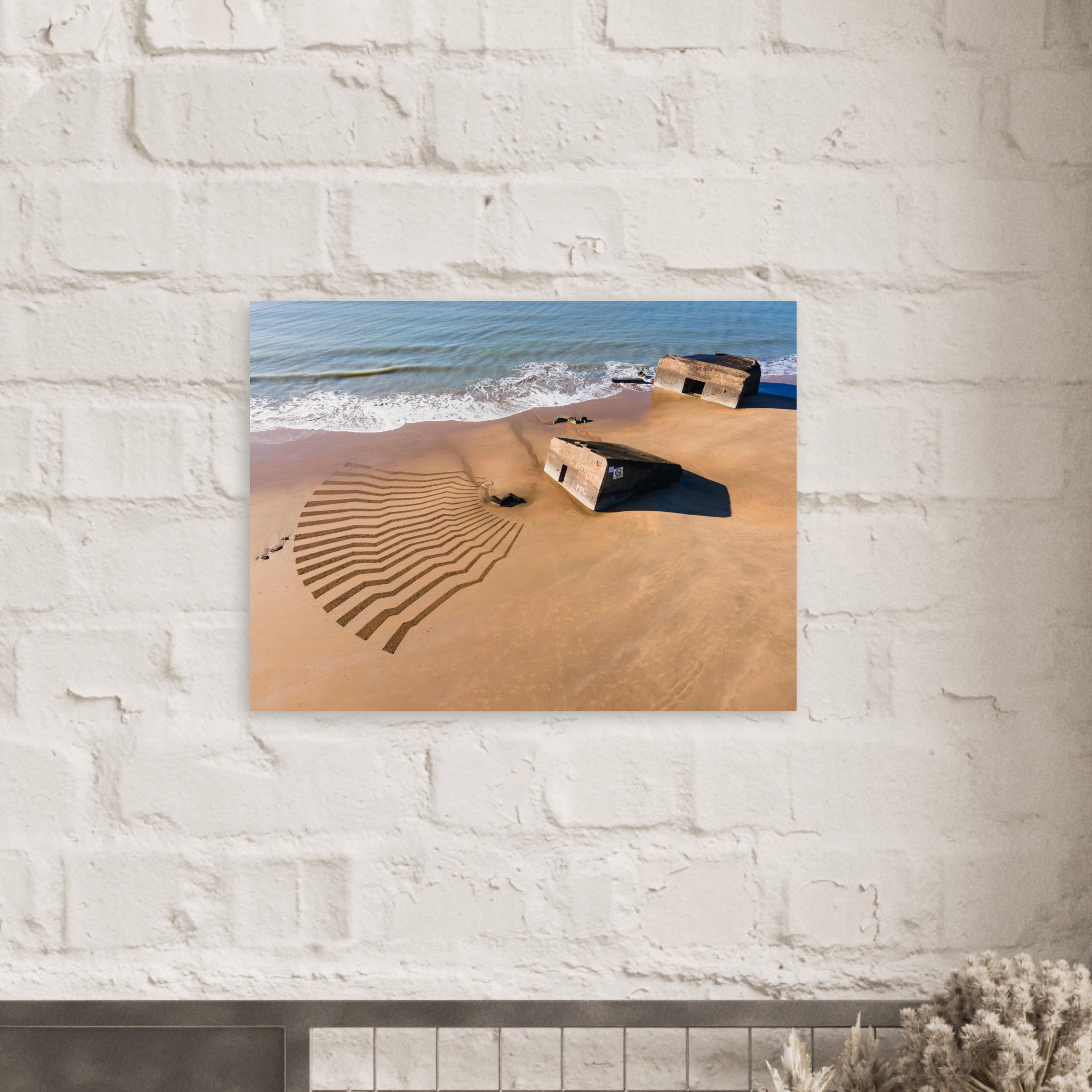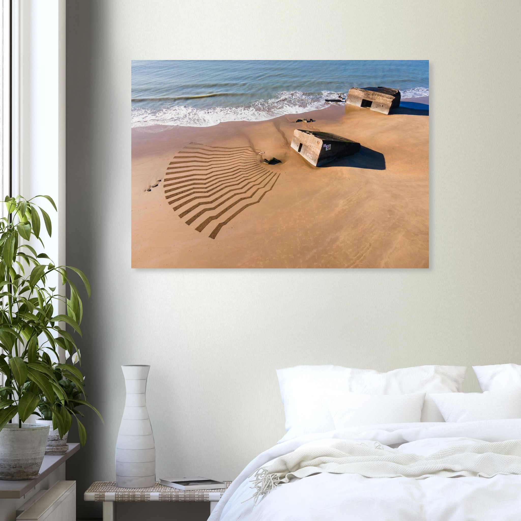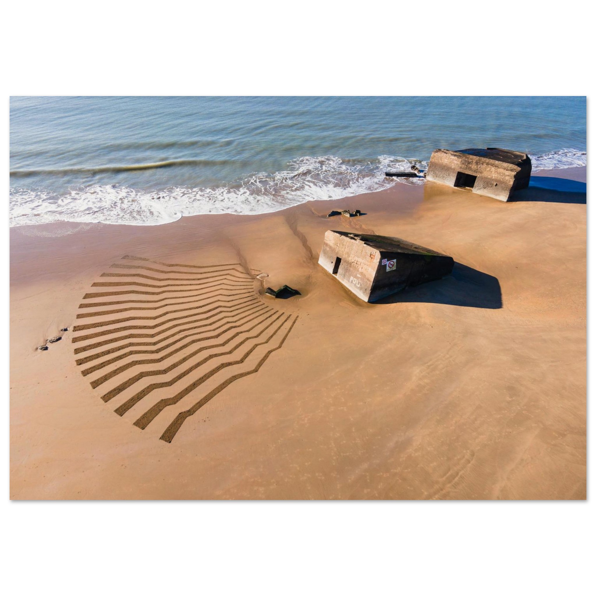 Une fresque géométrique face à l’océan et aux blockhaus engloutis.