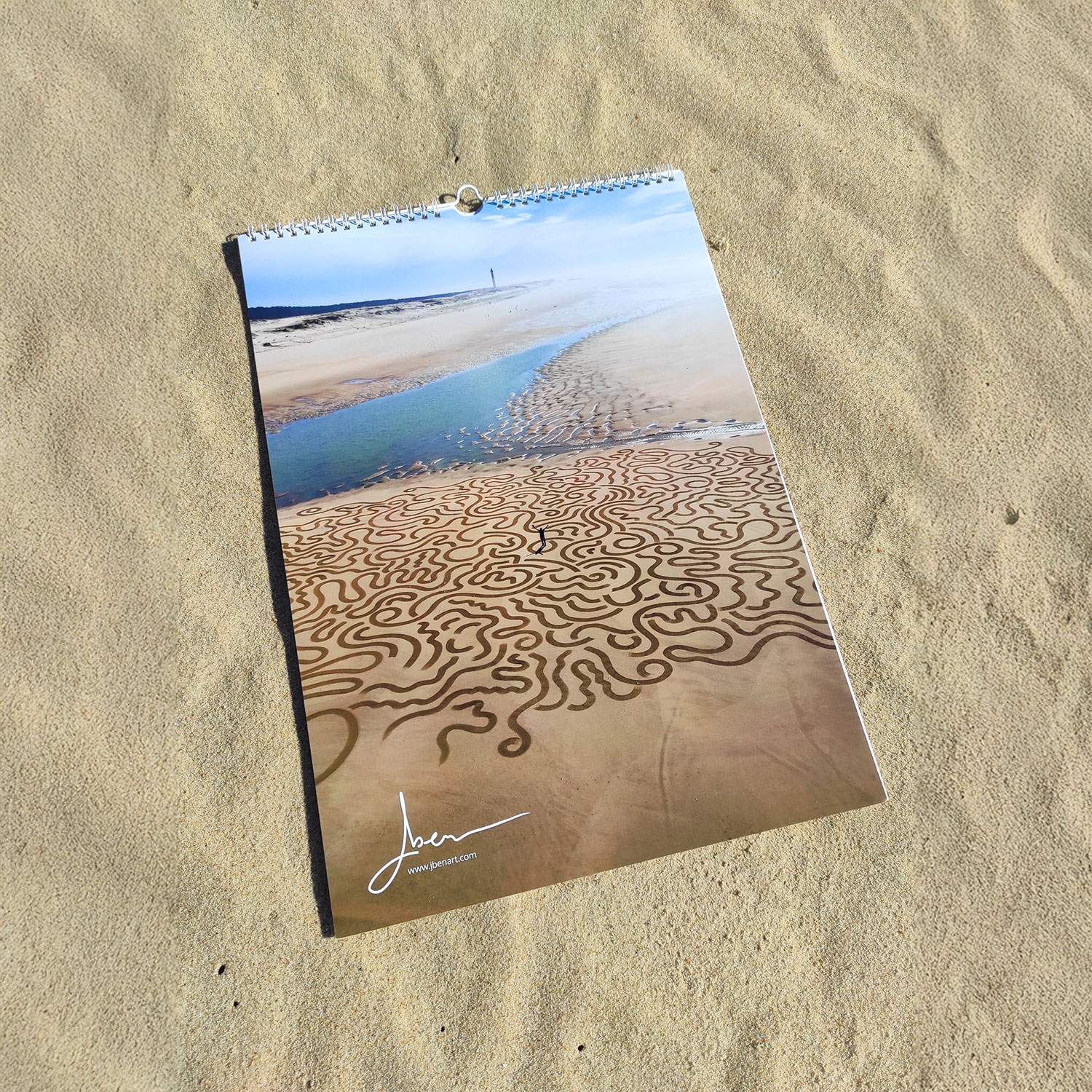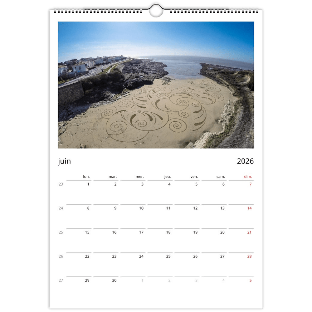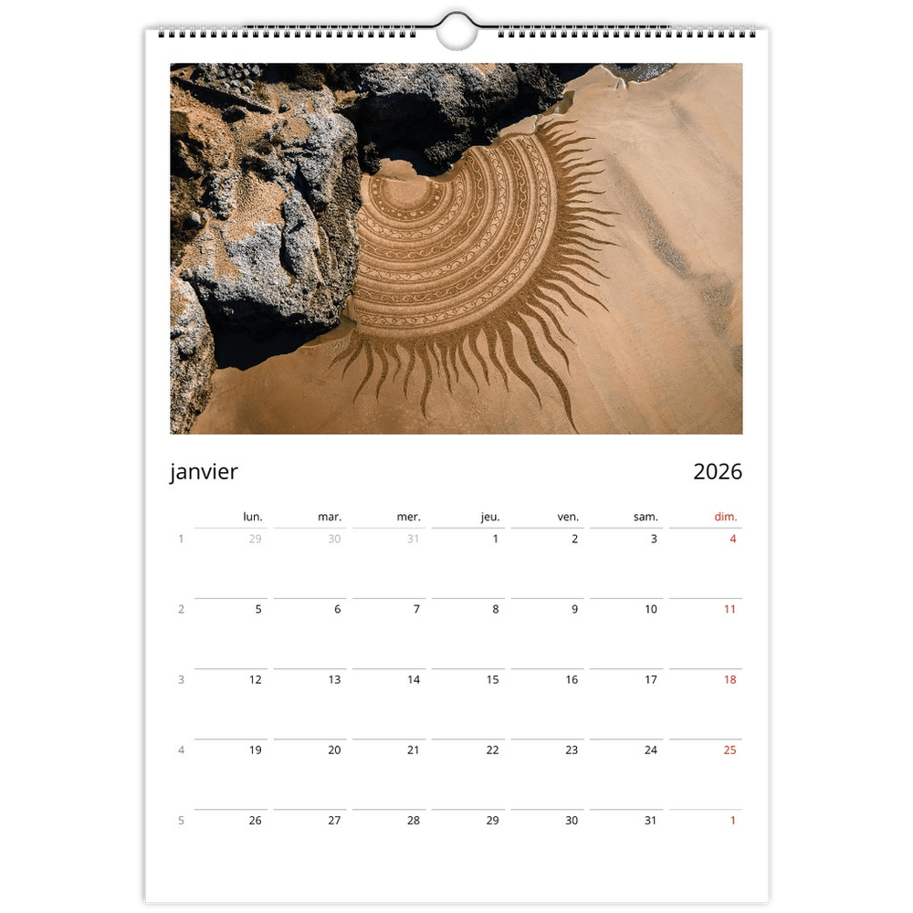 Découvrez le Calendrier 2026 Effet Mer, pensé comme un véritable objet à la fois pratique et esthétique. Imprimé sur des papiers certifiés FSC/FESC et fabriqué localement, il allie respect de l’environnement et qualité premium. Chaque mois s’accompagne d’une œuvre artistique dessinée sur la plage par Jben, transformant votre organisation quotidienne en une expérience visuelle unique.