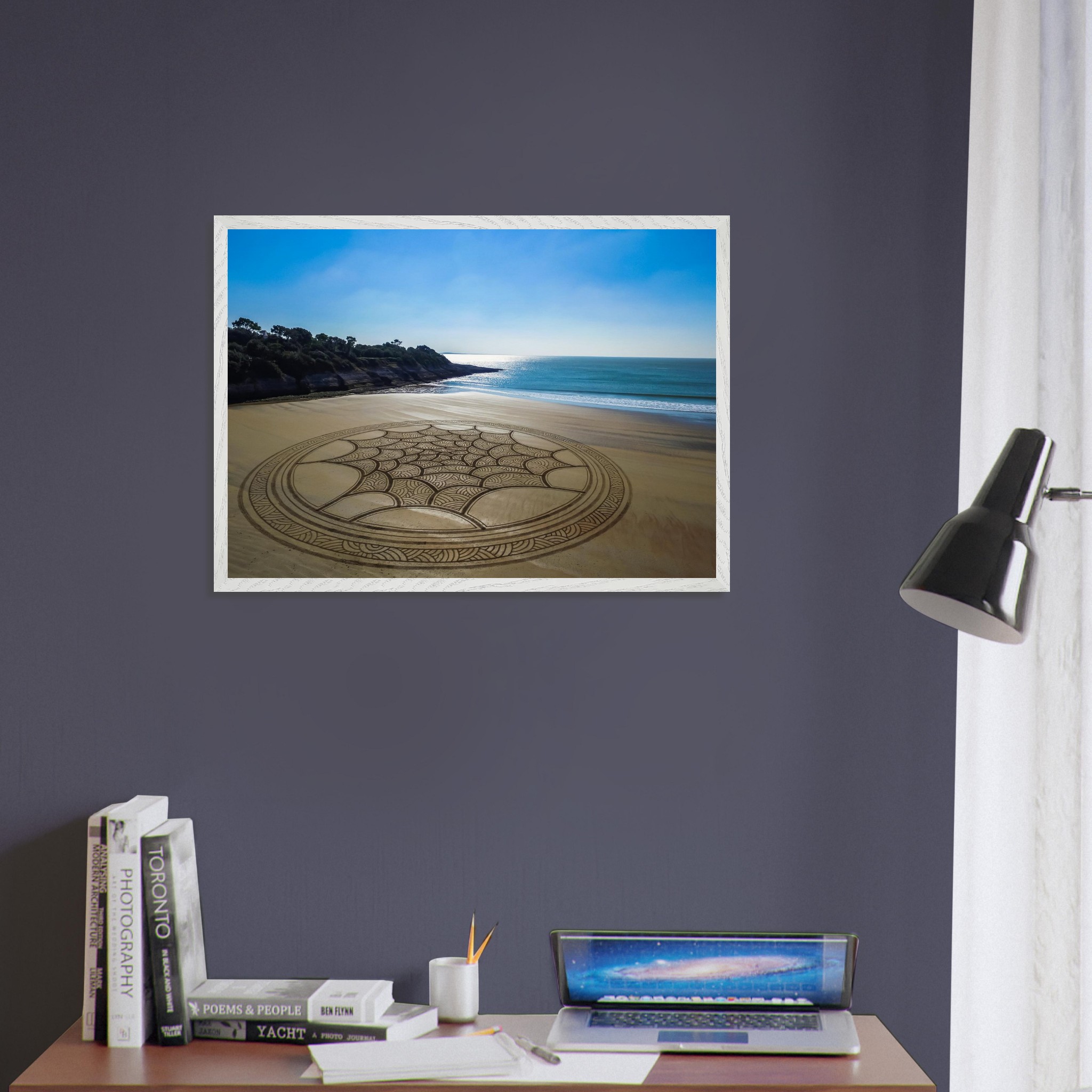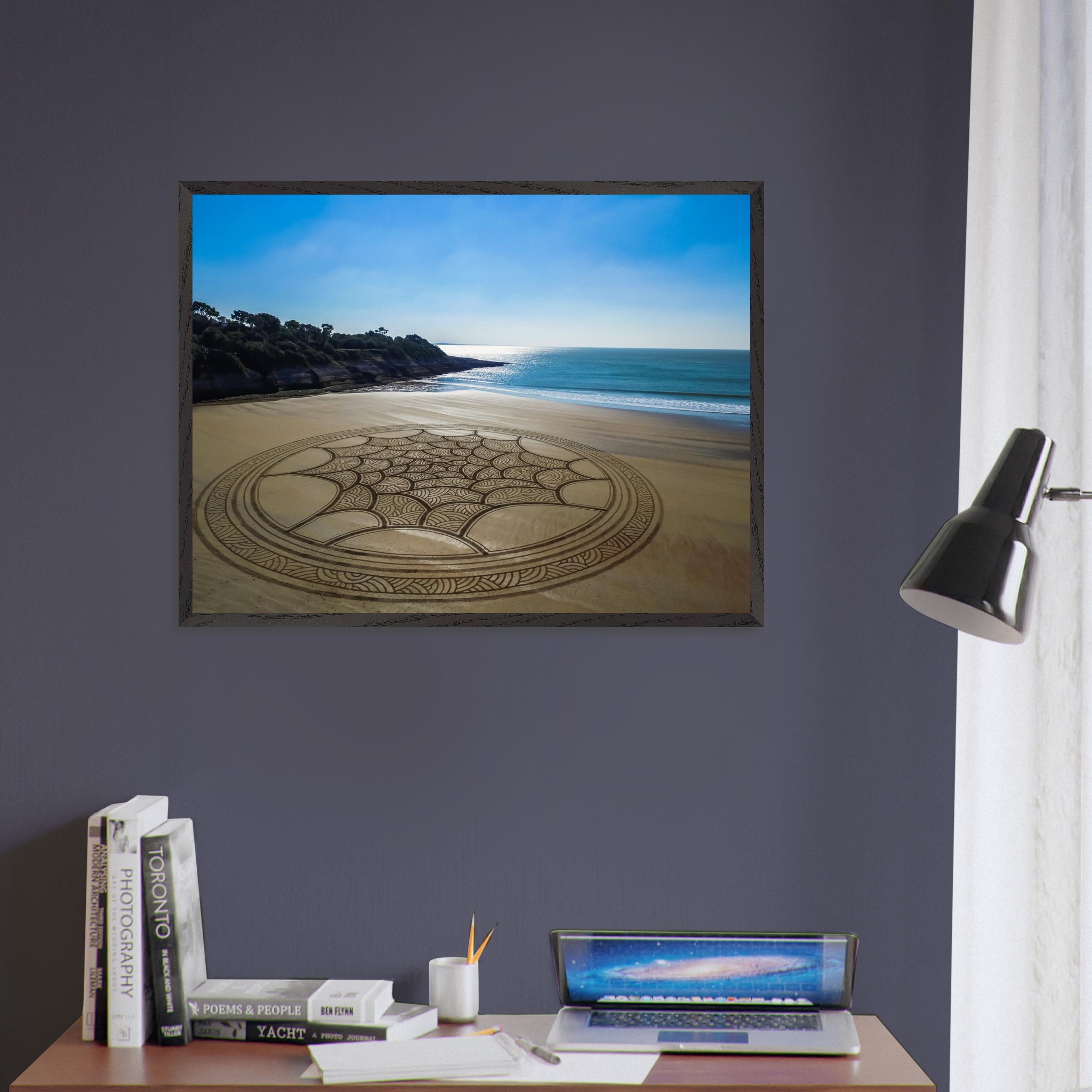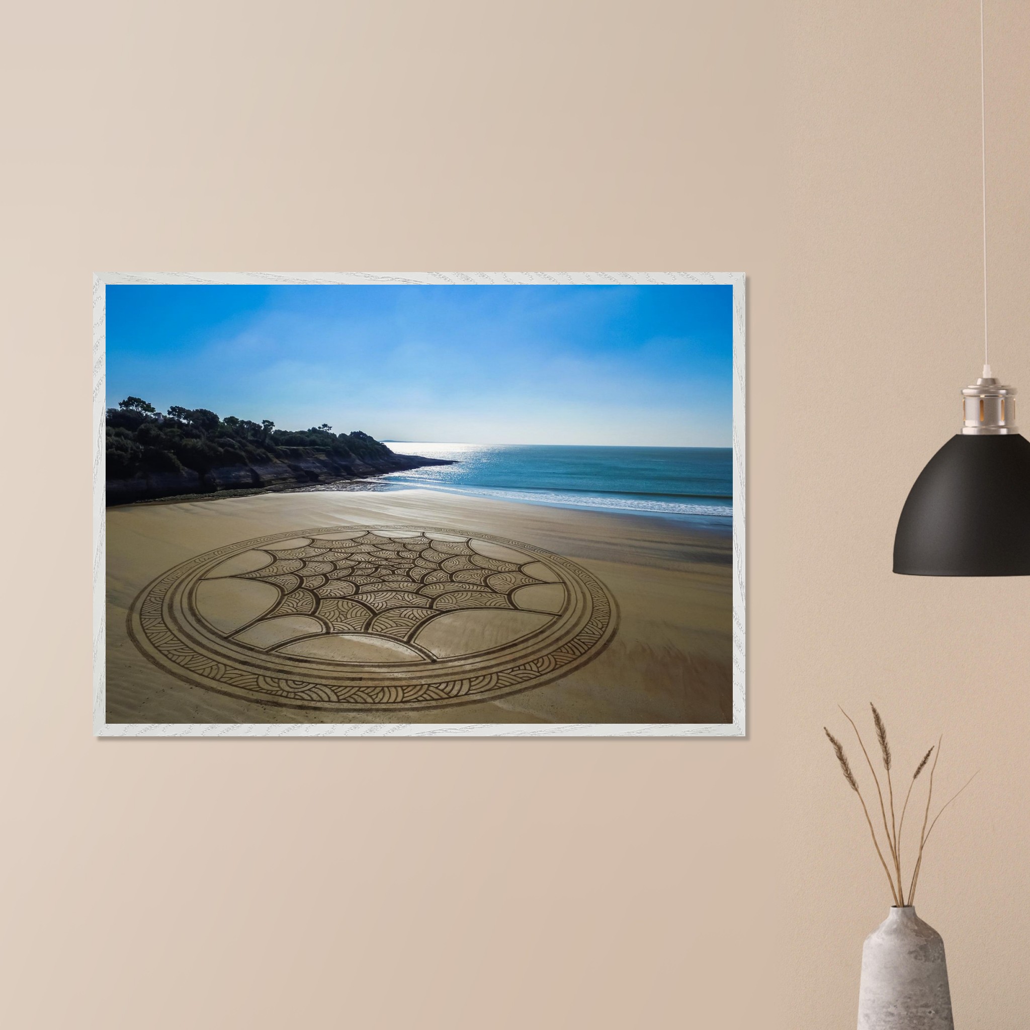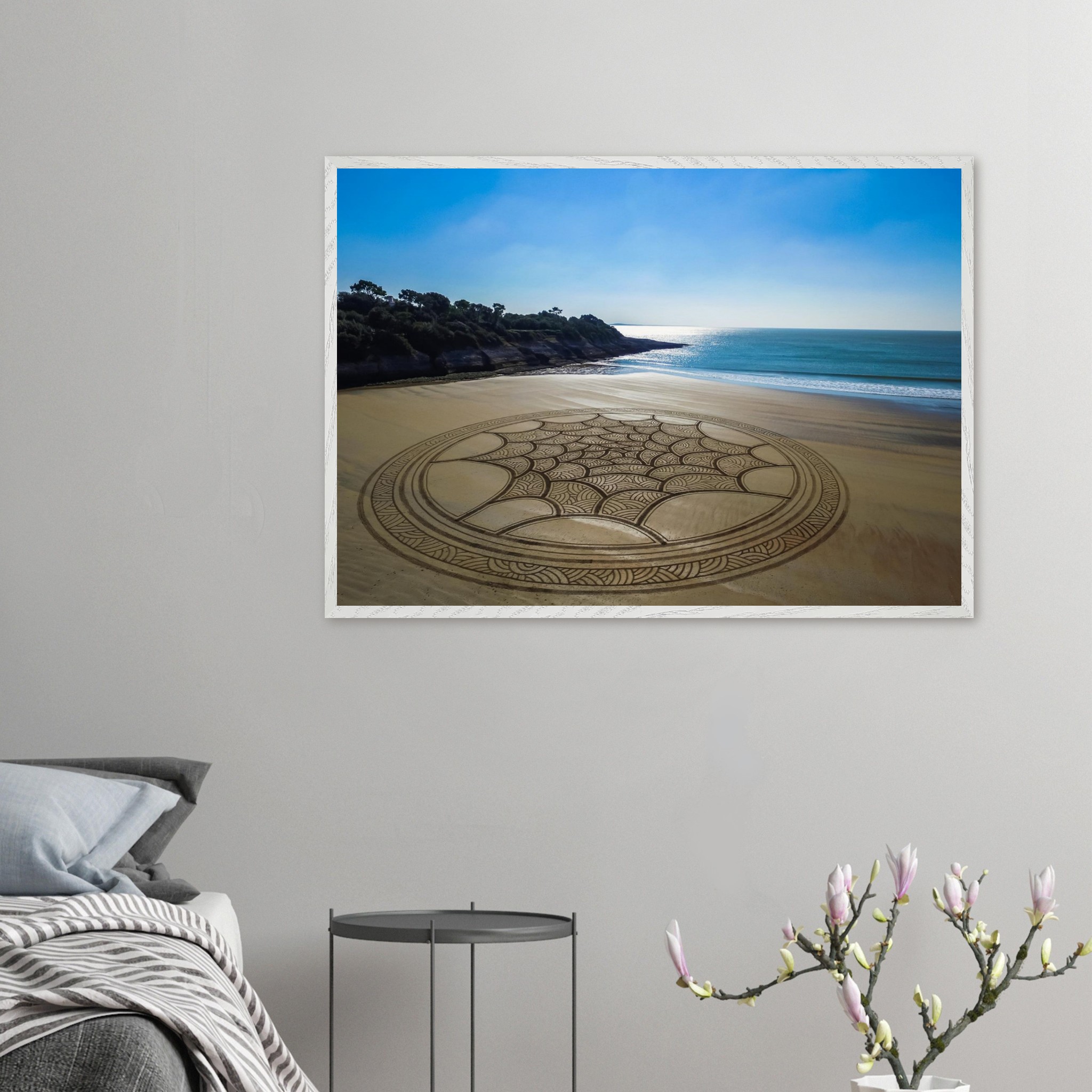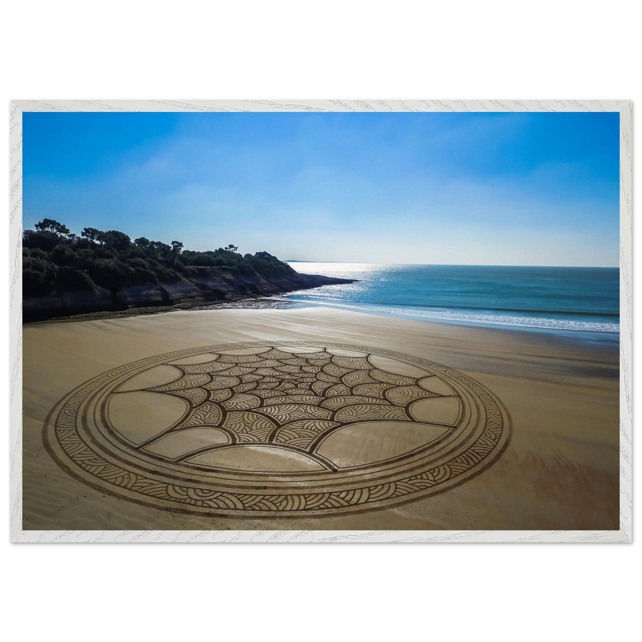 Une fresque mandala gravée sur la plage, alliant équilibre et harmonie.