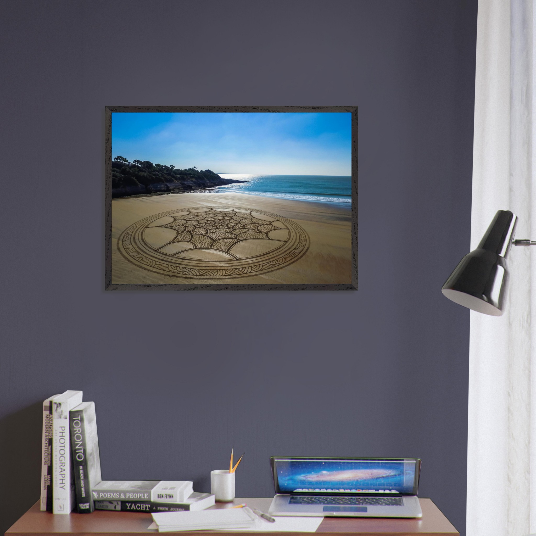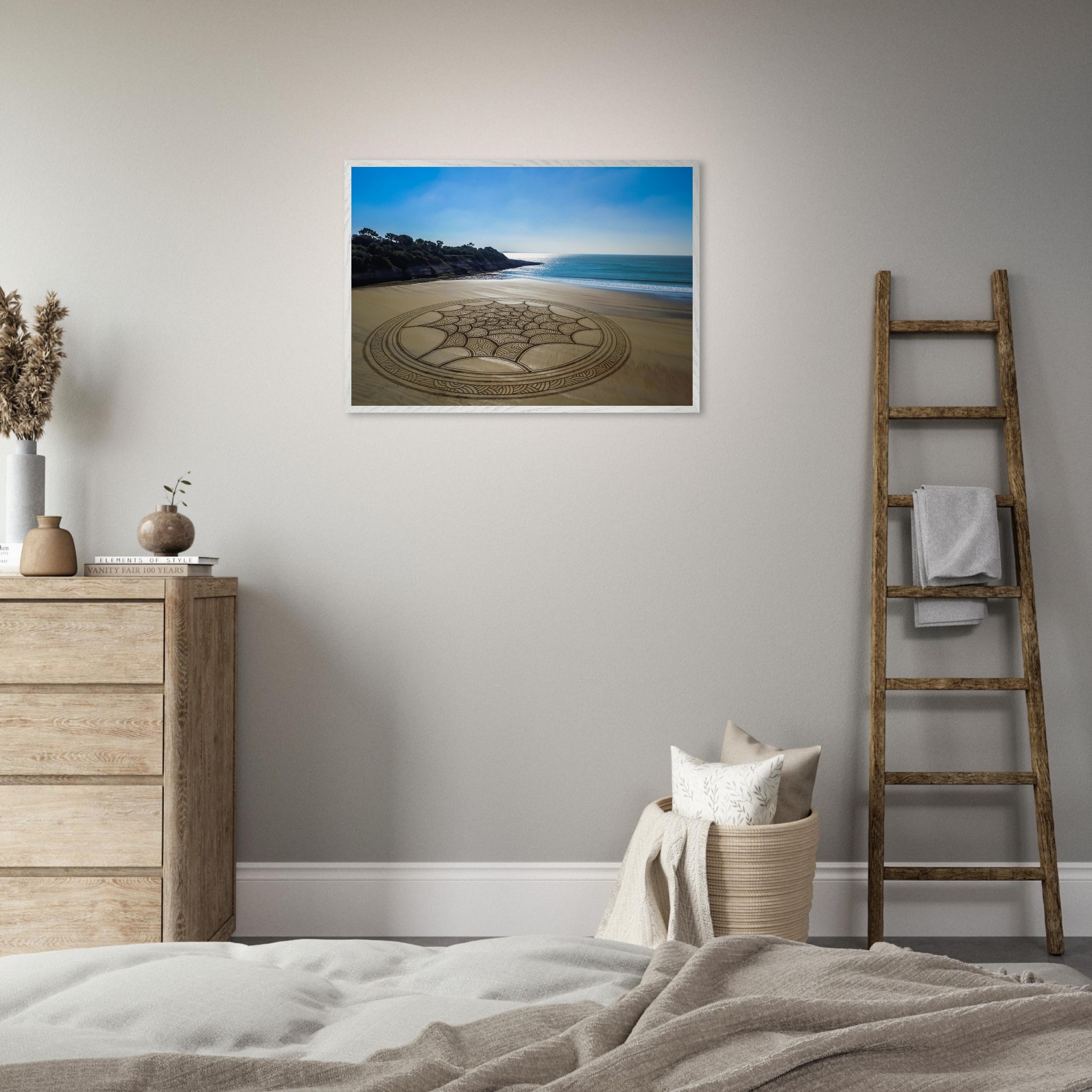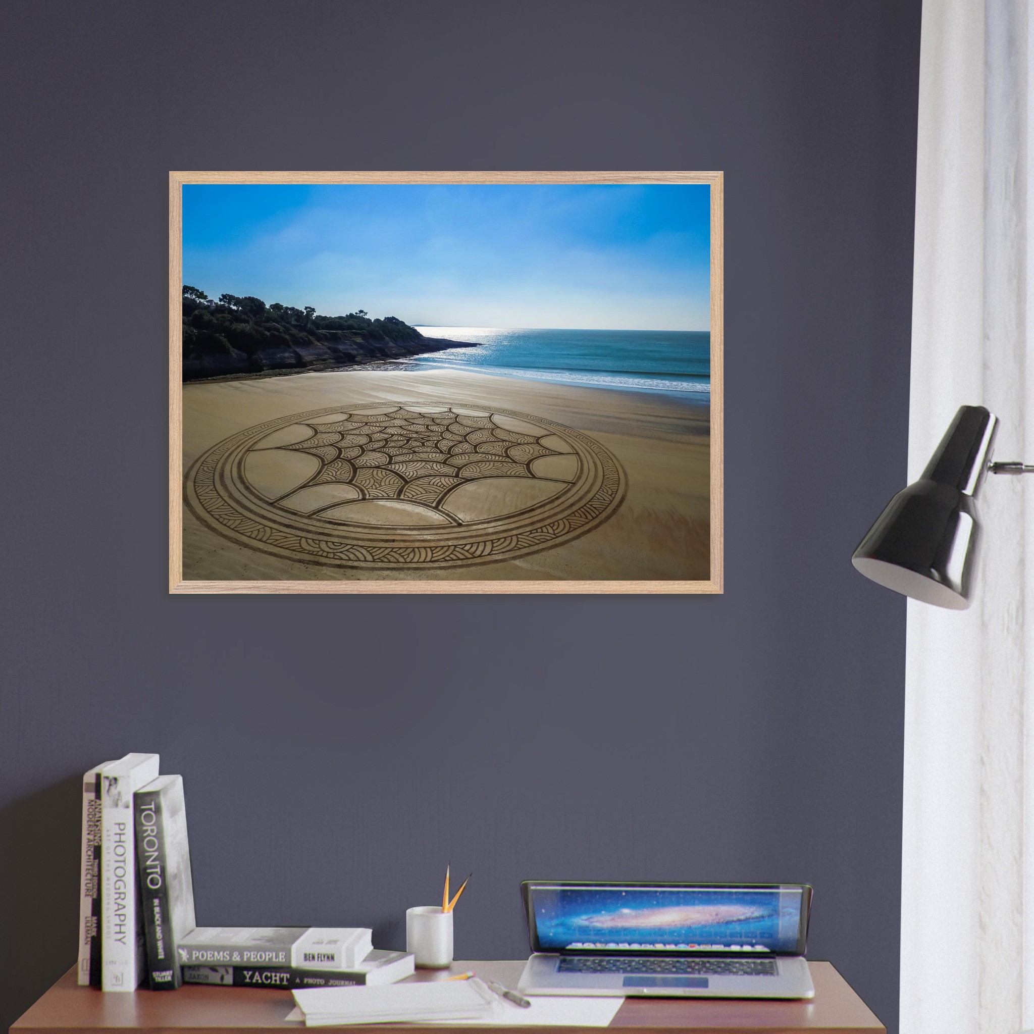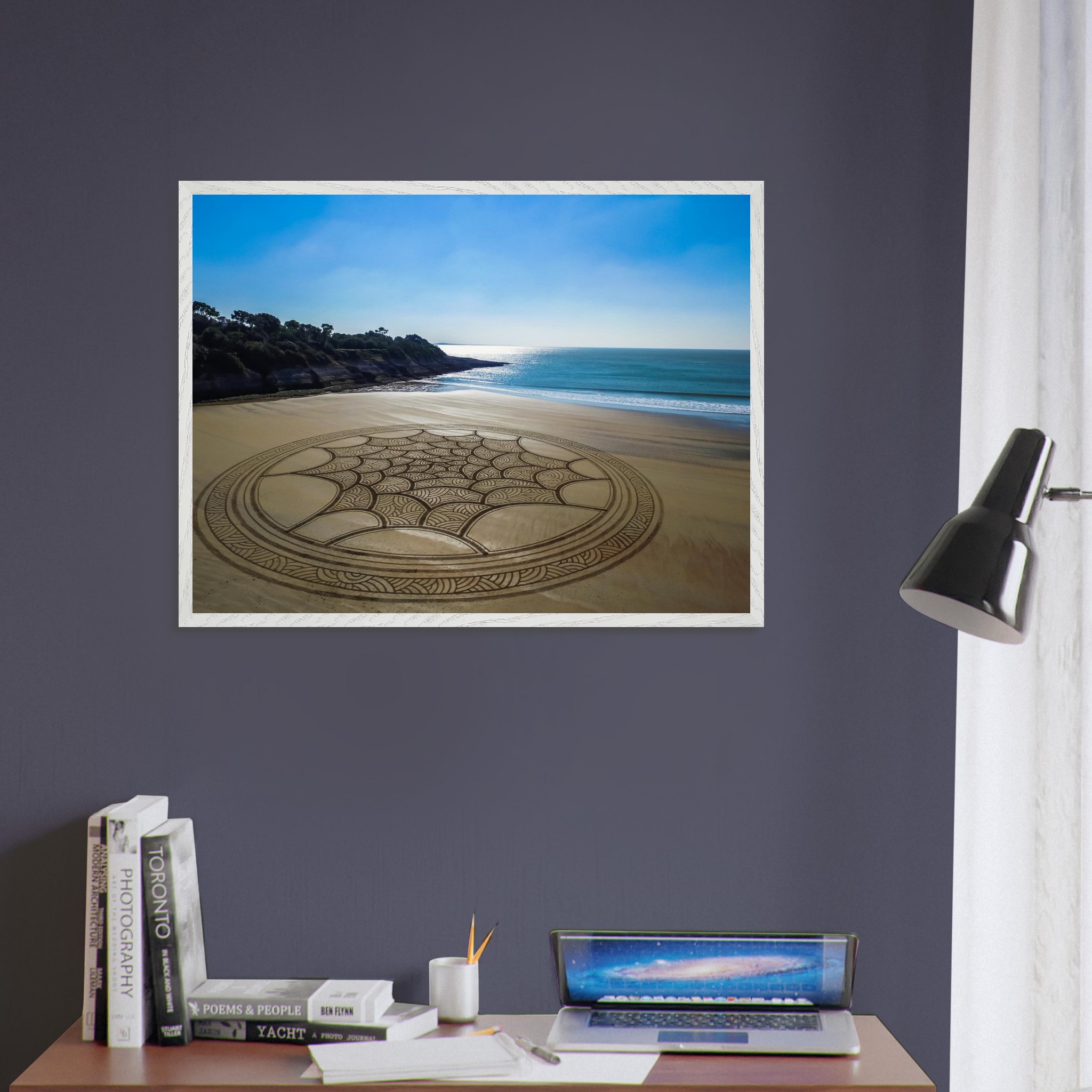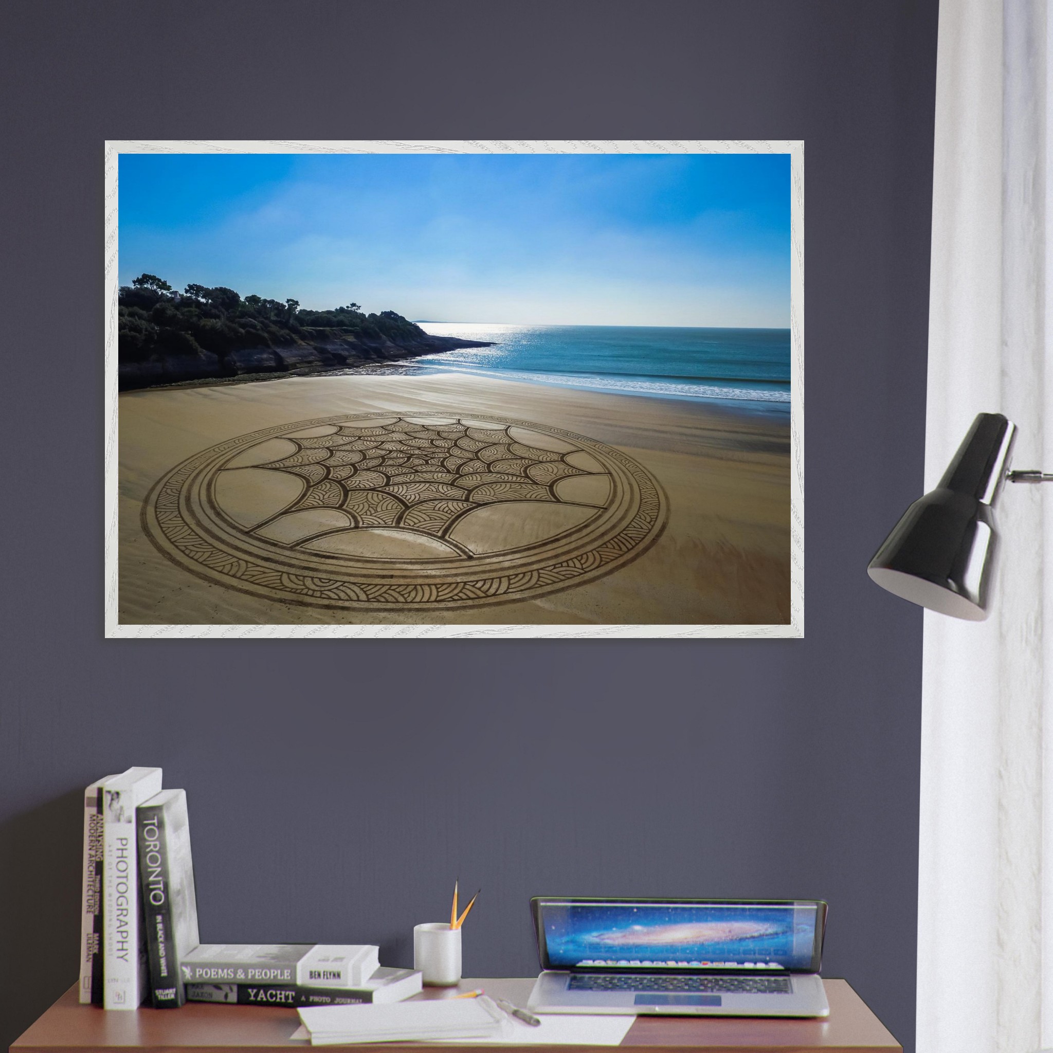 Une fresque mandala gravée sur la plage, alliant équilibre et harmonie.