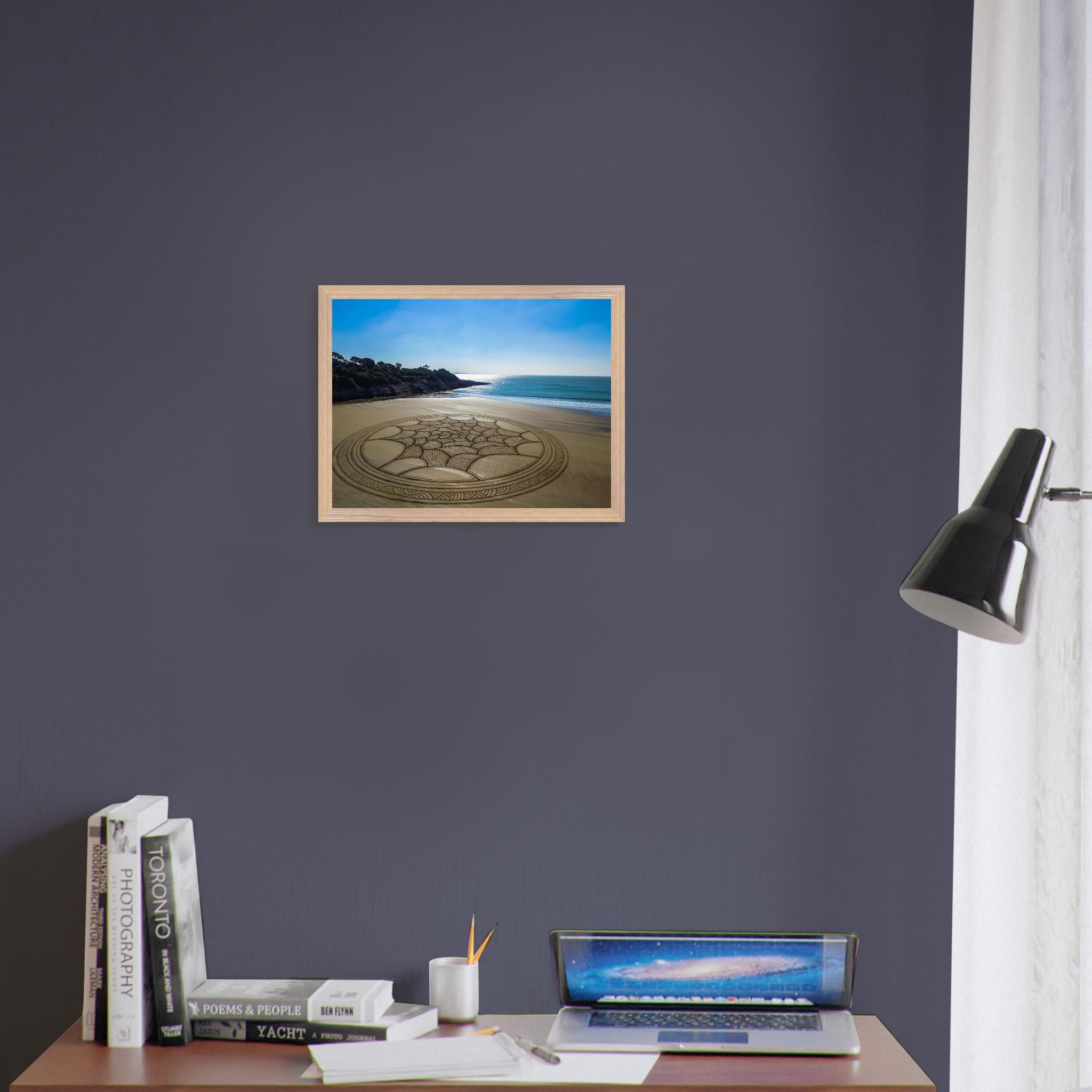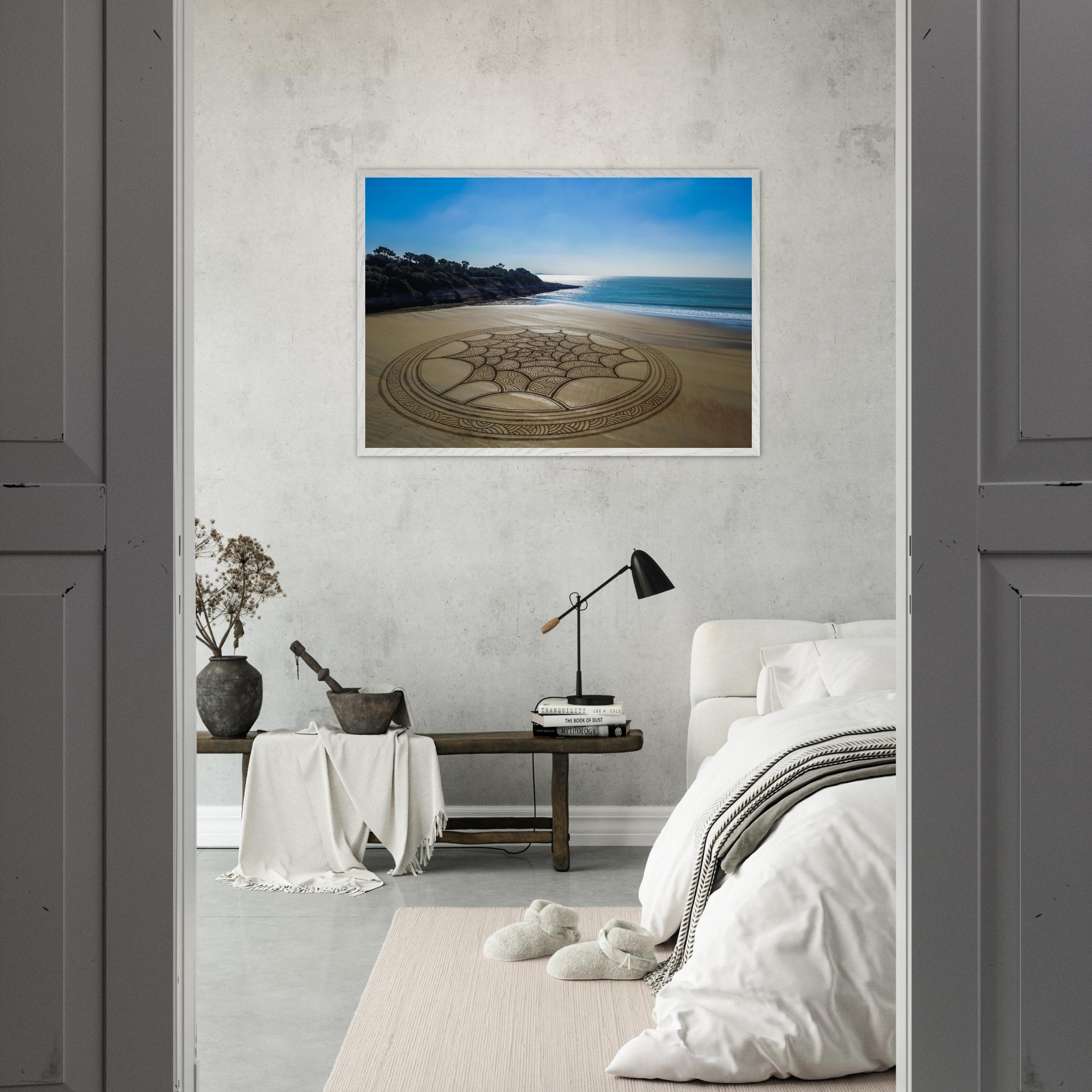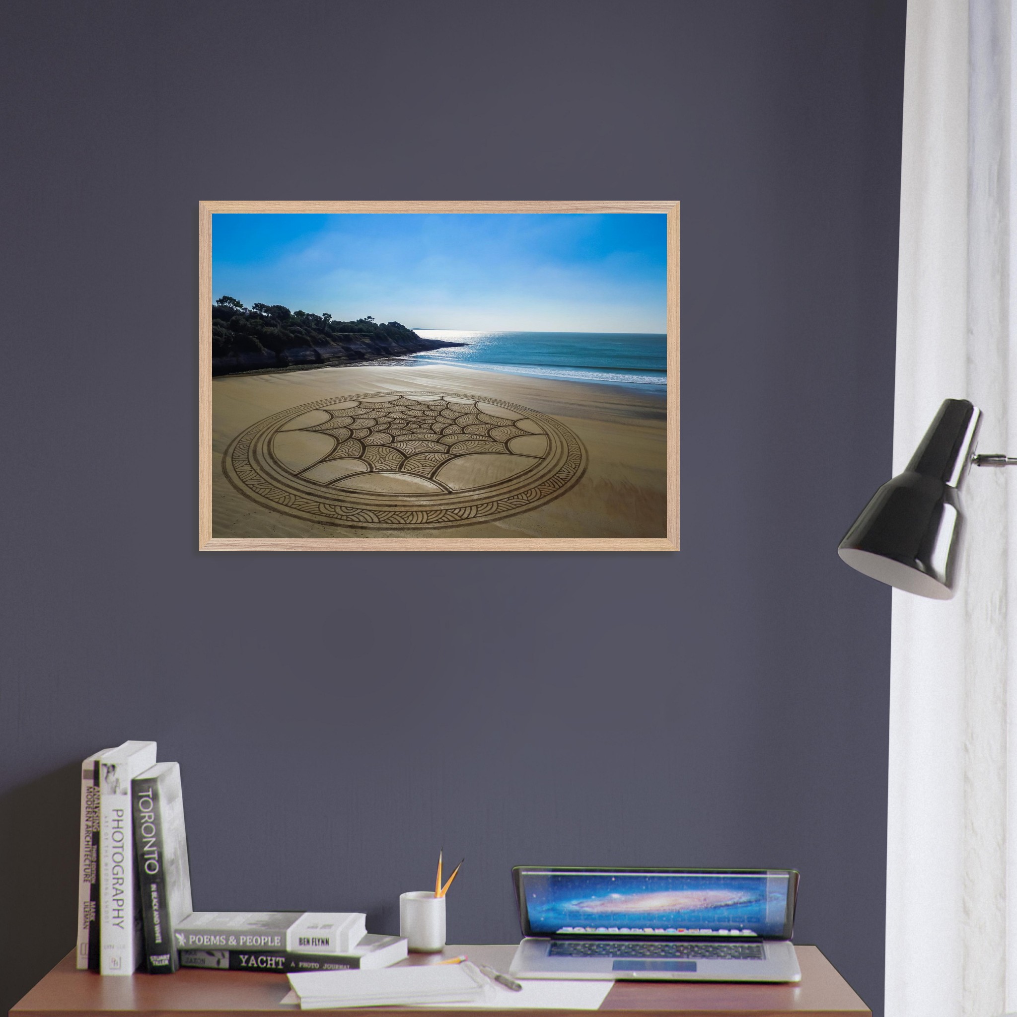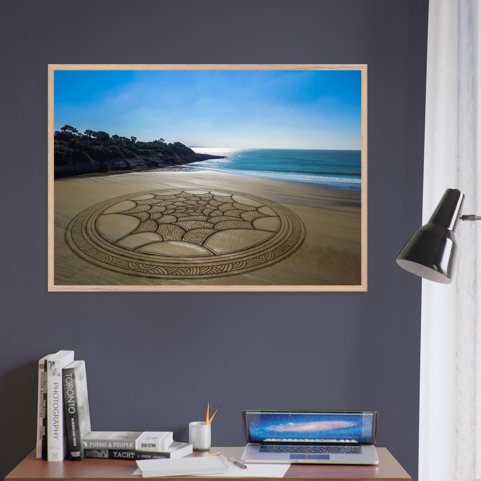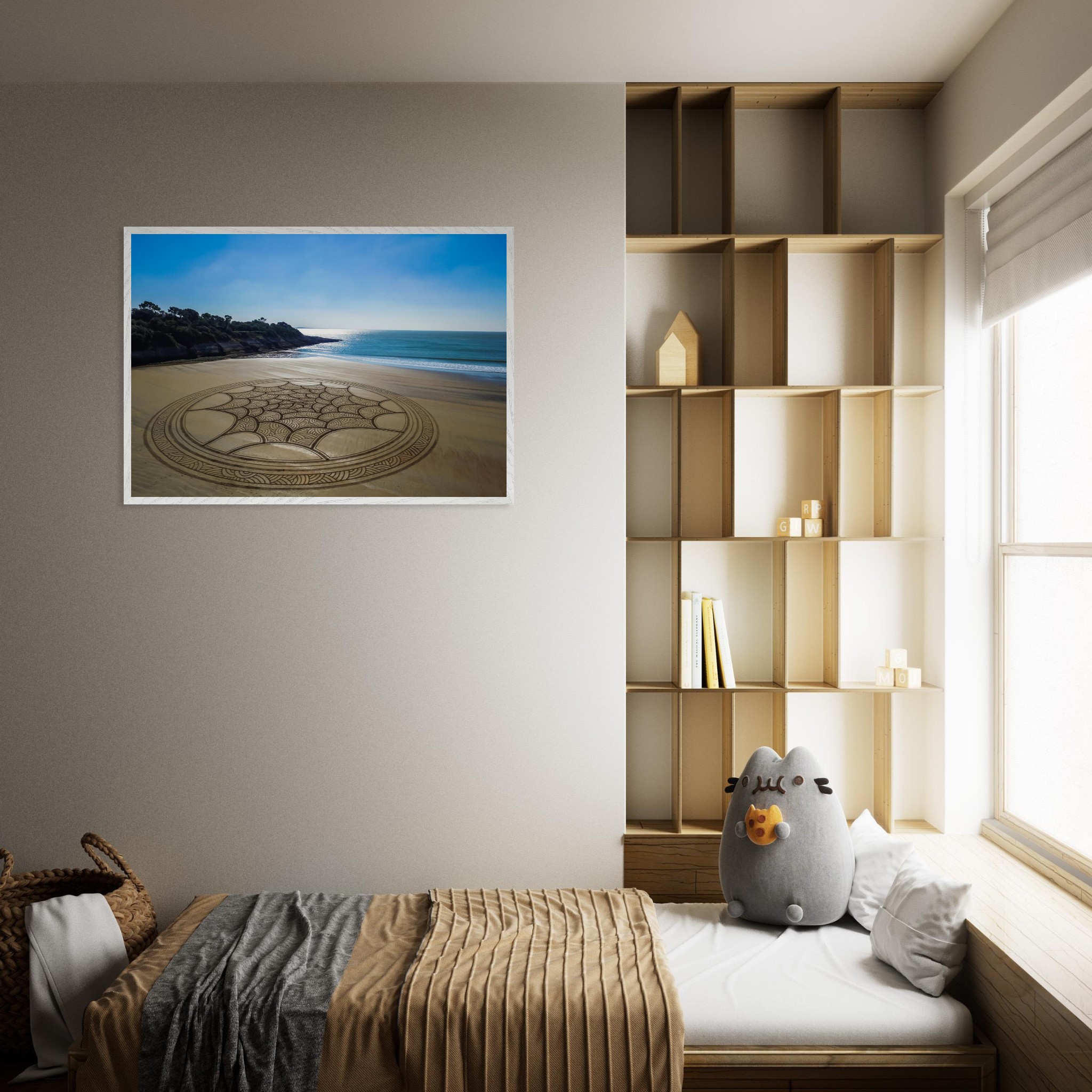 Une fresque mandala gravée sur la plage, alliant équilibre et harmonie.
