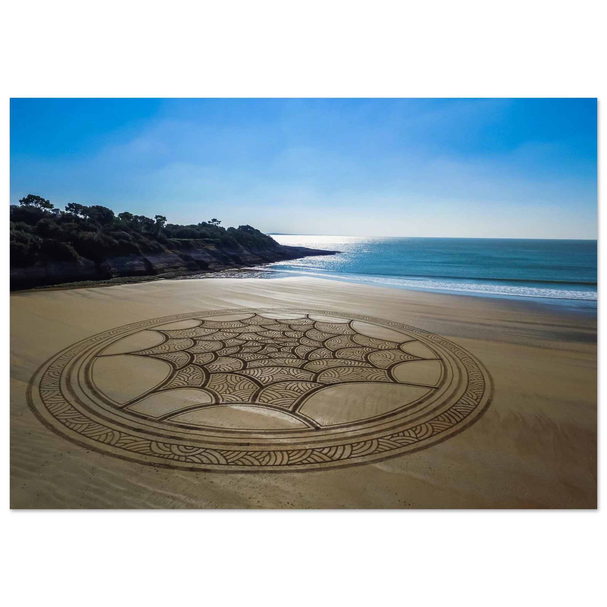 Un mandala géant tracé sur le sable, où cercles et motifs s’entrelacent en parfaite harmonie.