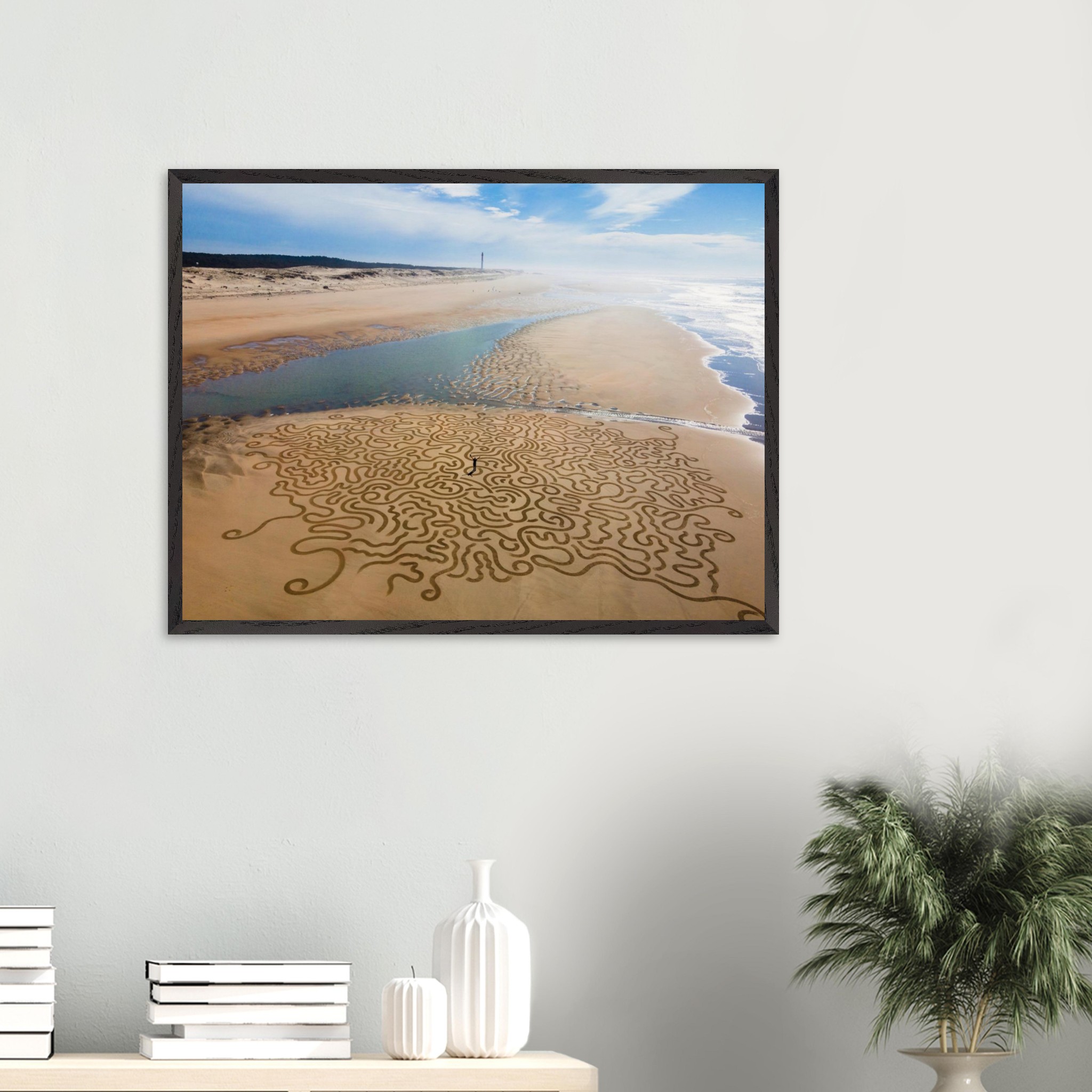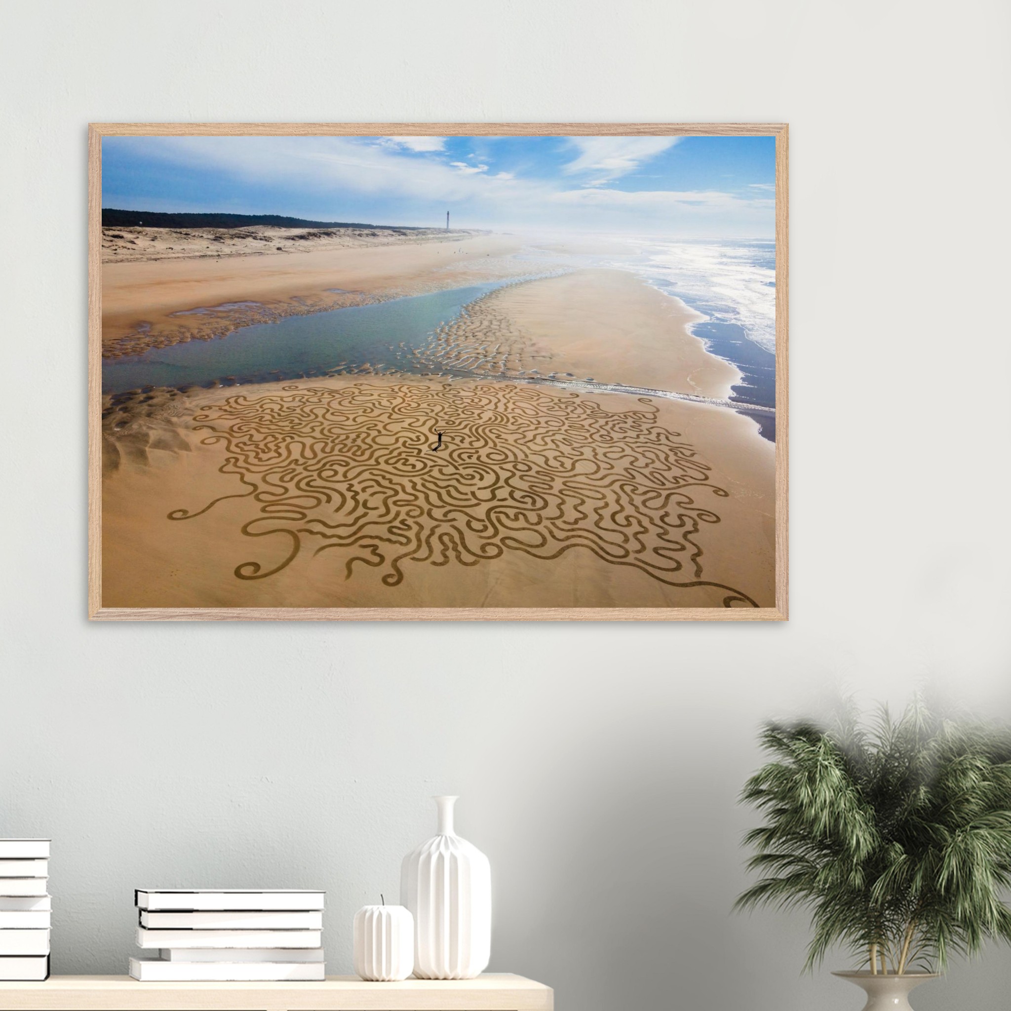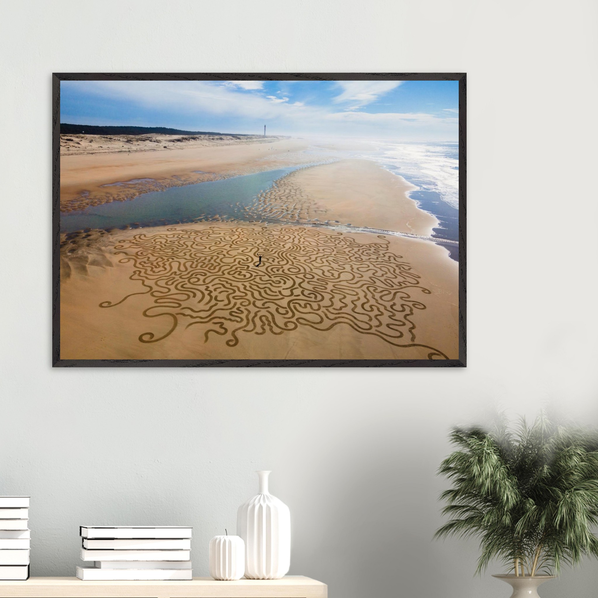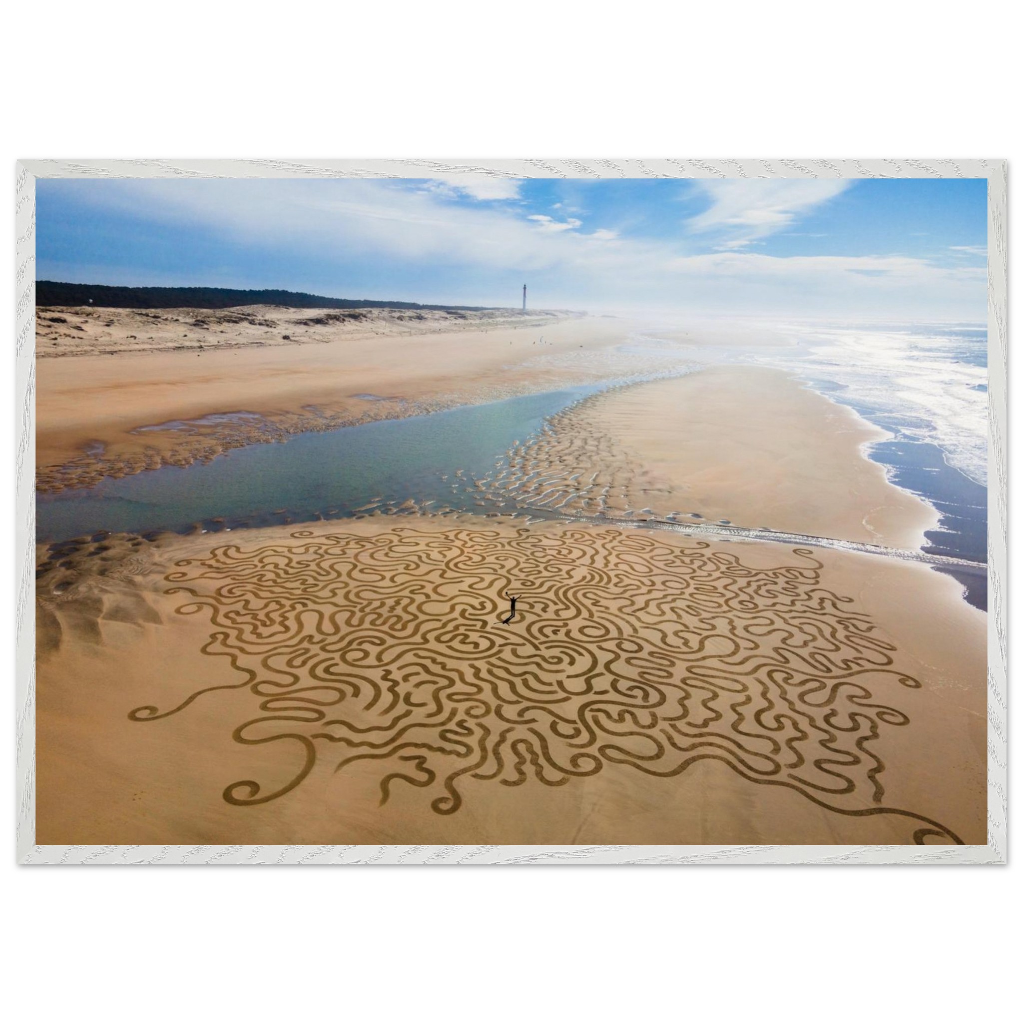 Ses arabesques tracées dans le sable se déploient sur une vaste plage, comme un réseau organique reliant terre et mer.
