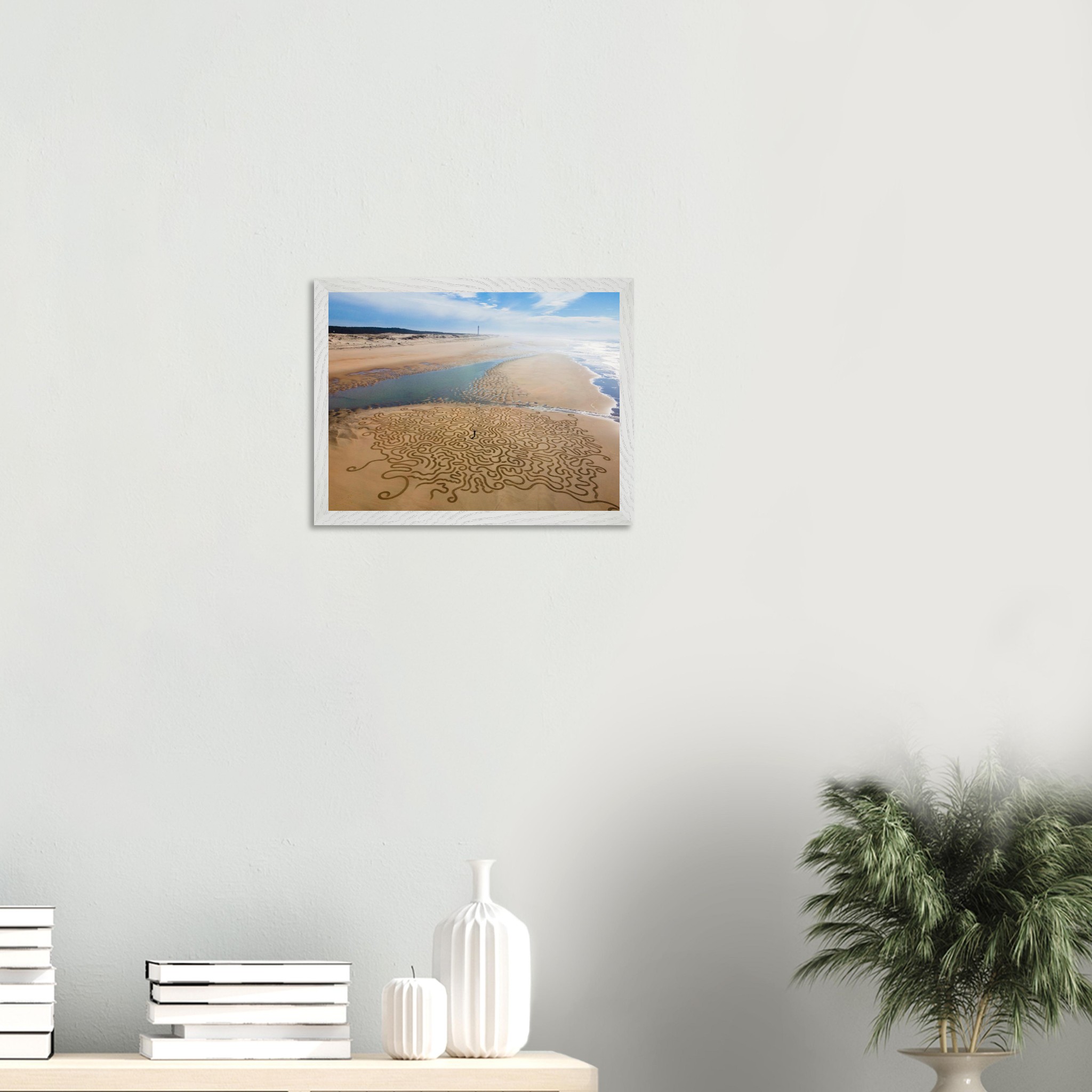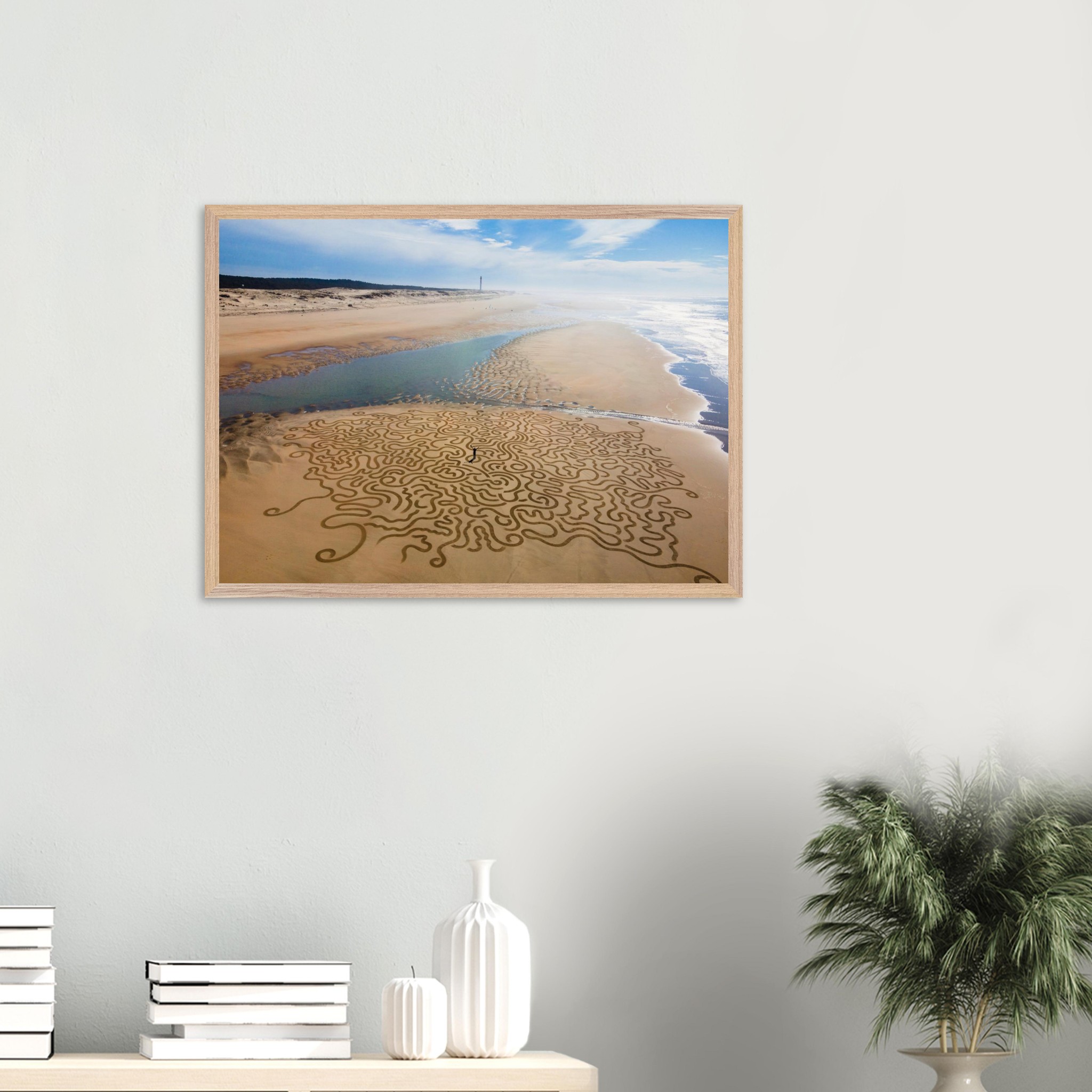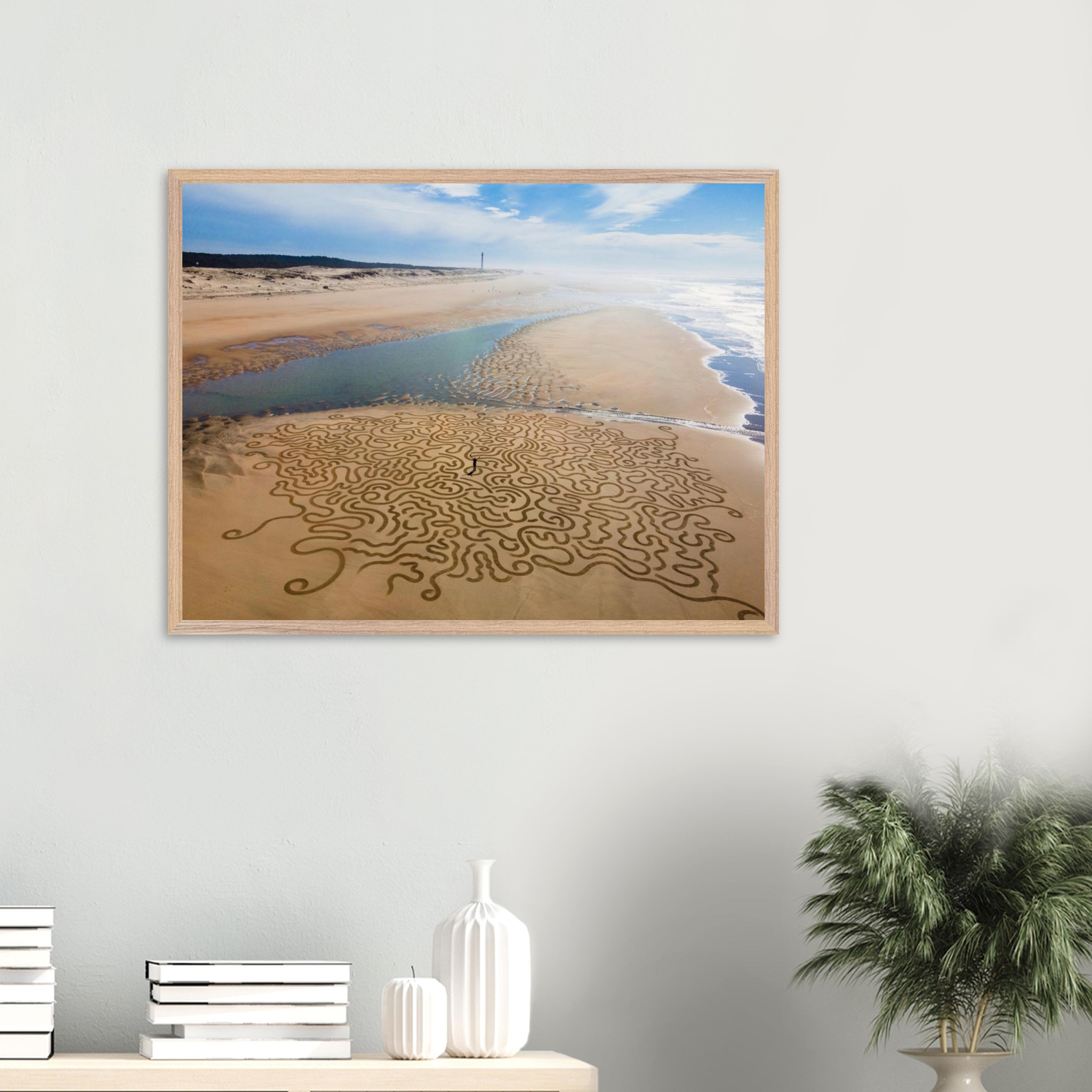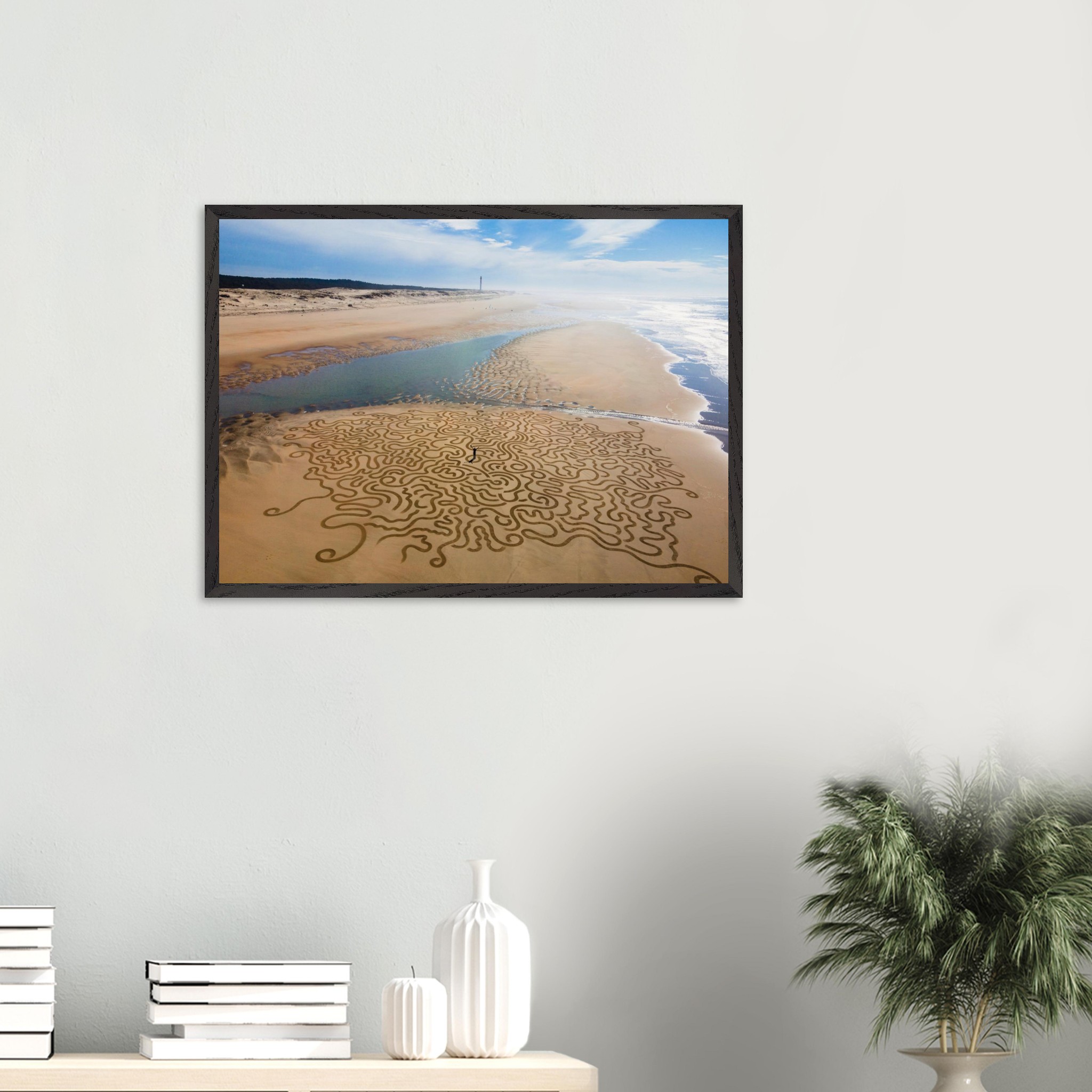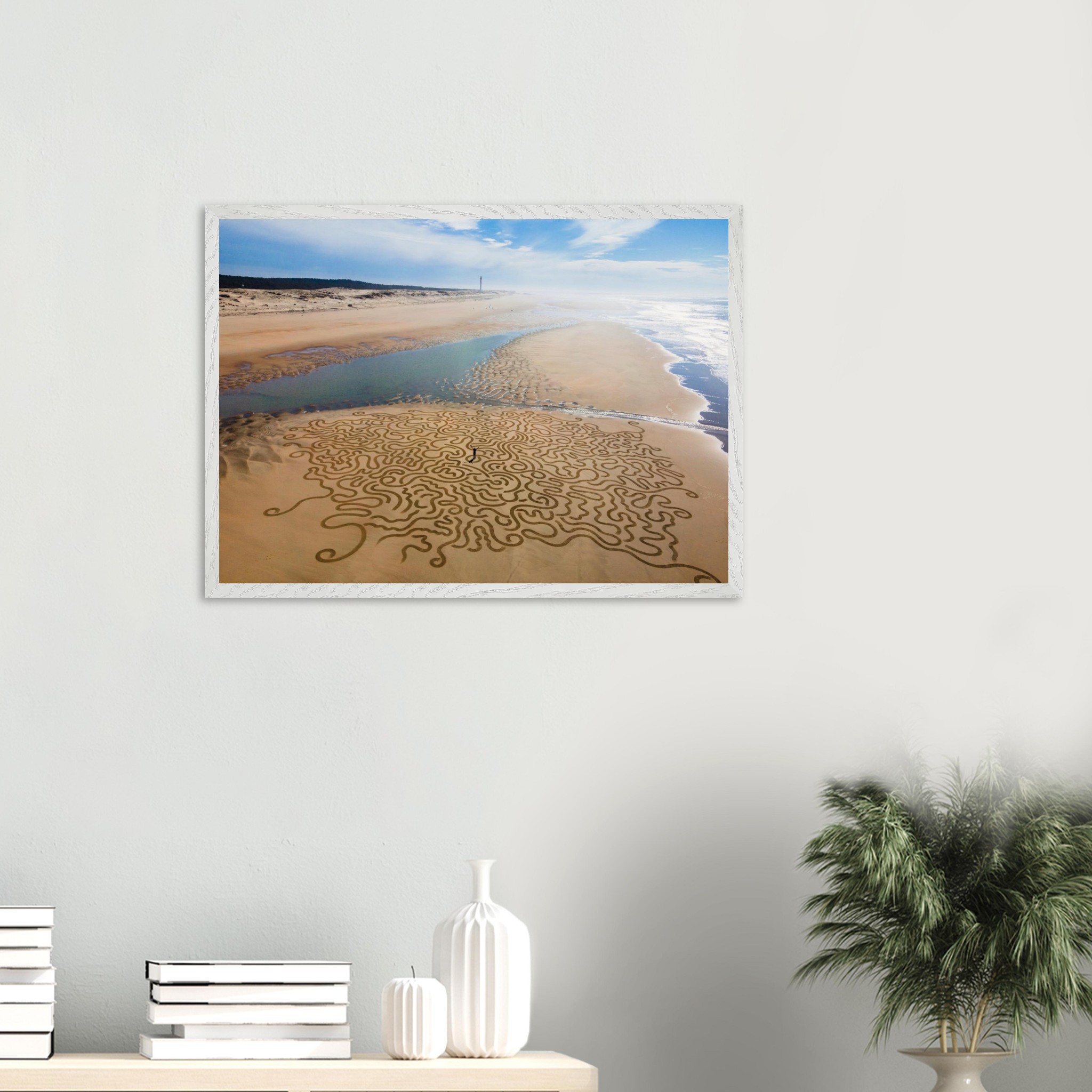 Ses arabesques tracées dans le sable se déploient sur une vaste plage, comme un réseau organique reliant terre et mer.