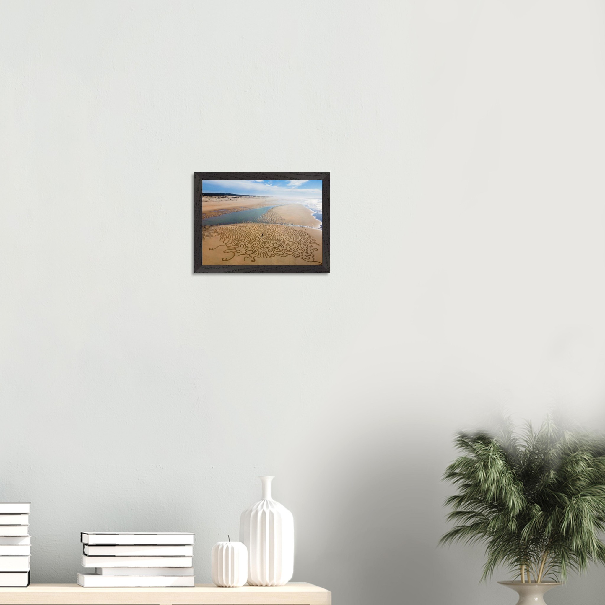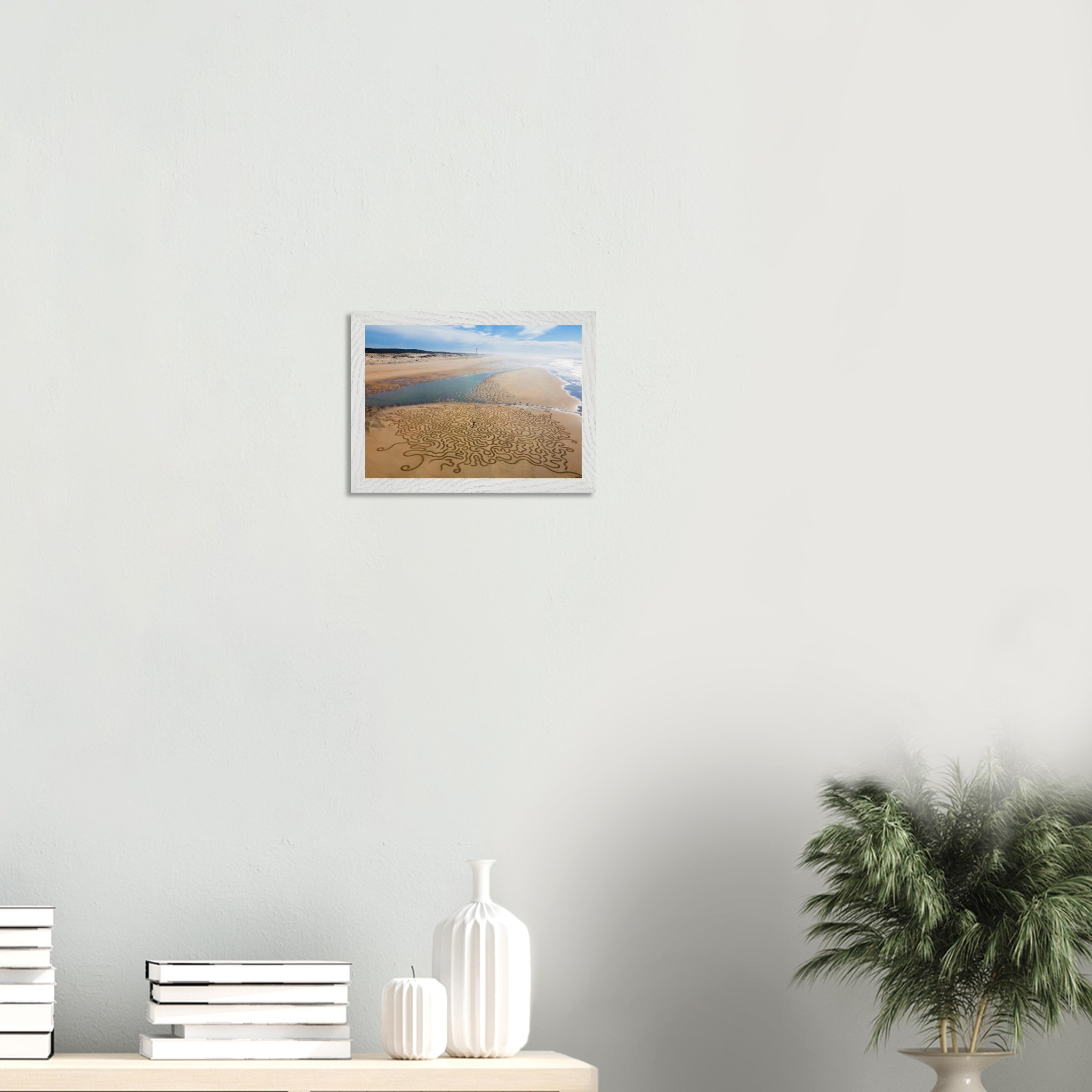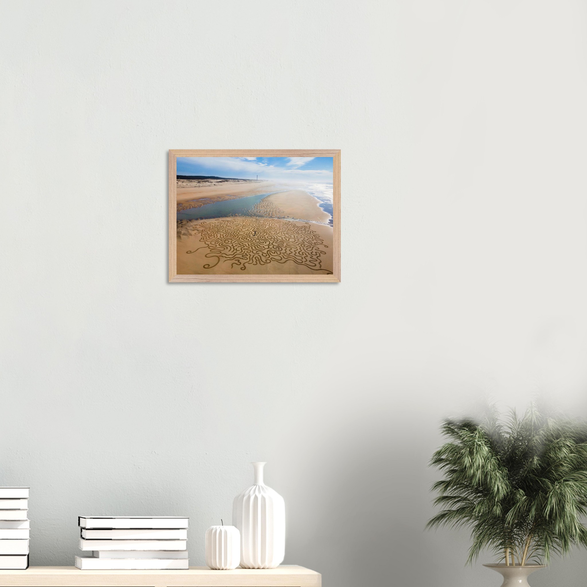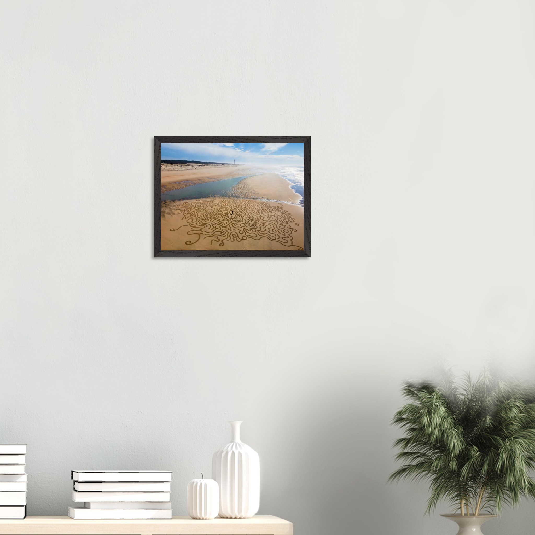 Ses arabesques tracées dans le sable se déploient sur une vaste plage, comme un réseau organique reliant terre et mer.