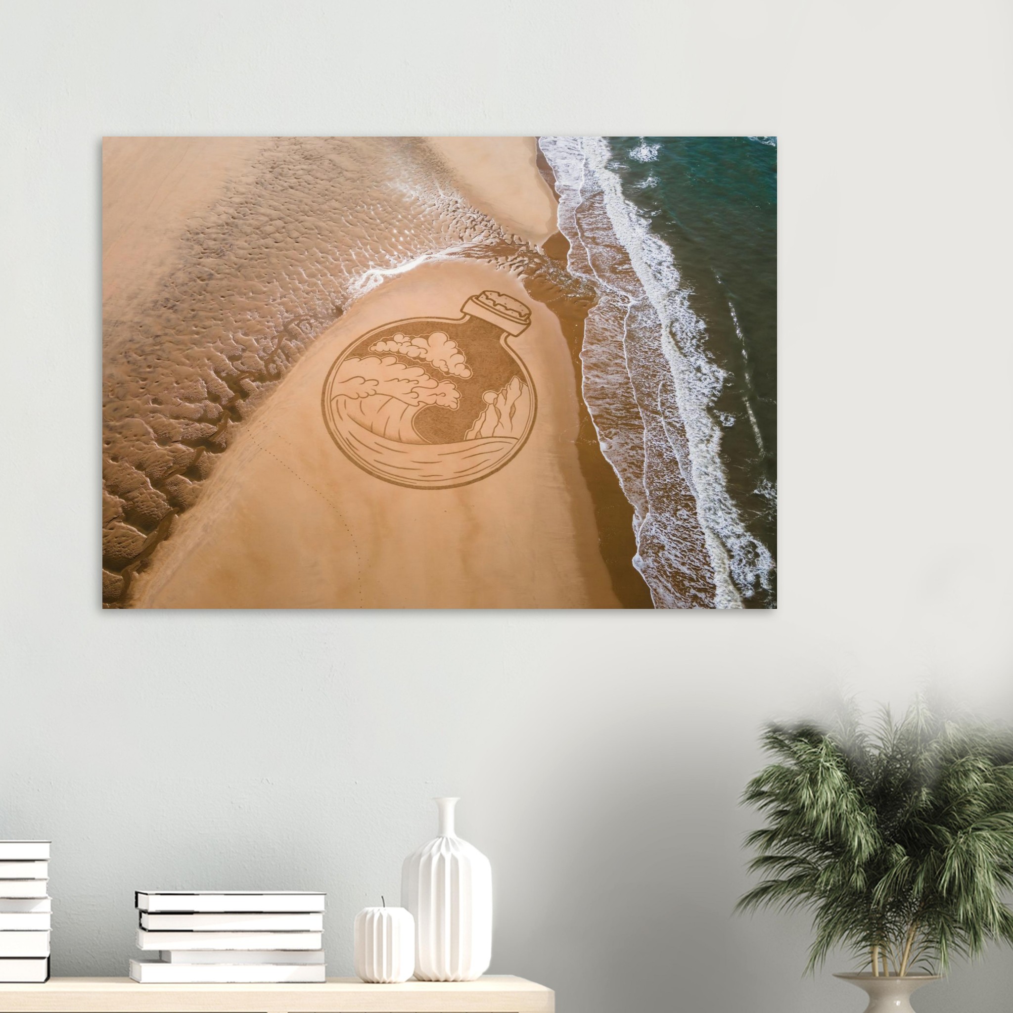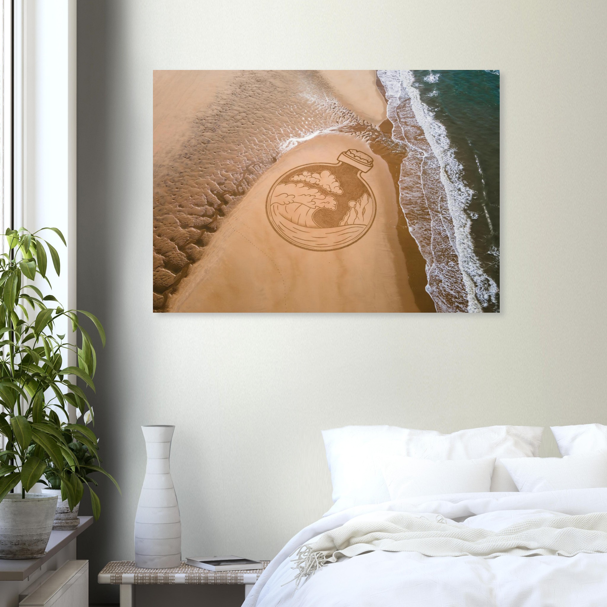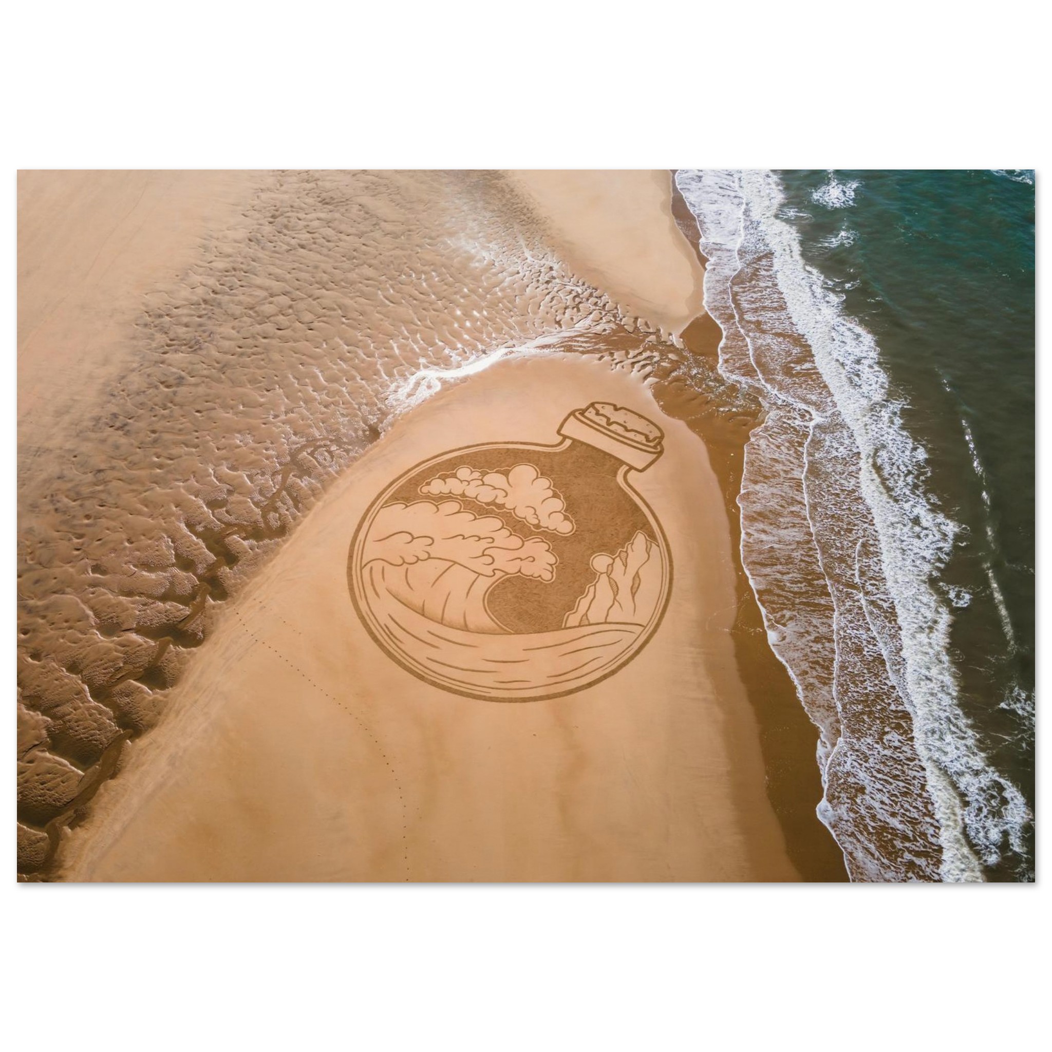 Un océan capturé dans une bouteille géante dessinée sur le sable.