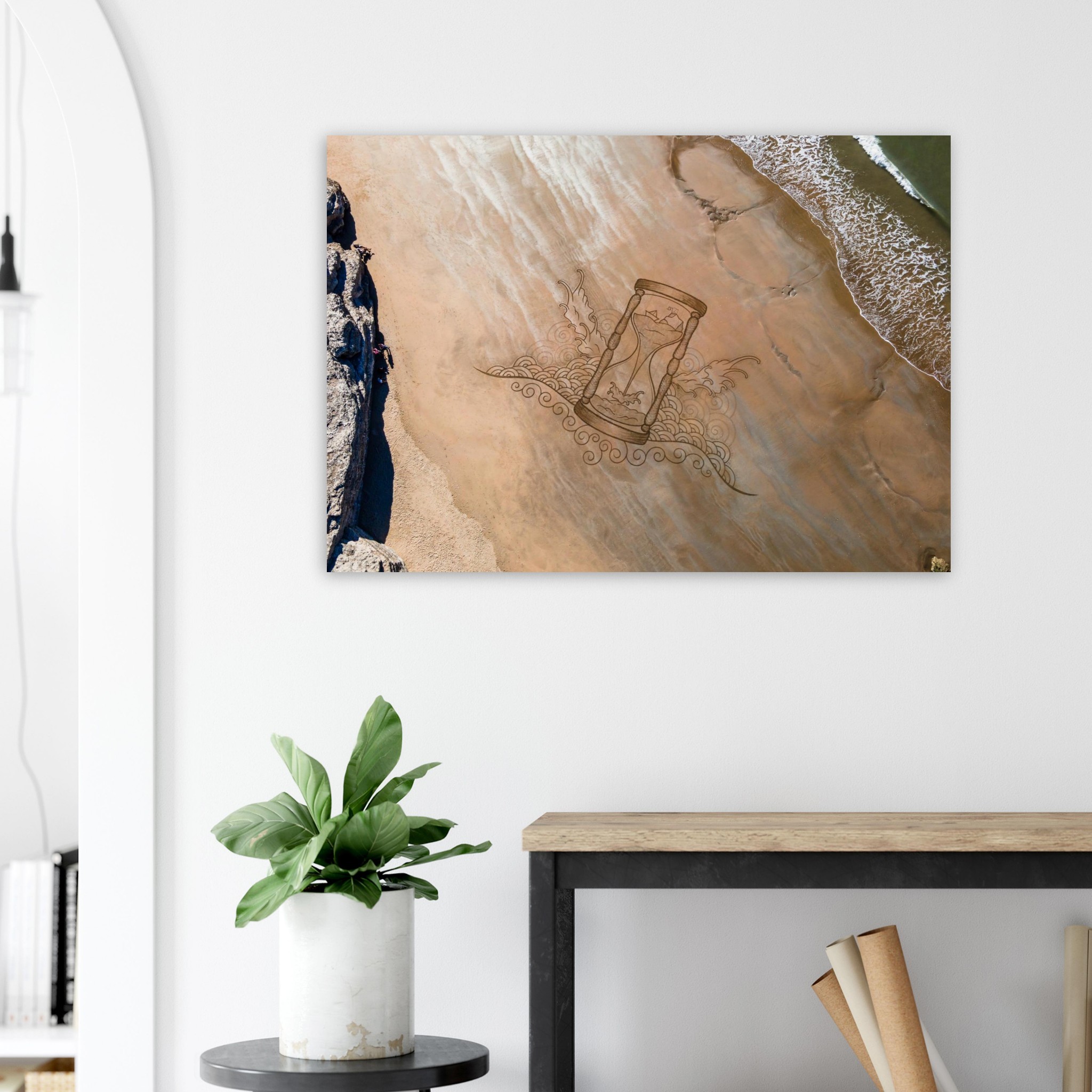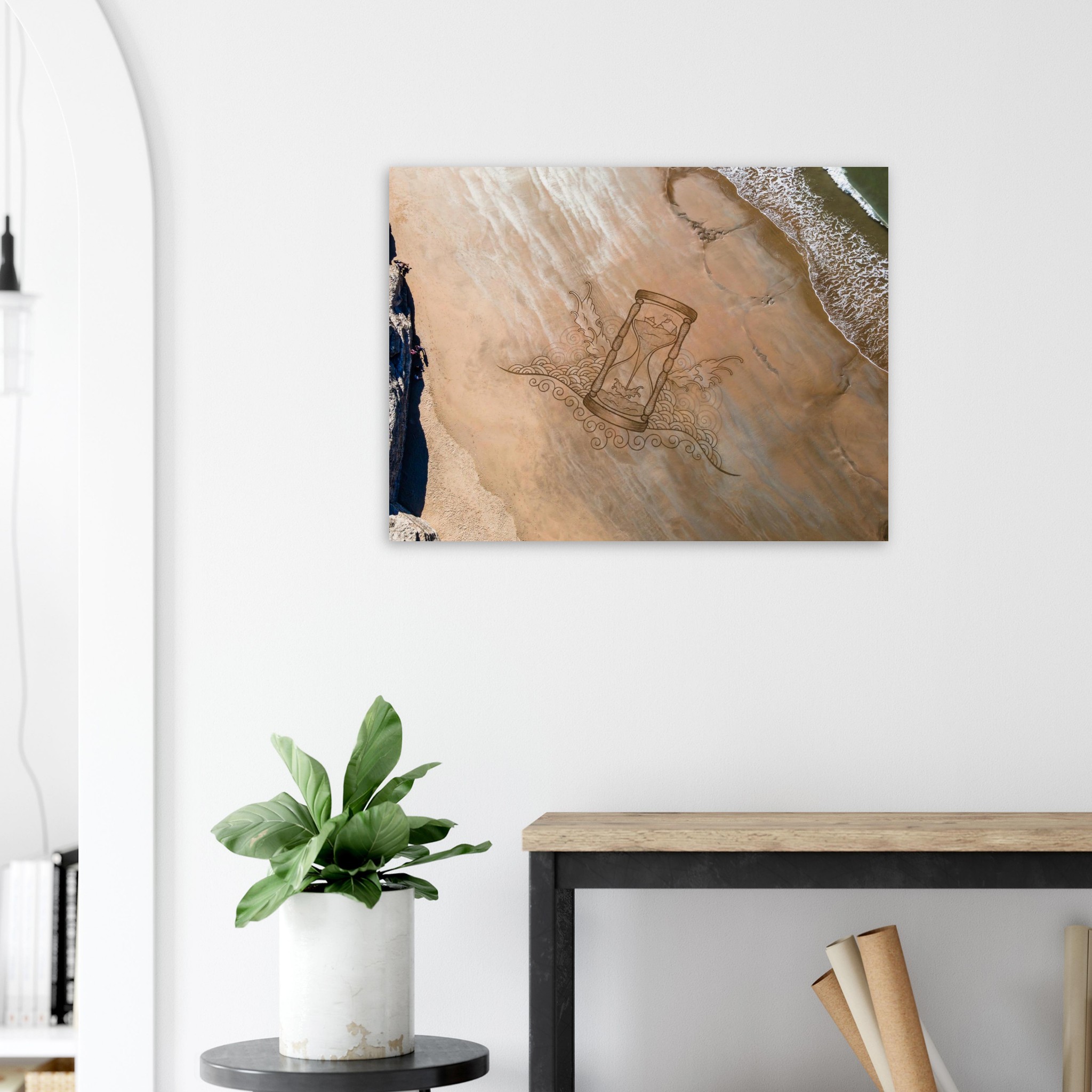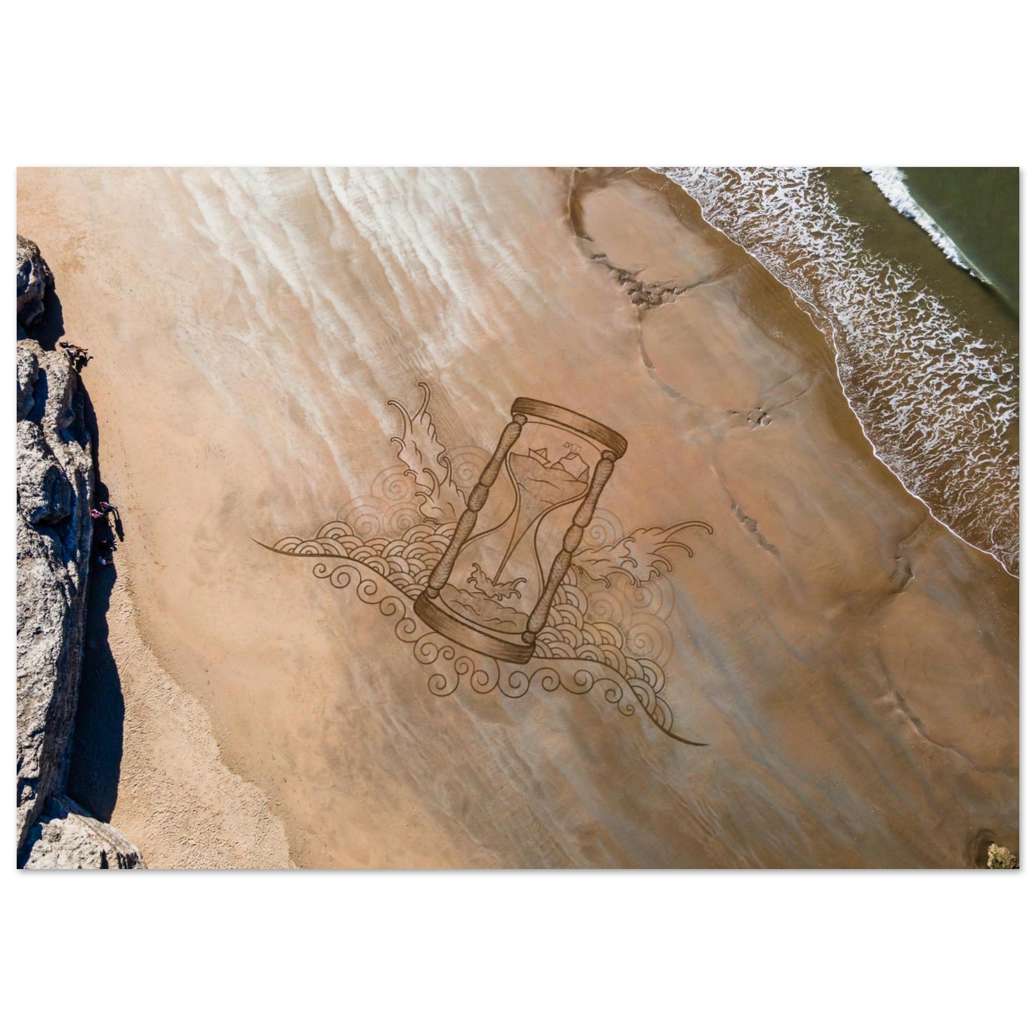 Un sablier monumental tracé sur le sable, symbole du temps qui s’écoule et de la fragilité de la planète.