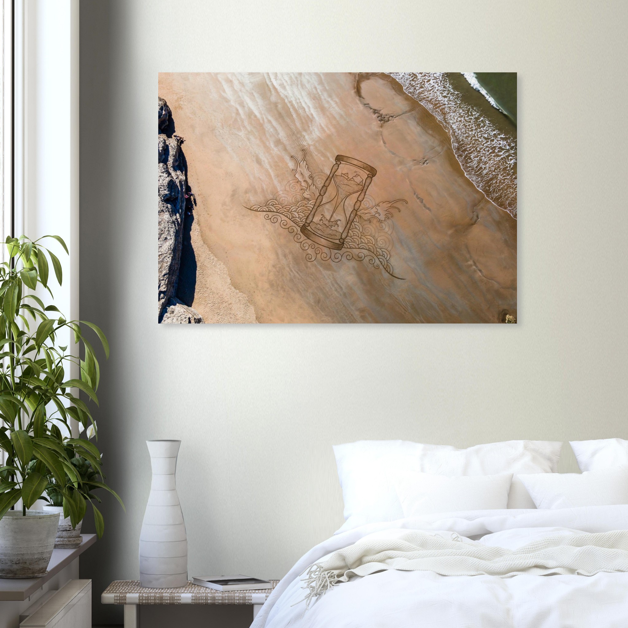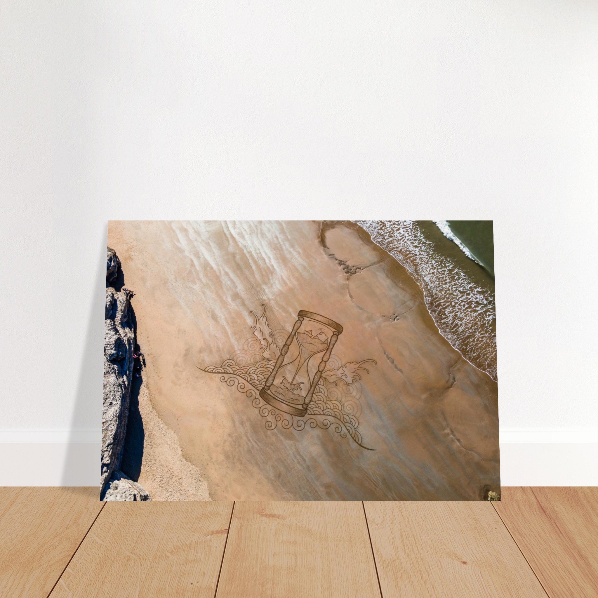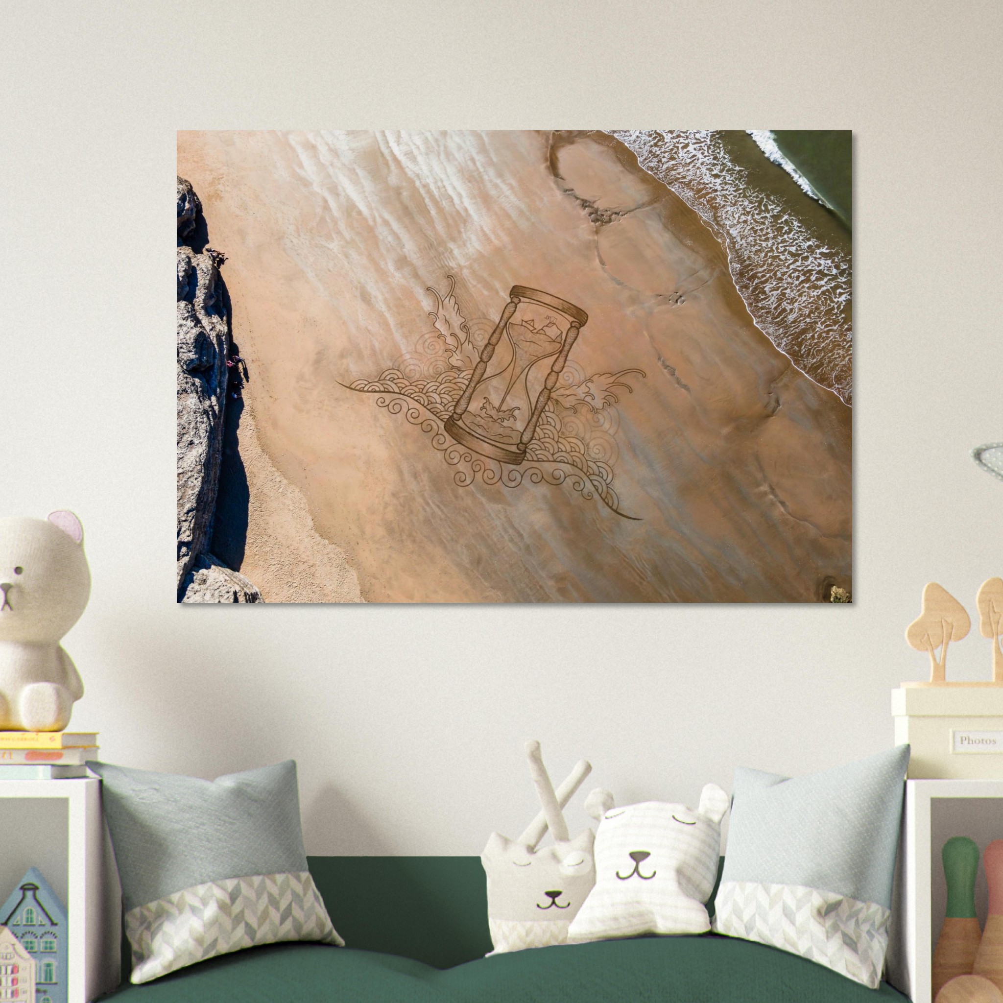 Un sablier monumental tracé sur le sable, symbole du temps qui s’écoule et de la fragilité de la planète.