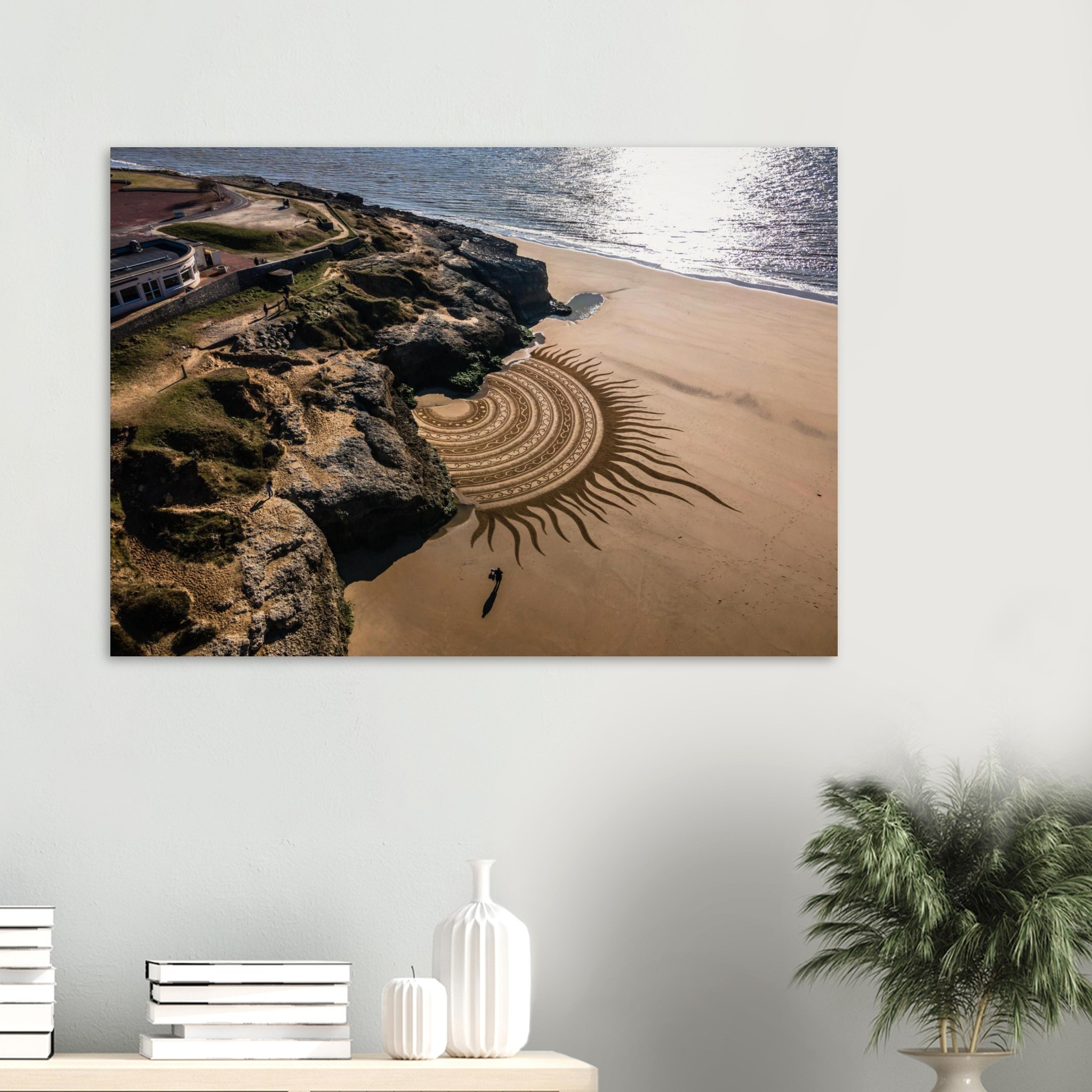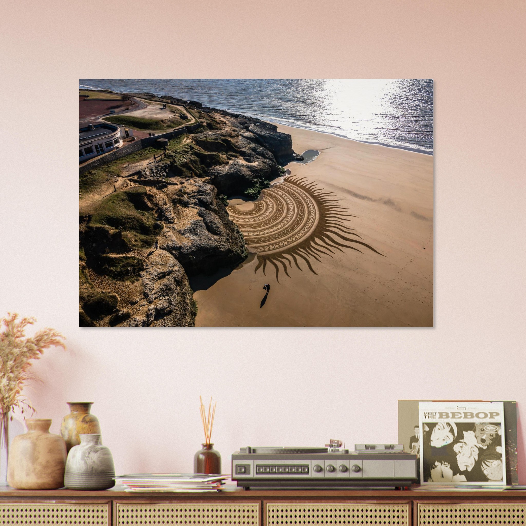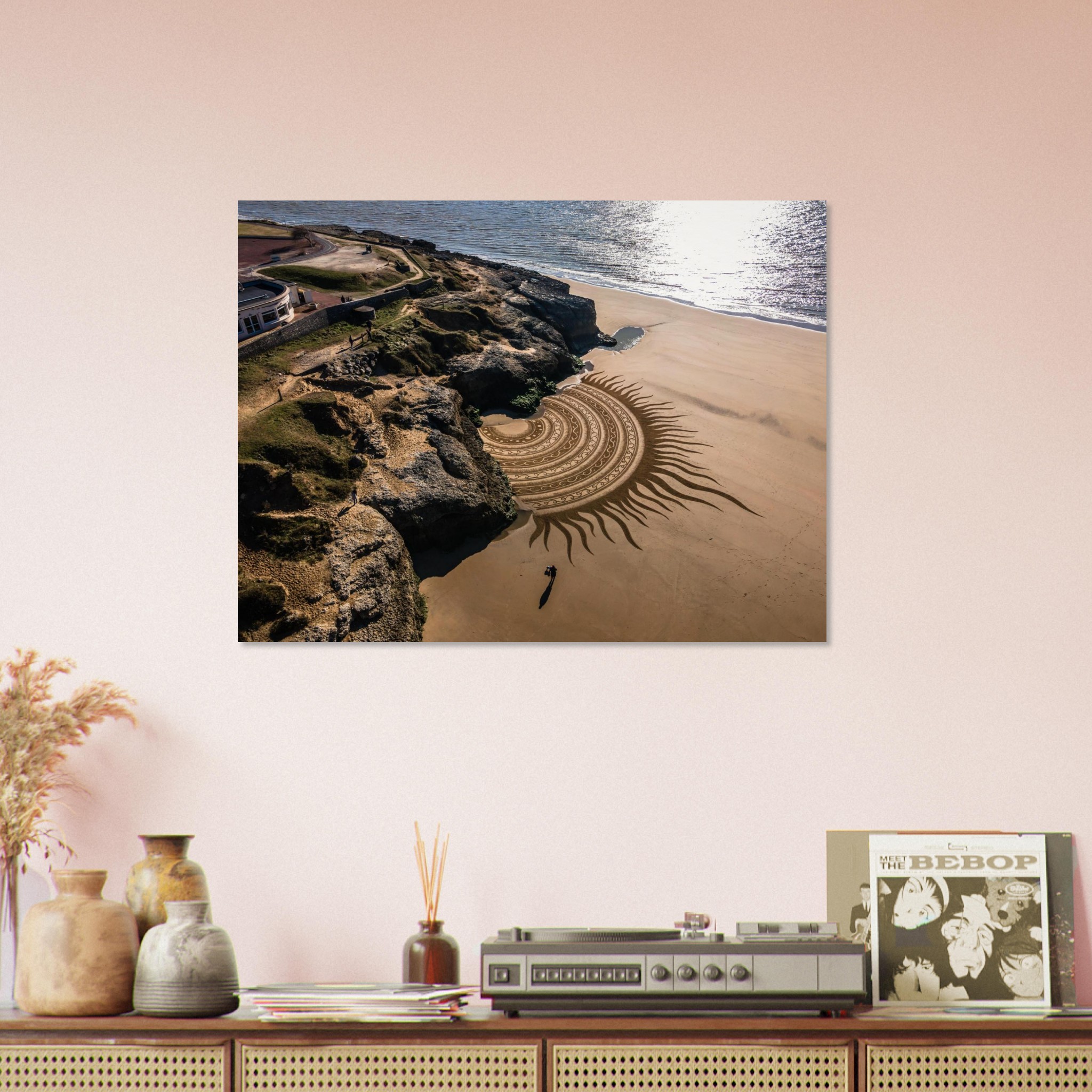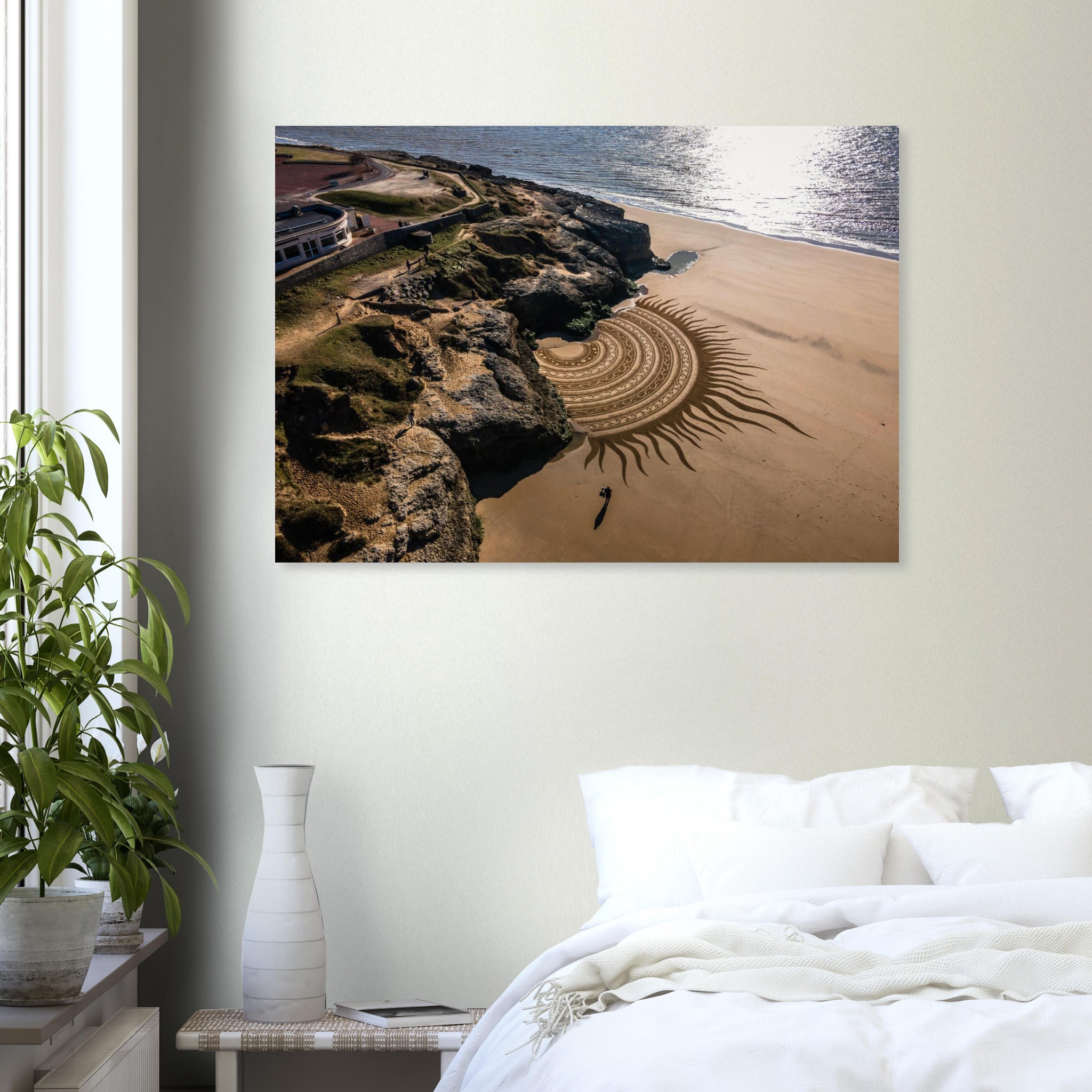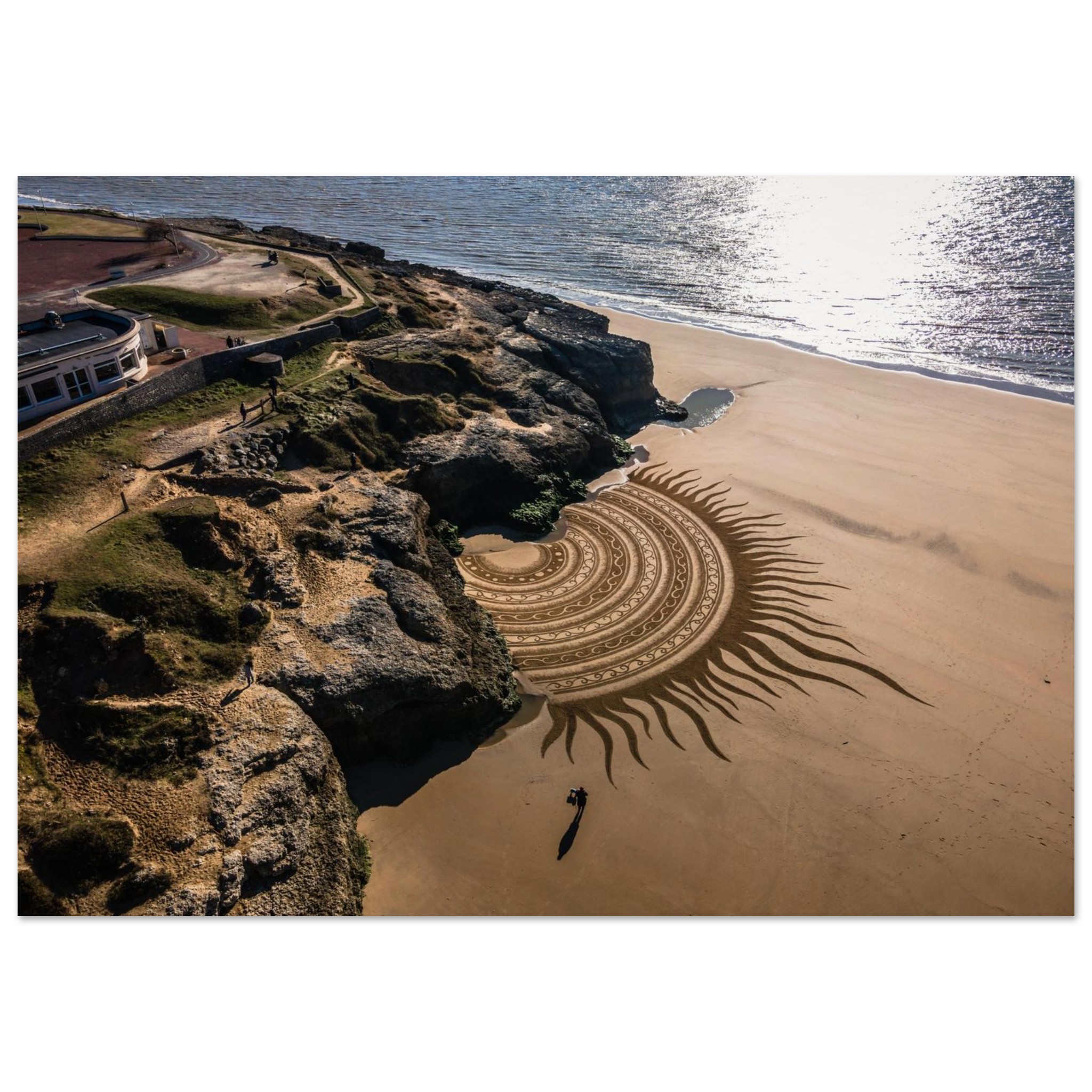 Au creux d’une plage encadrée par des falaises abruptes, un mandala immense s’épanouit comme un soleil, ses rayons s’étendant sur le sable jusqu’à se fondre dans la mer.