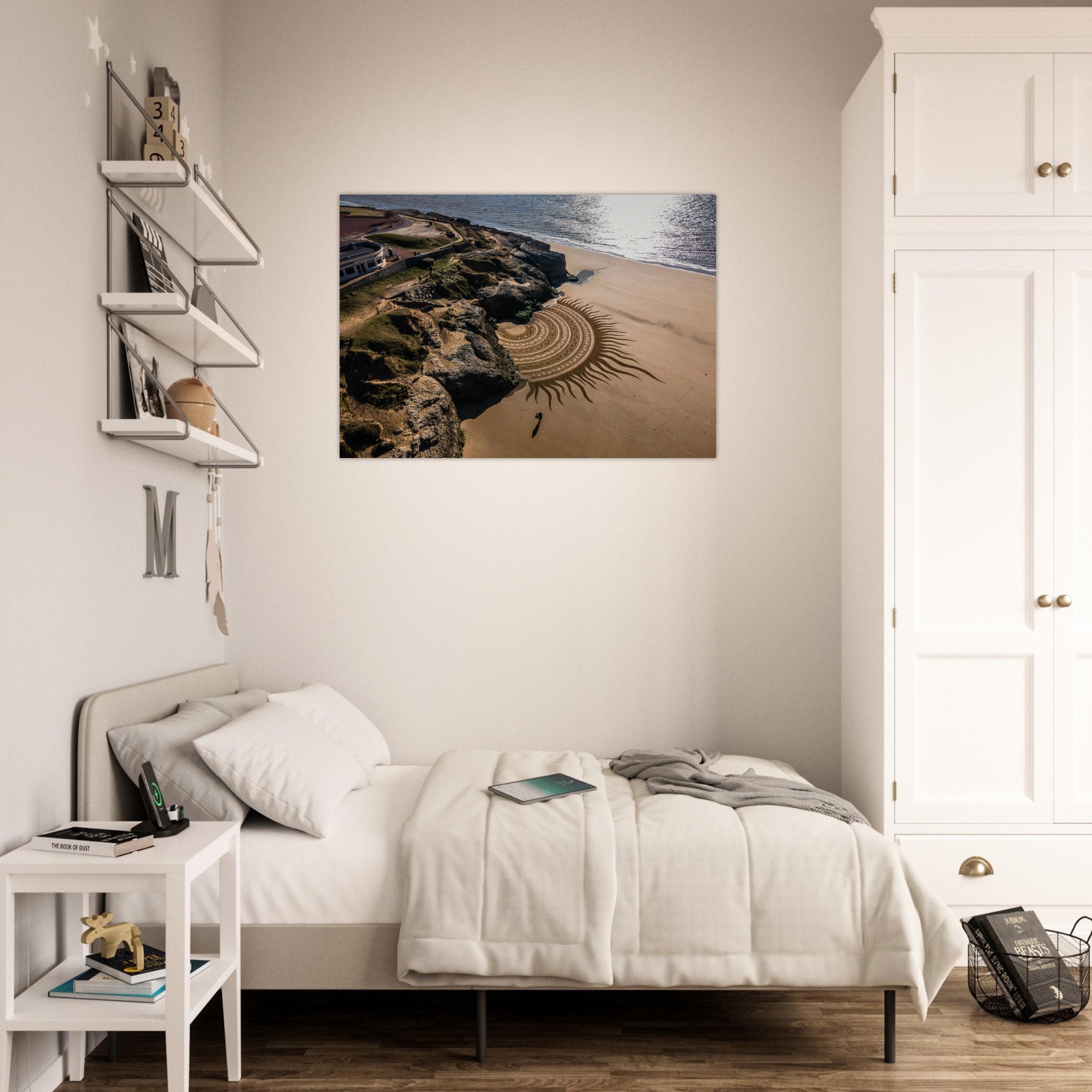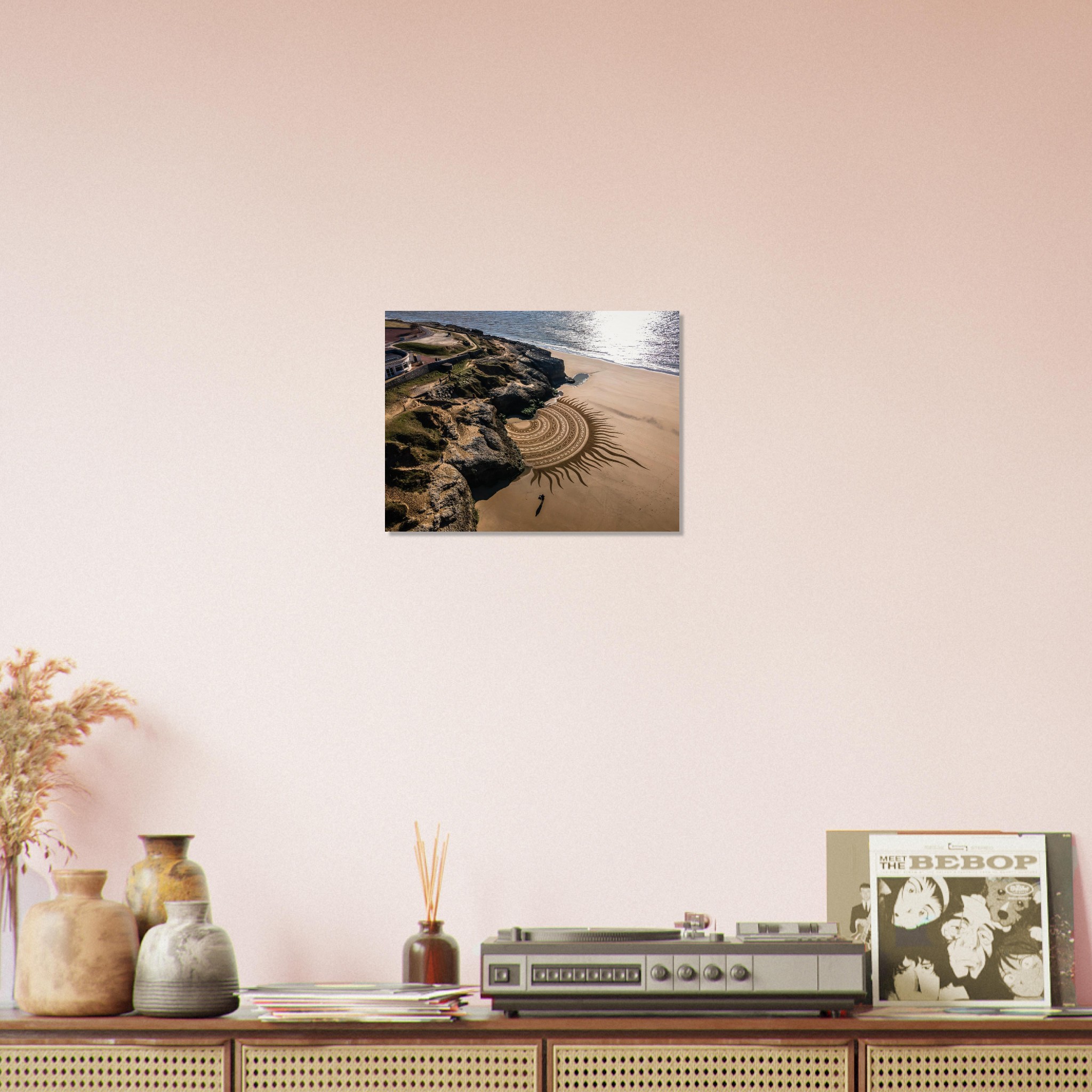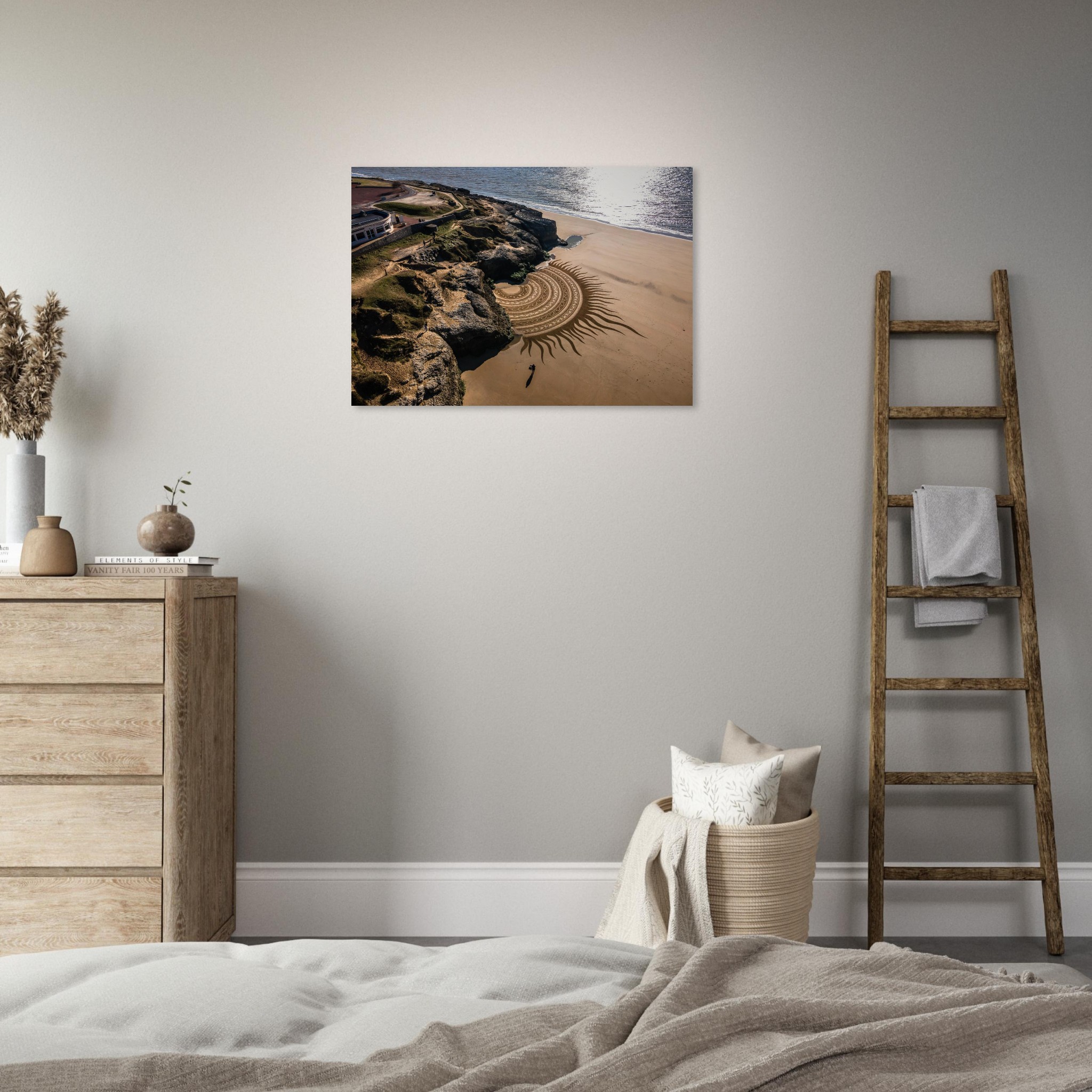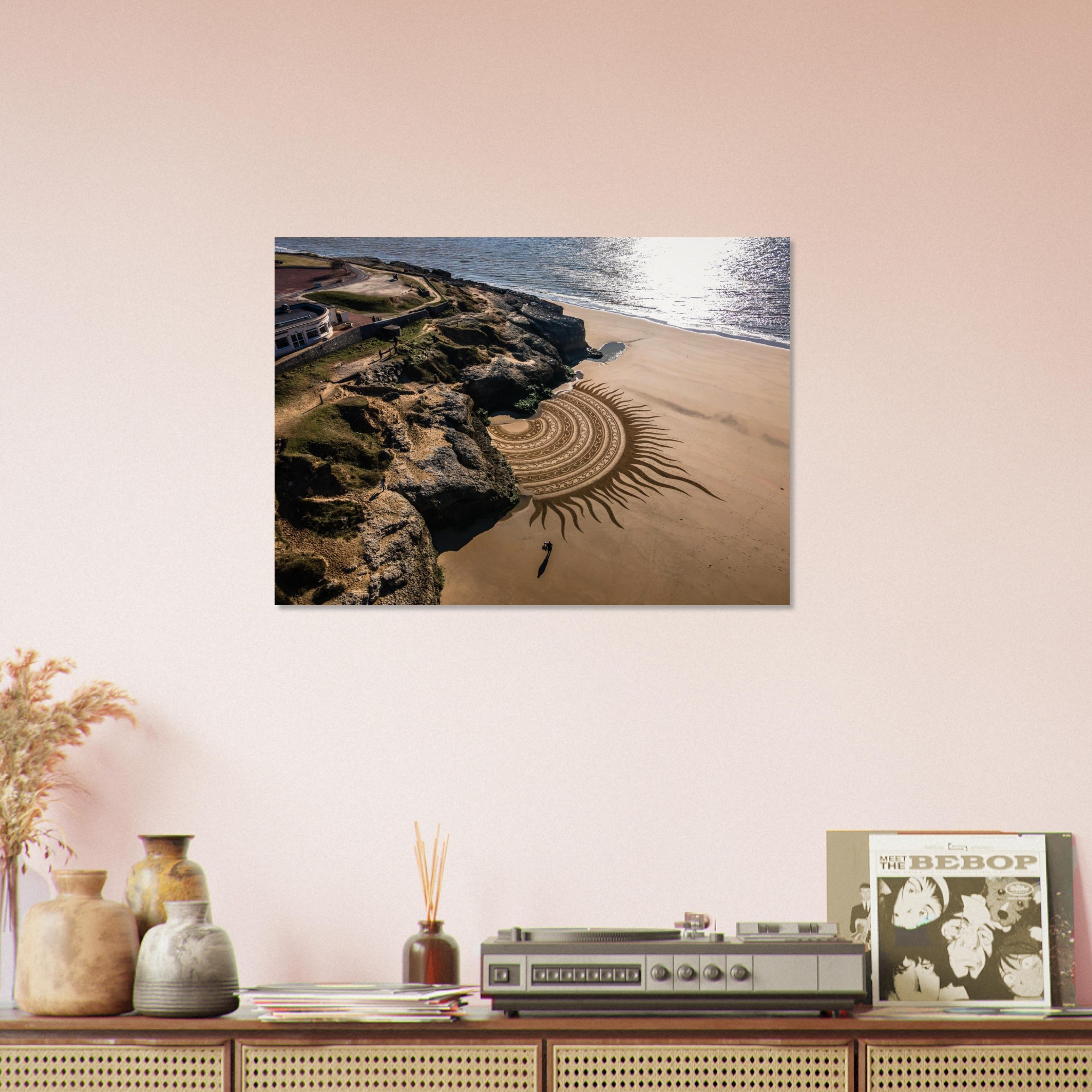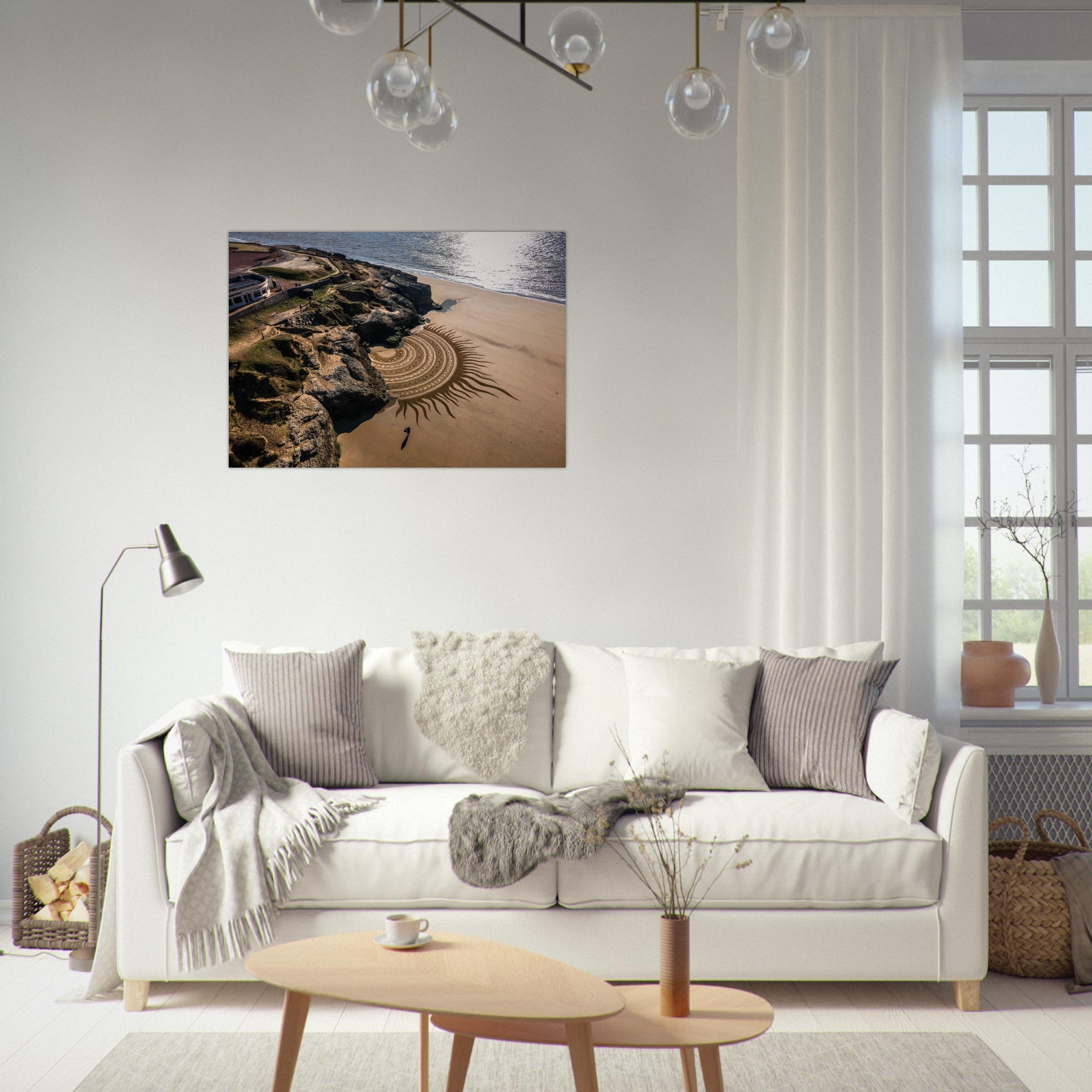 Au creux d’une plage encadrée par des falaises abruptes, un mandala immense s’épanouit comme un soleil, ses rayons s’étendant sur le sable jusqu’à se fondre dans la mer.