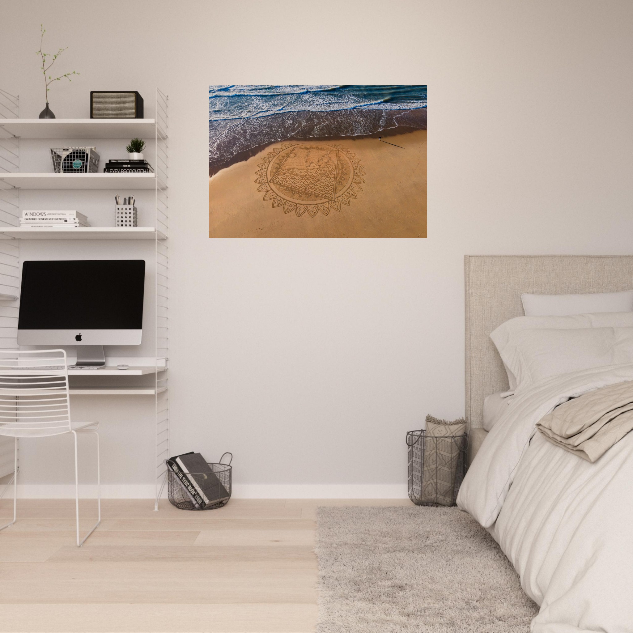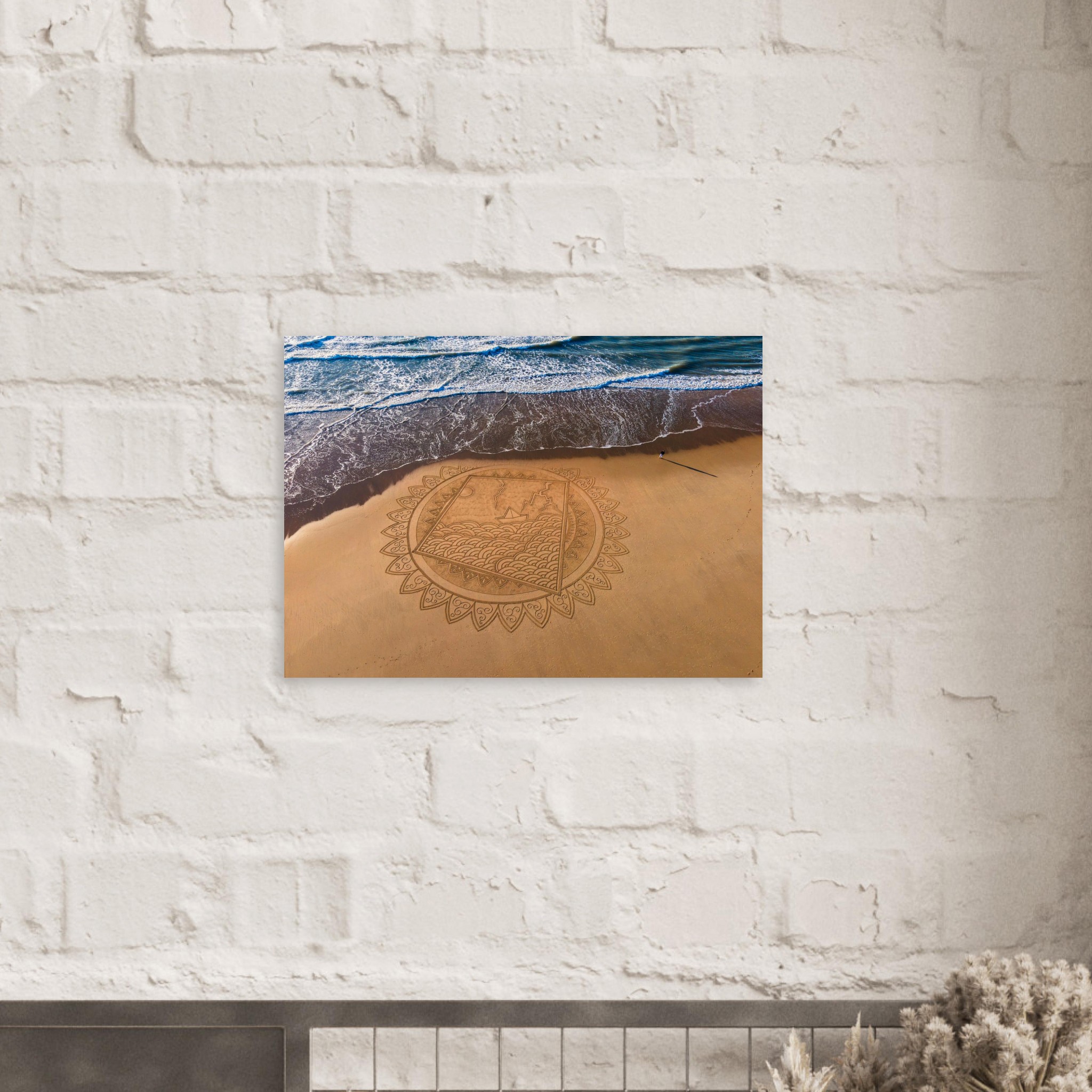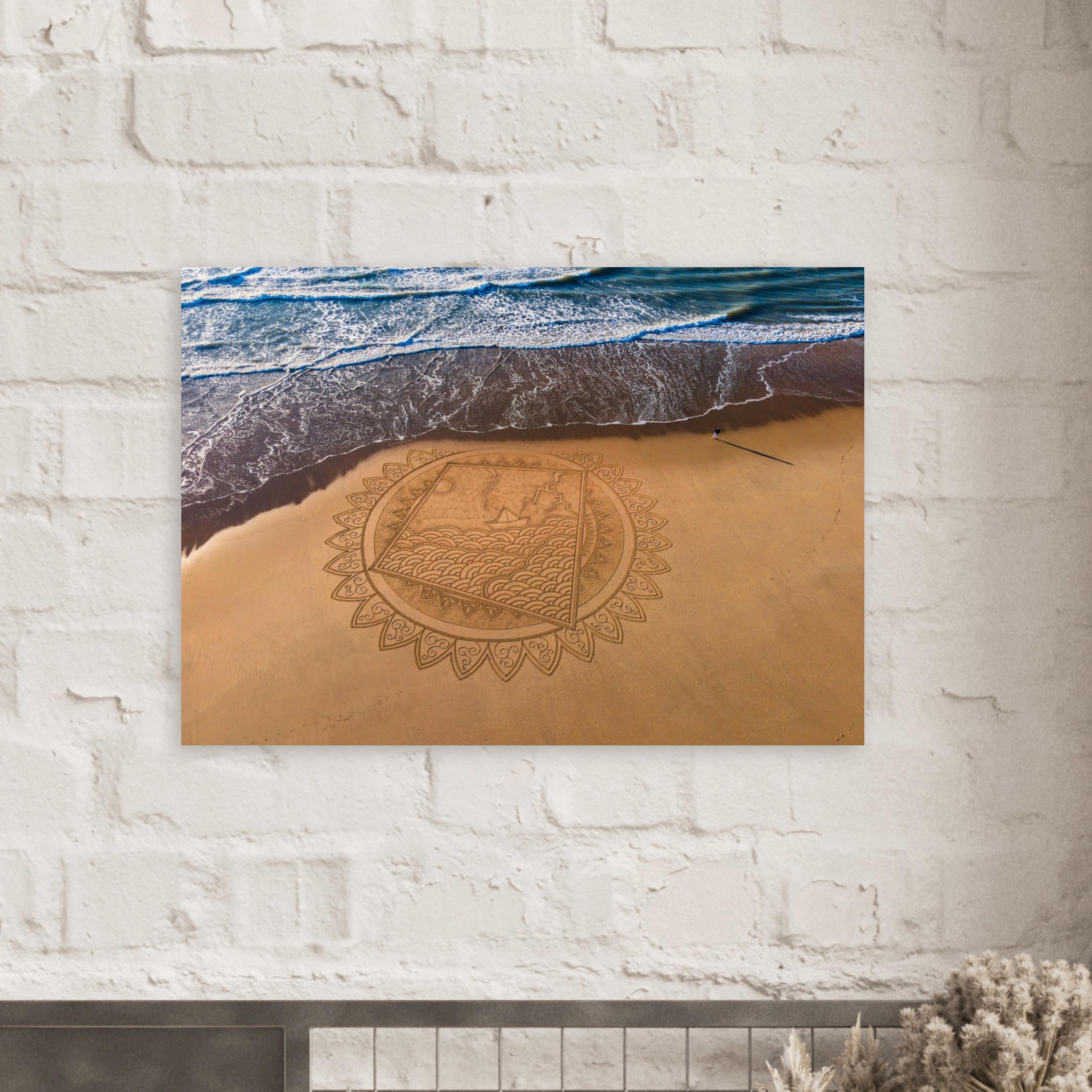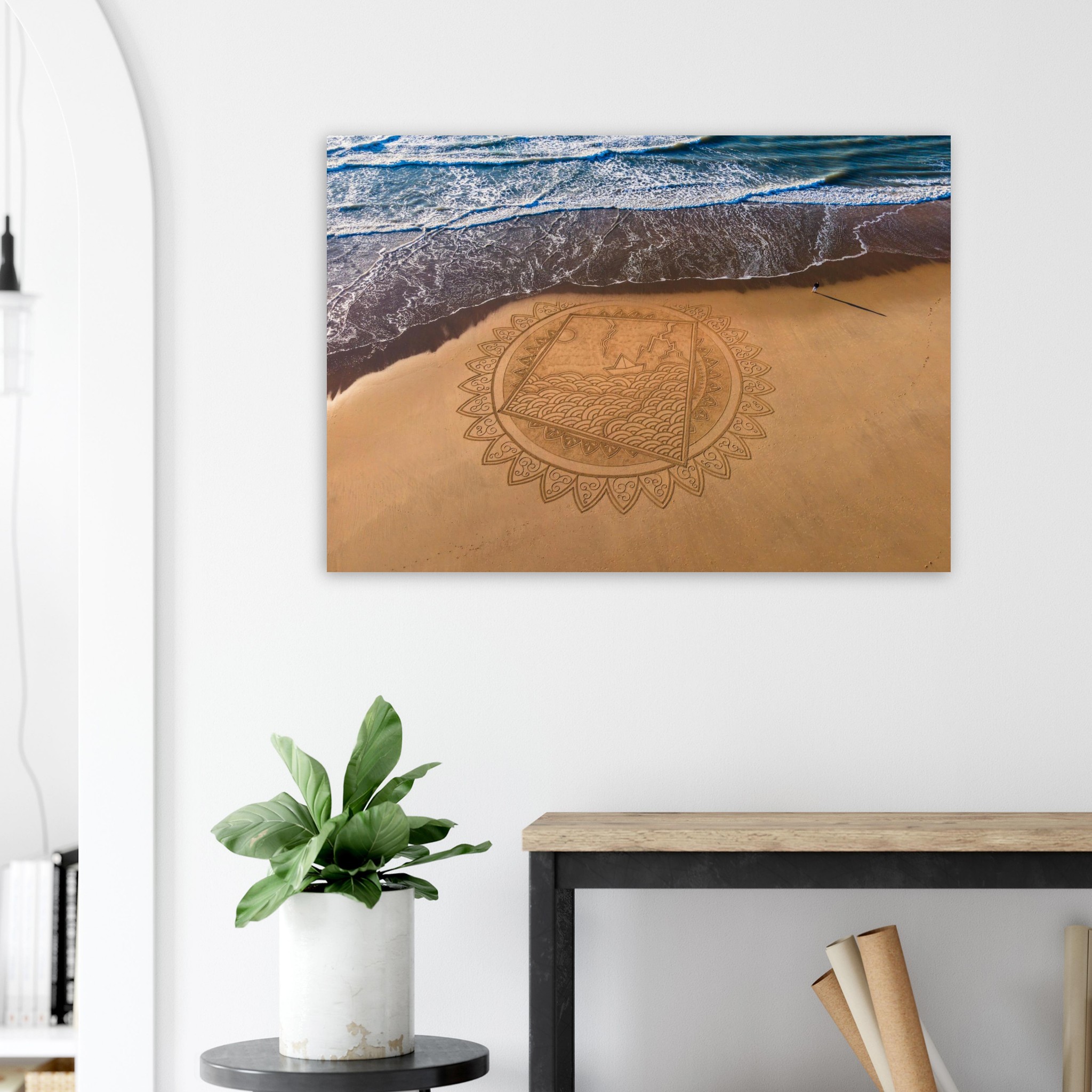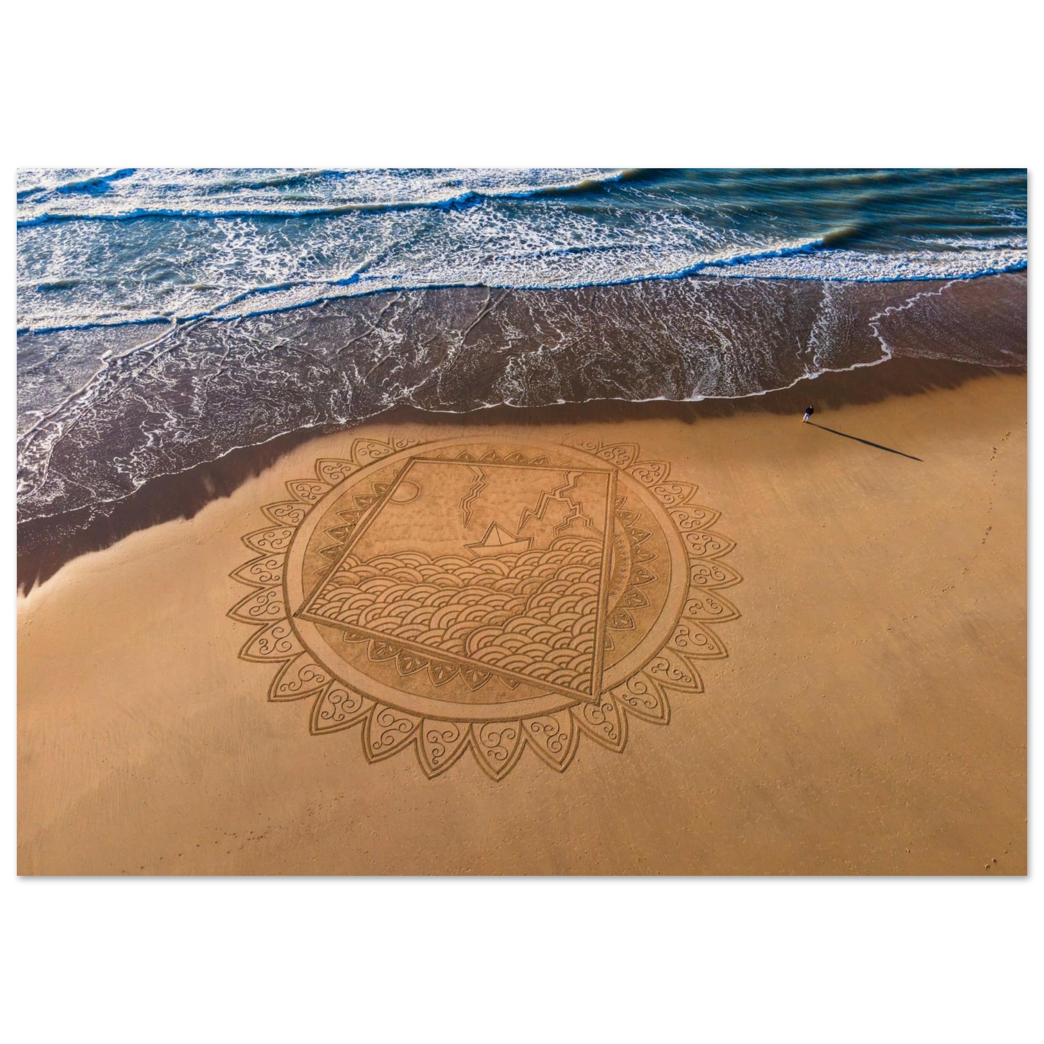 œuvre éphémère dessinée sur sable, où un carré central abrite