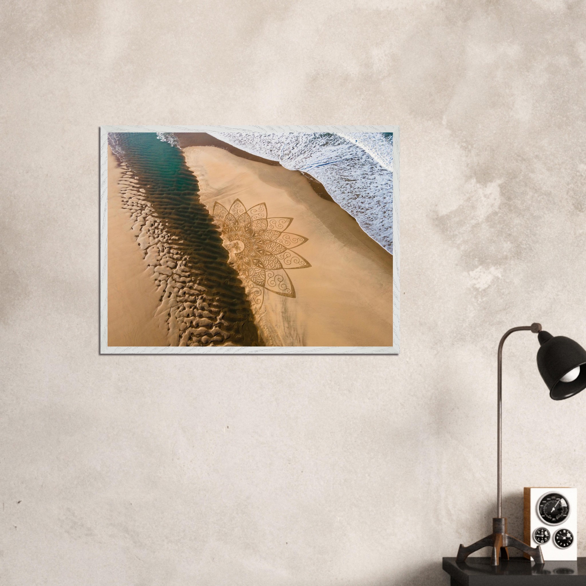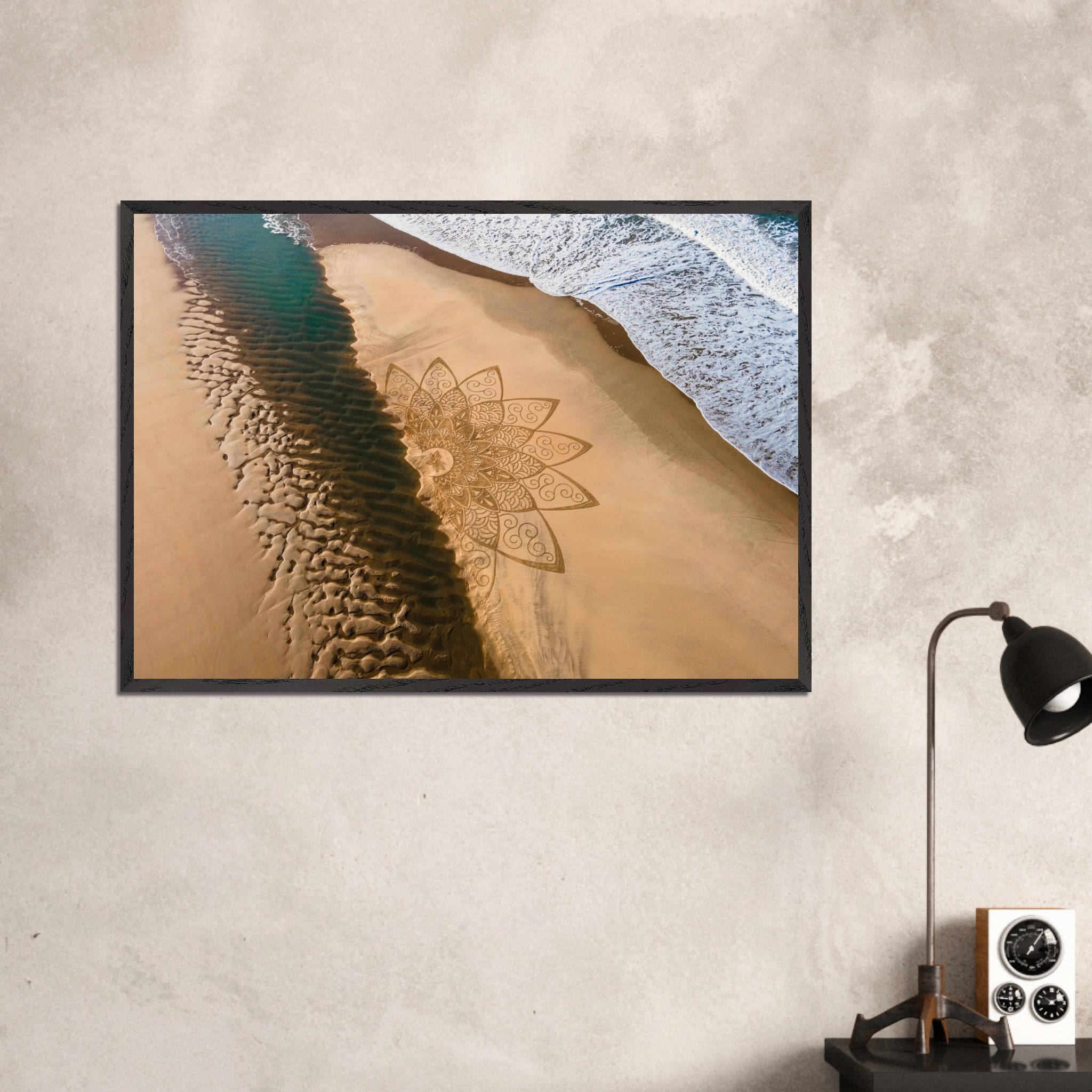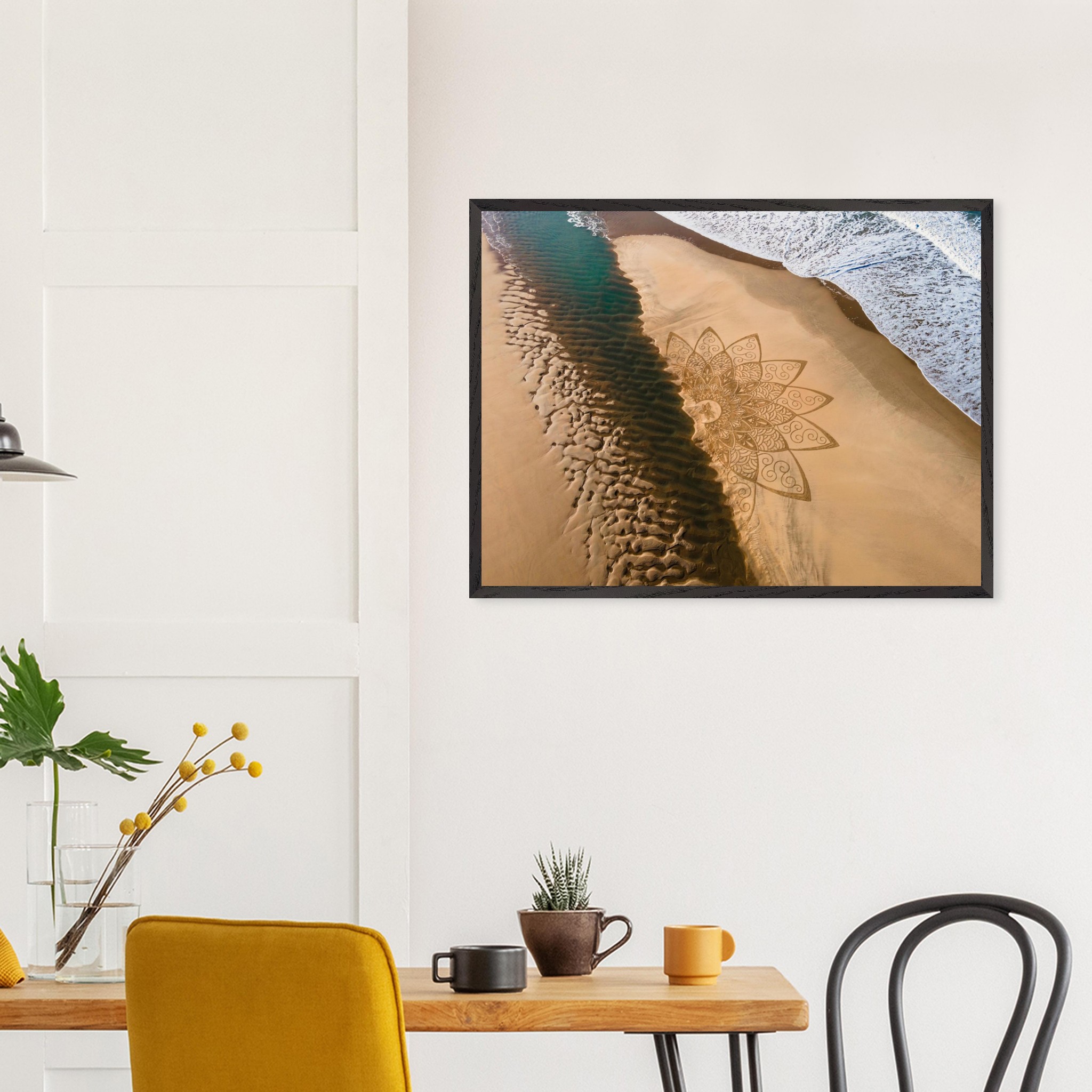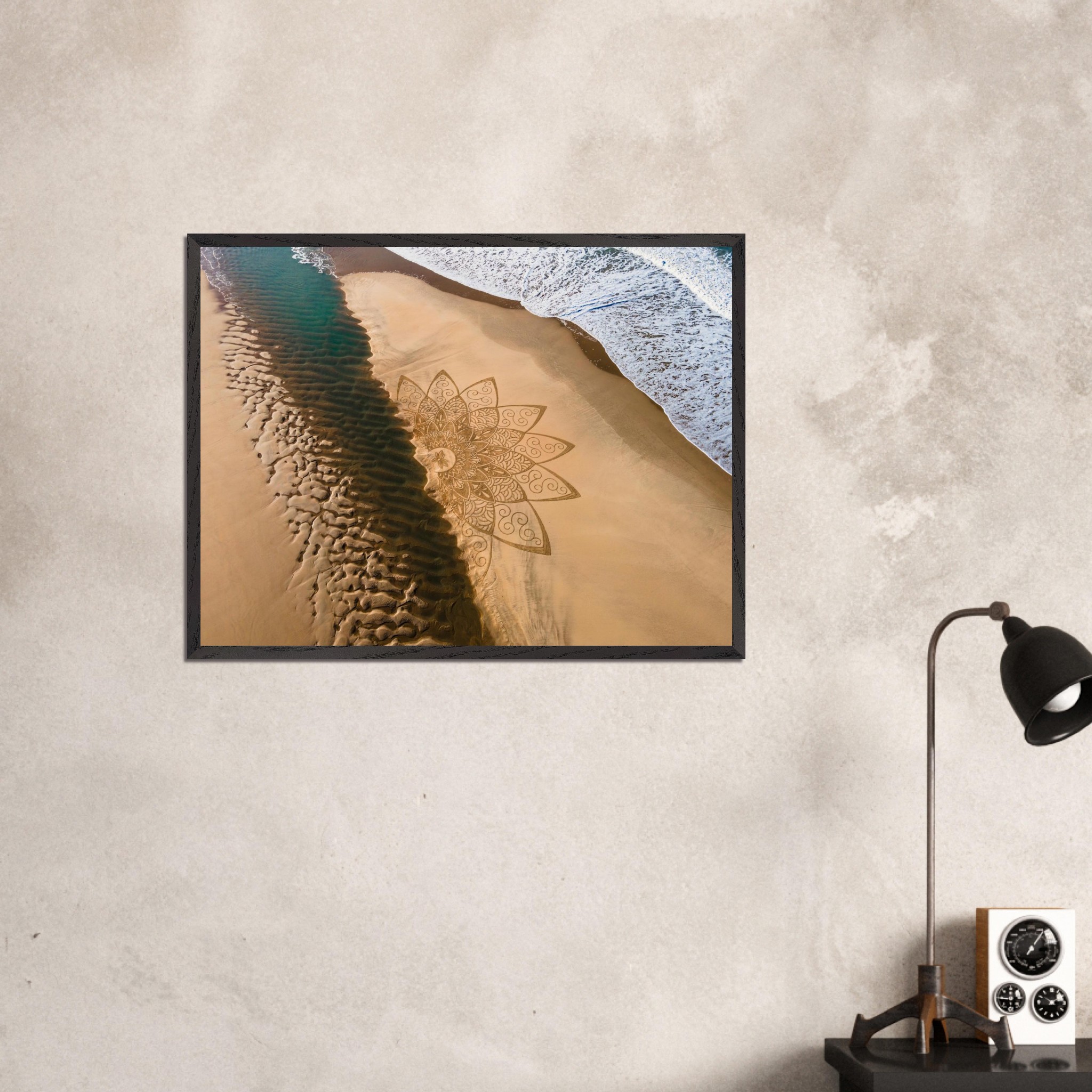 Une photographie artistique d’un mandala sur sable, sublimée dans un cadre élégant et prête à être accrochée directement chez vous.
