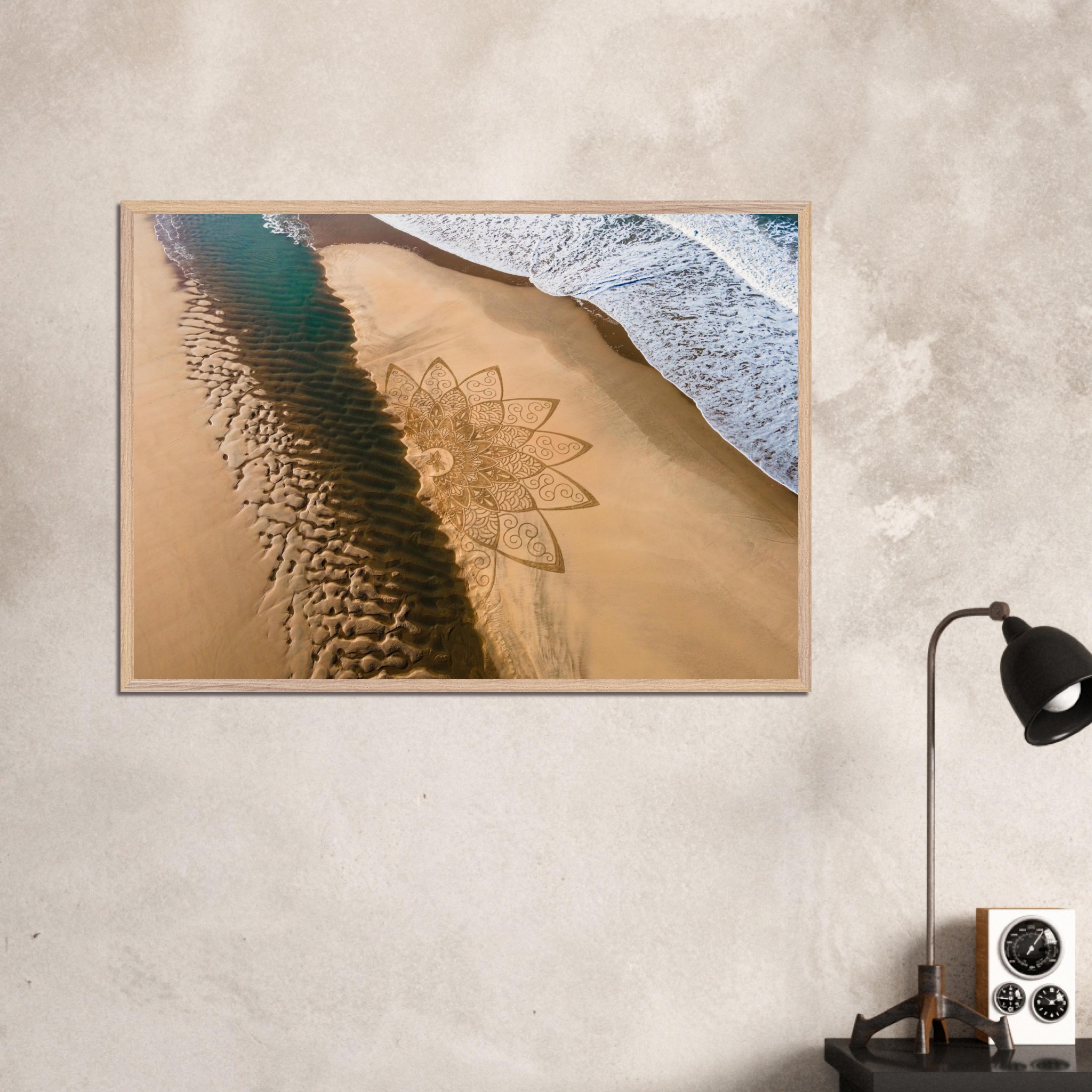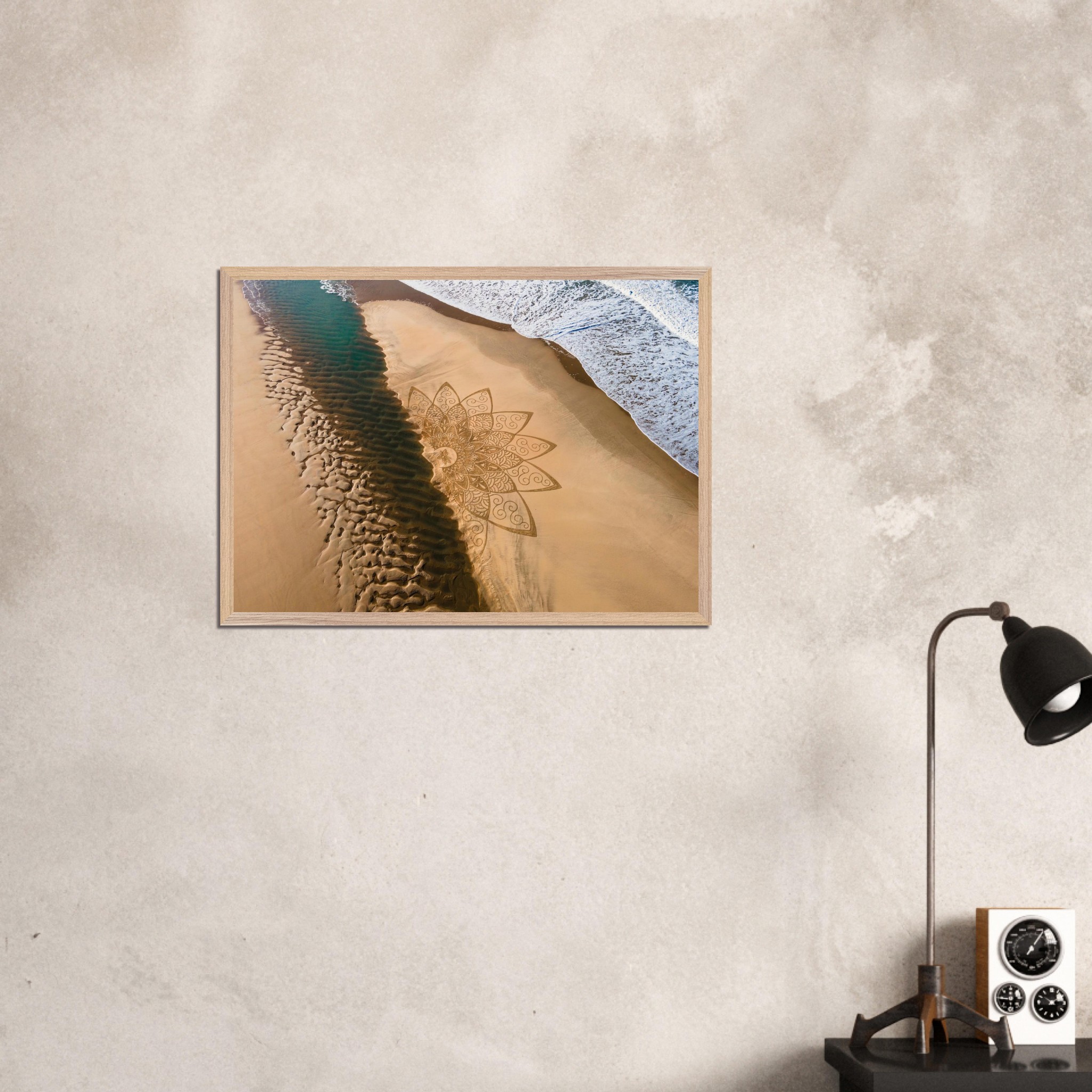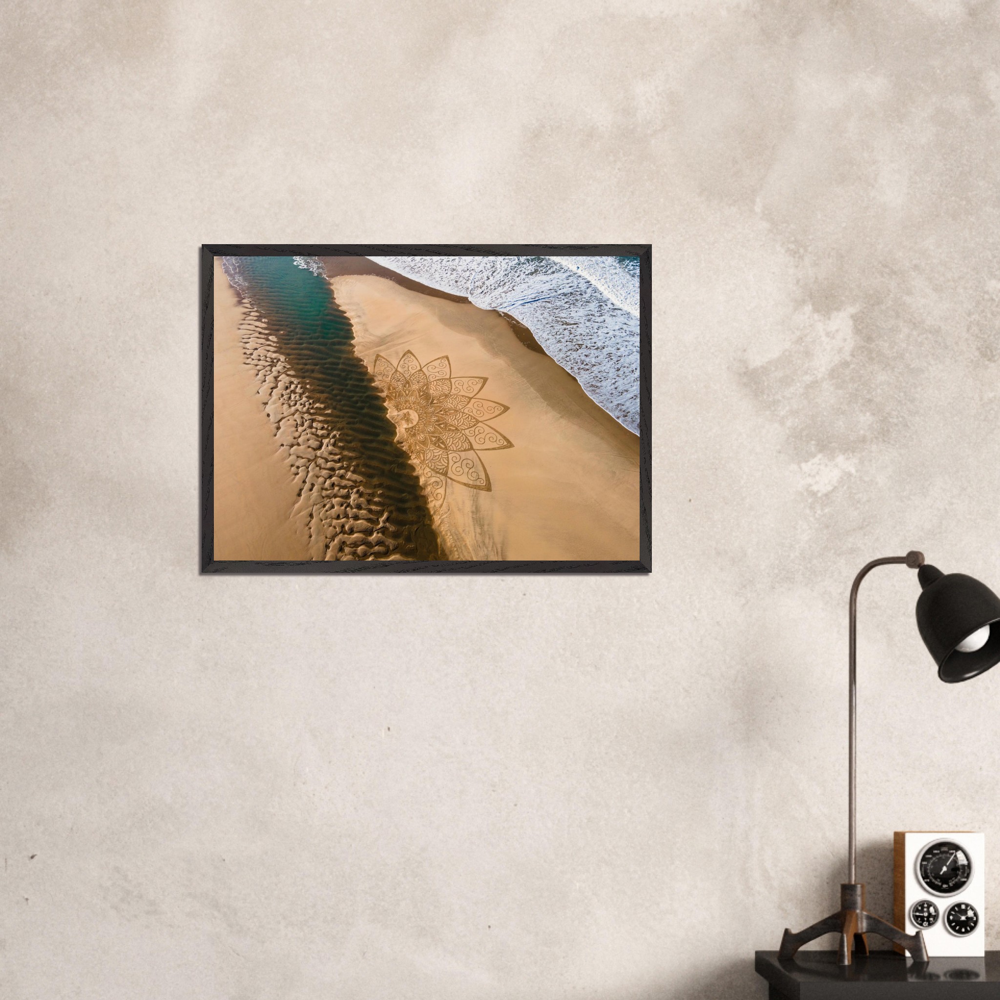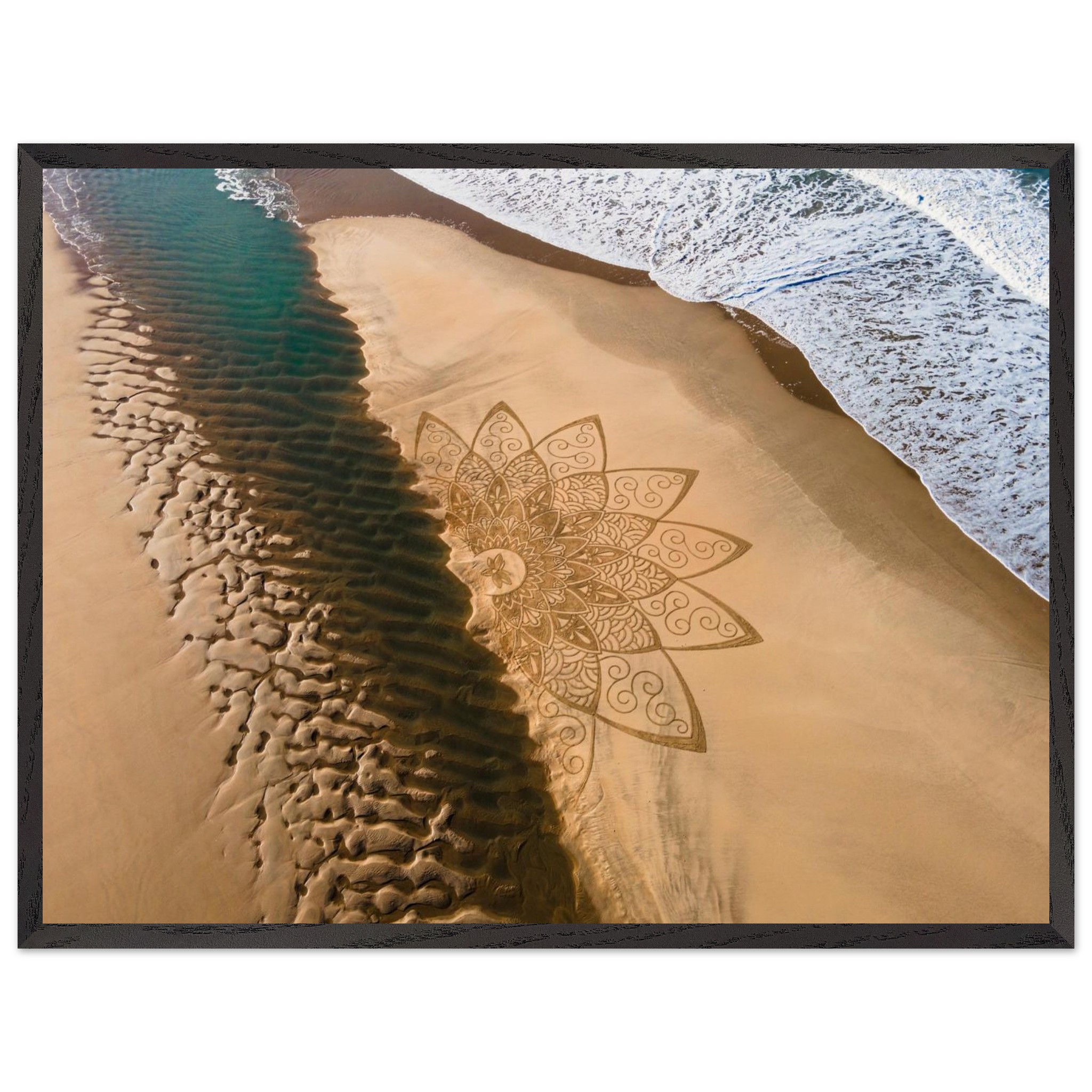 Une photographie artistique d’un mandala sur sable, sublimée dans un cadre élégant et prête à être accrochée directement chez vous.