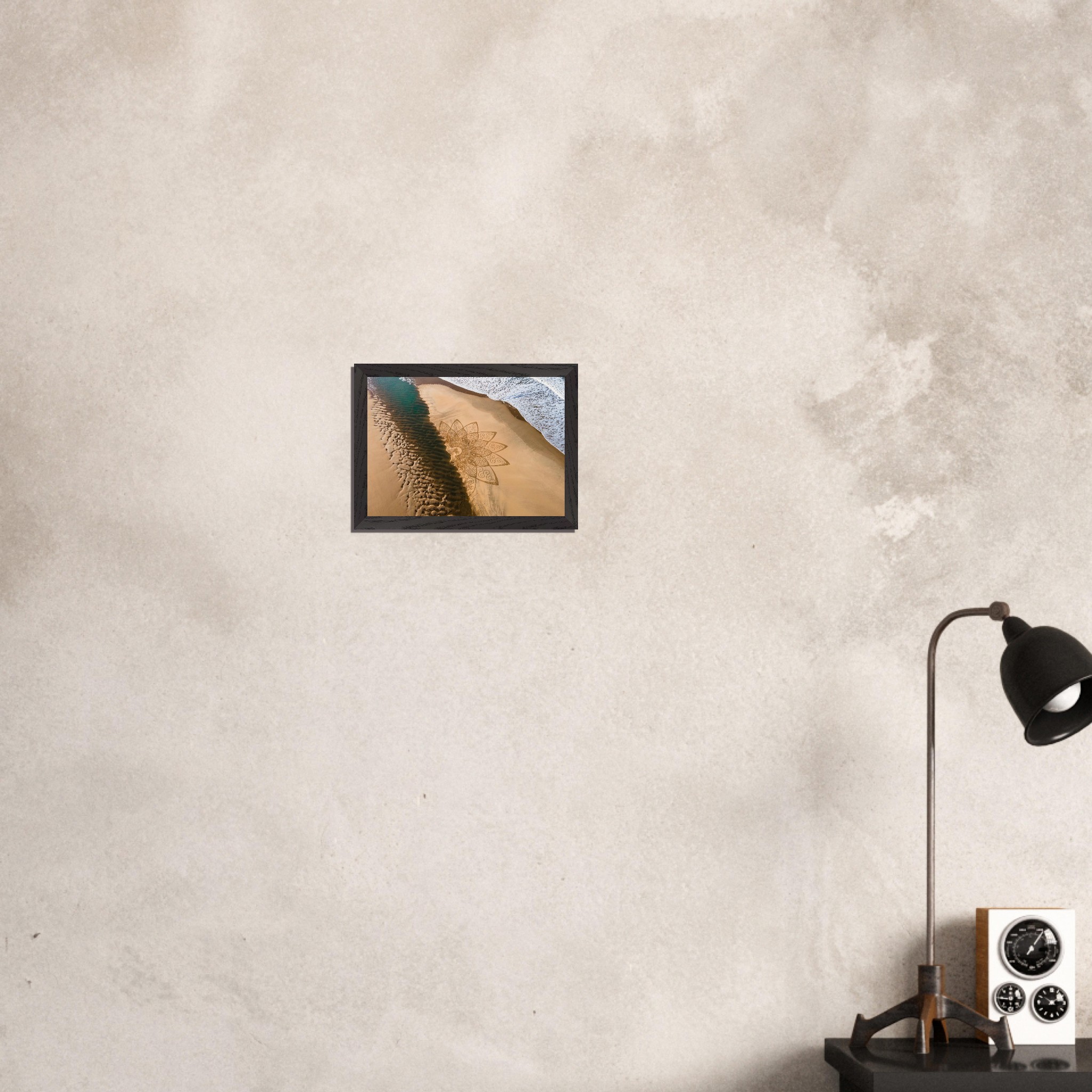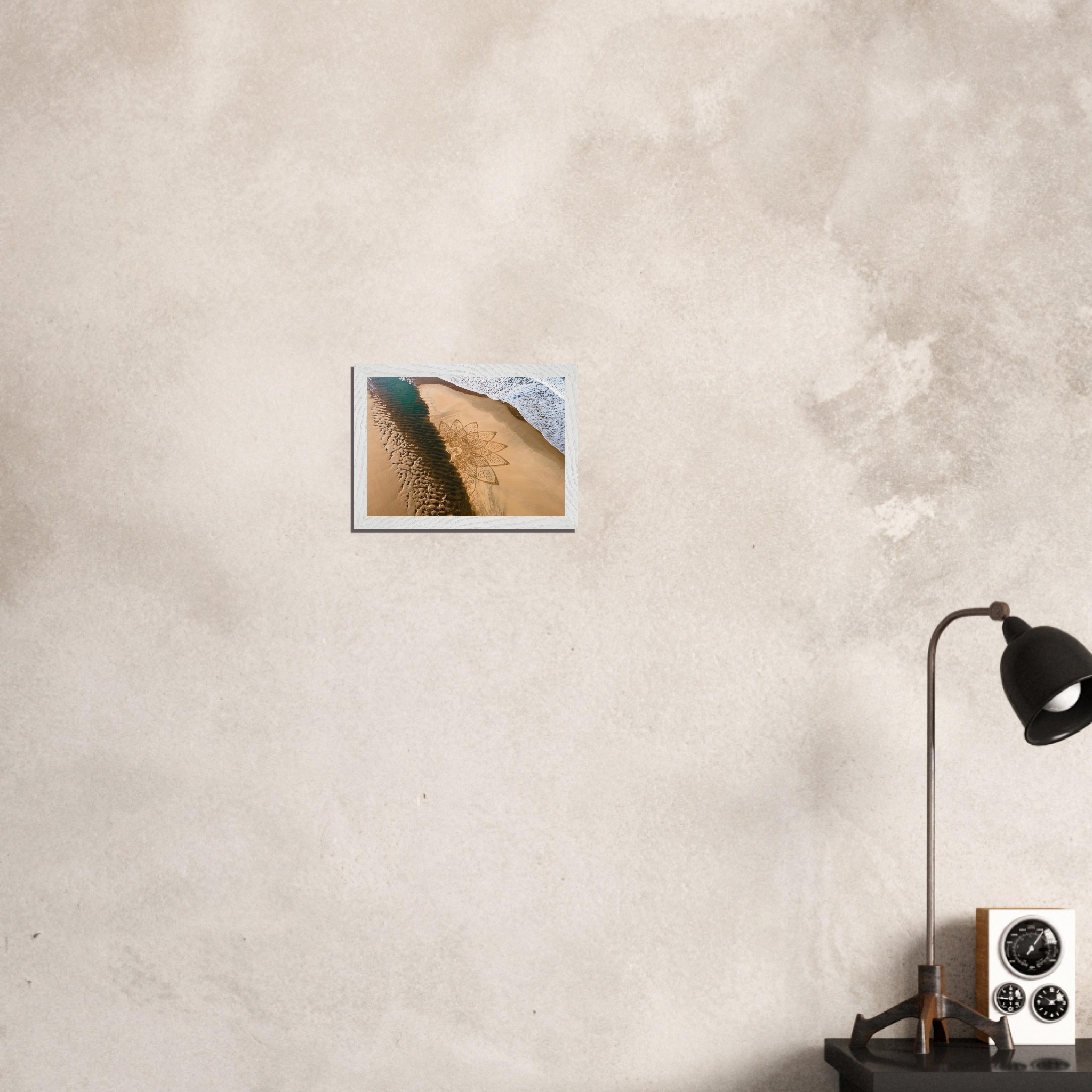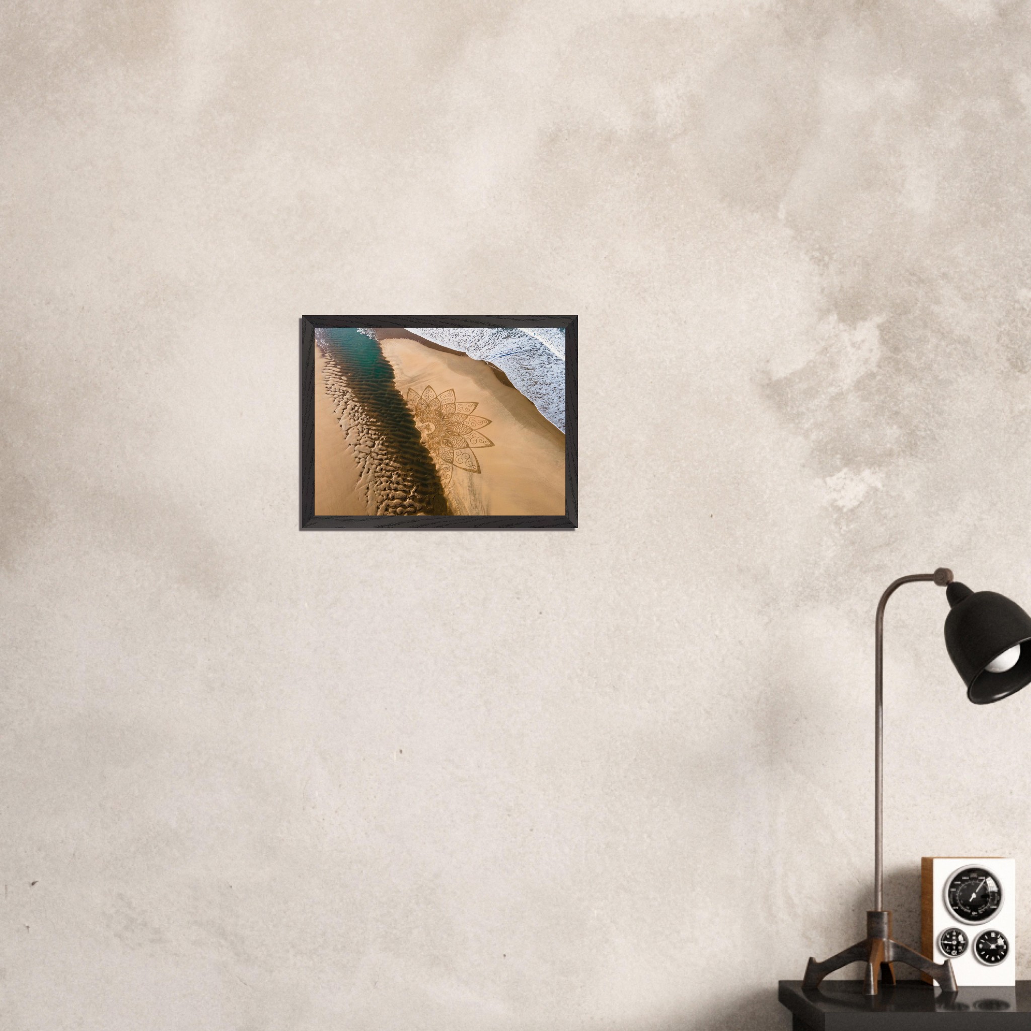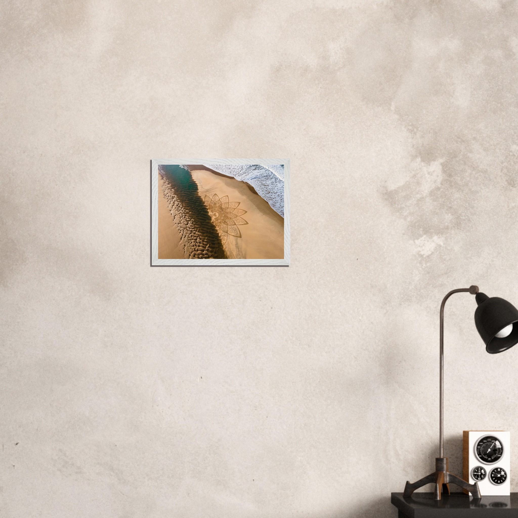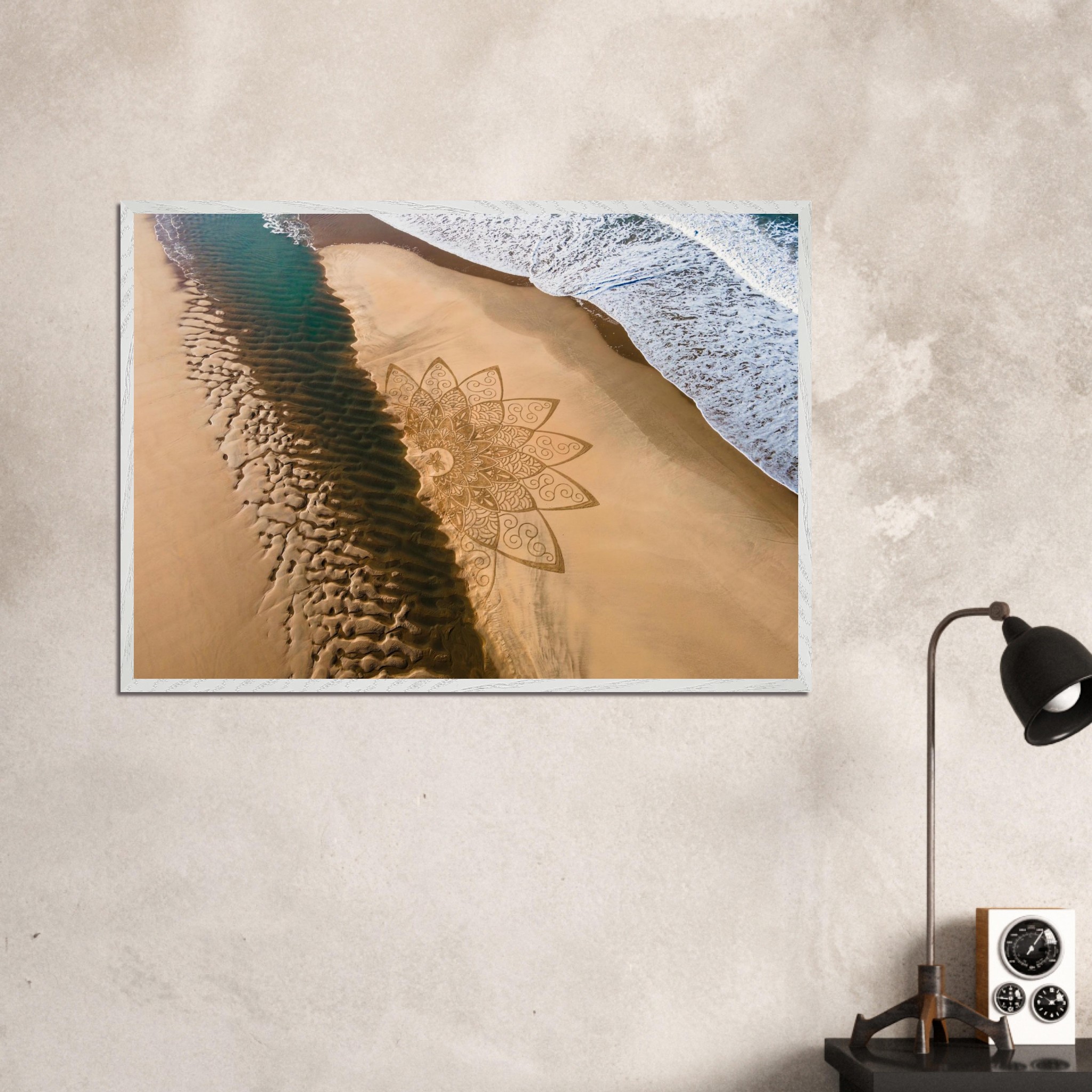 Une photographie artistique d’un mandala sur sable, sublimée dans un cadre élégant et prête à être accrochée directement chez vous.