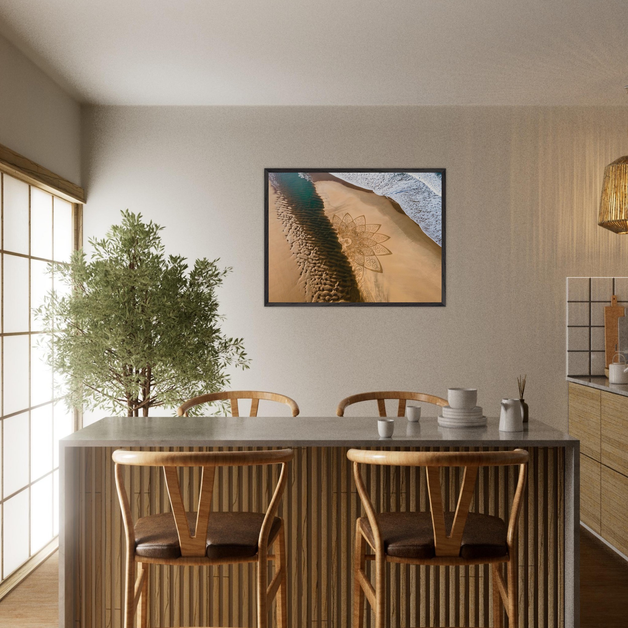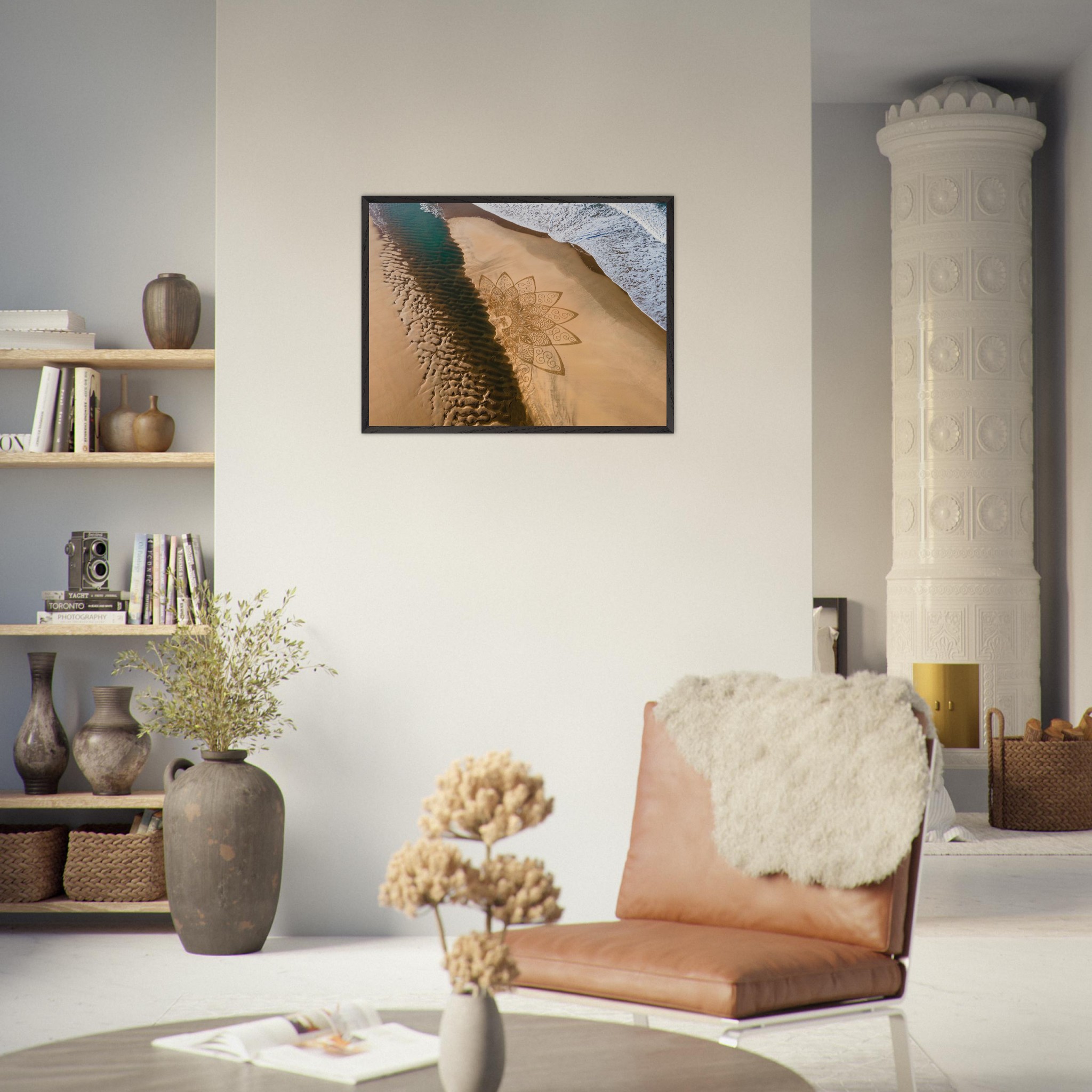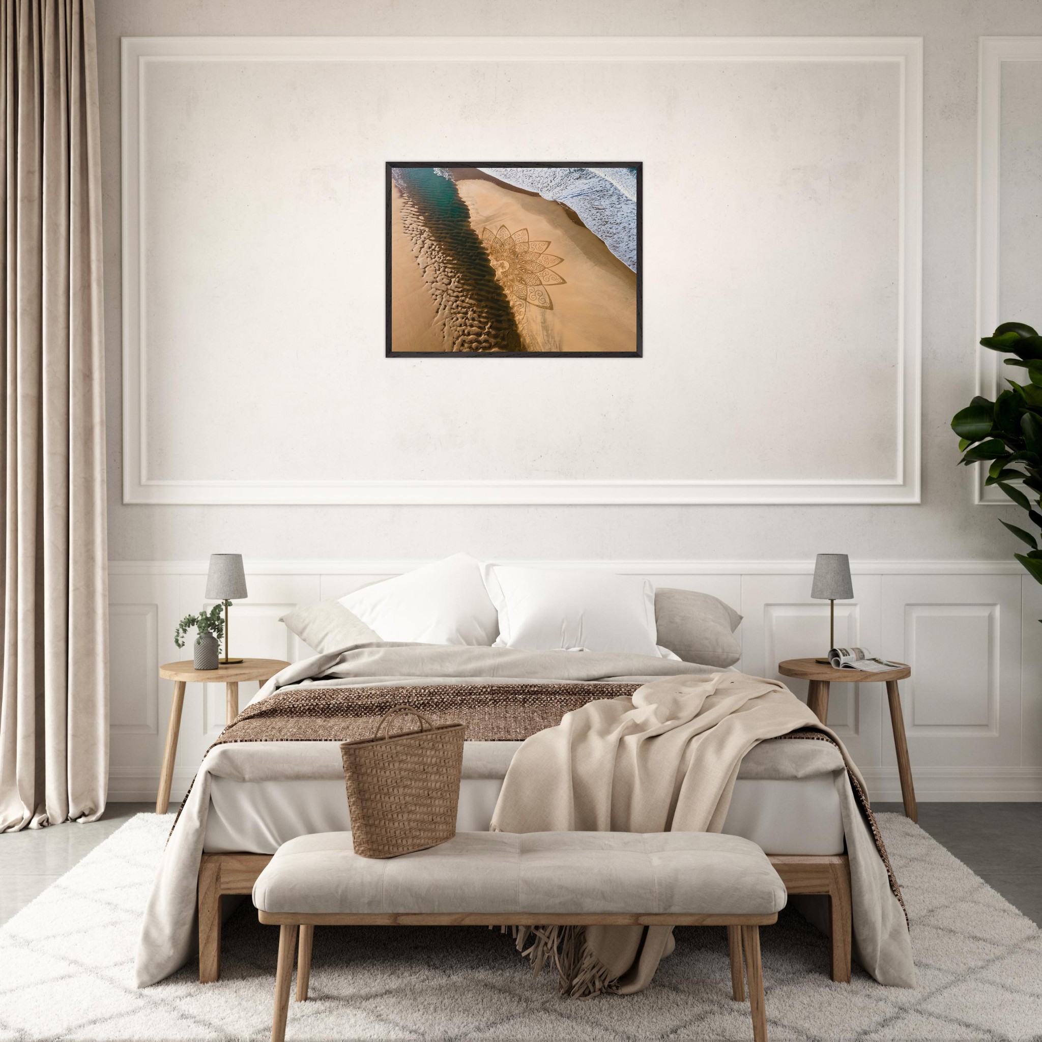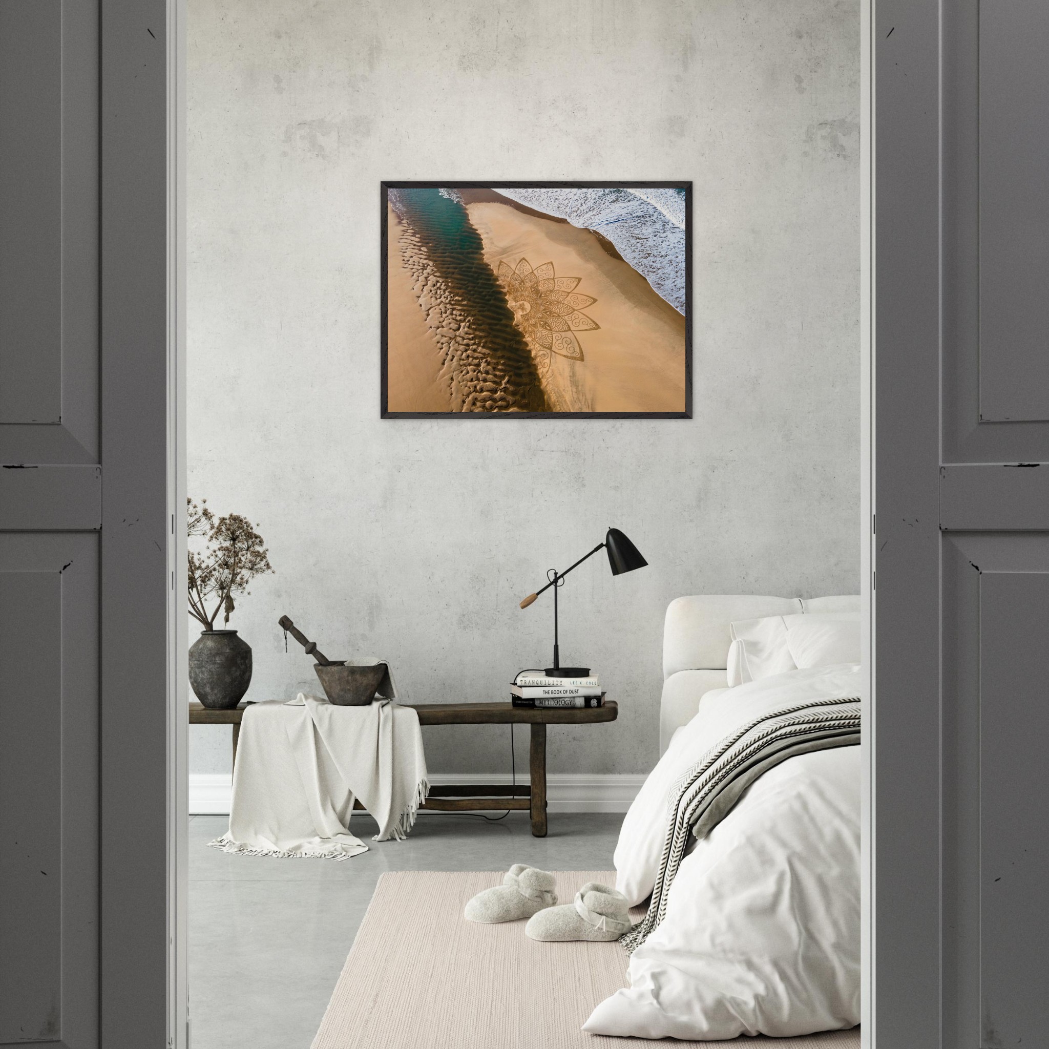 Une photographie artistique d’un mandala sur sable, sublimée dans un cadre élégant et prête à être accrochée directement chez vous.