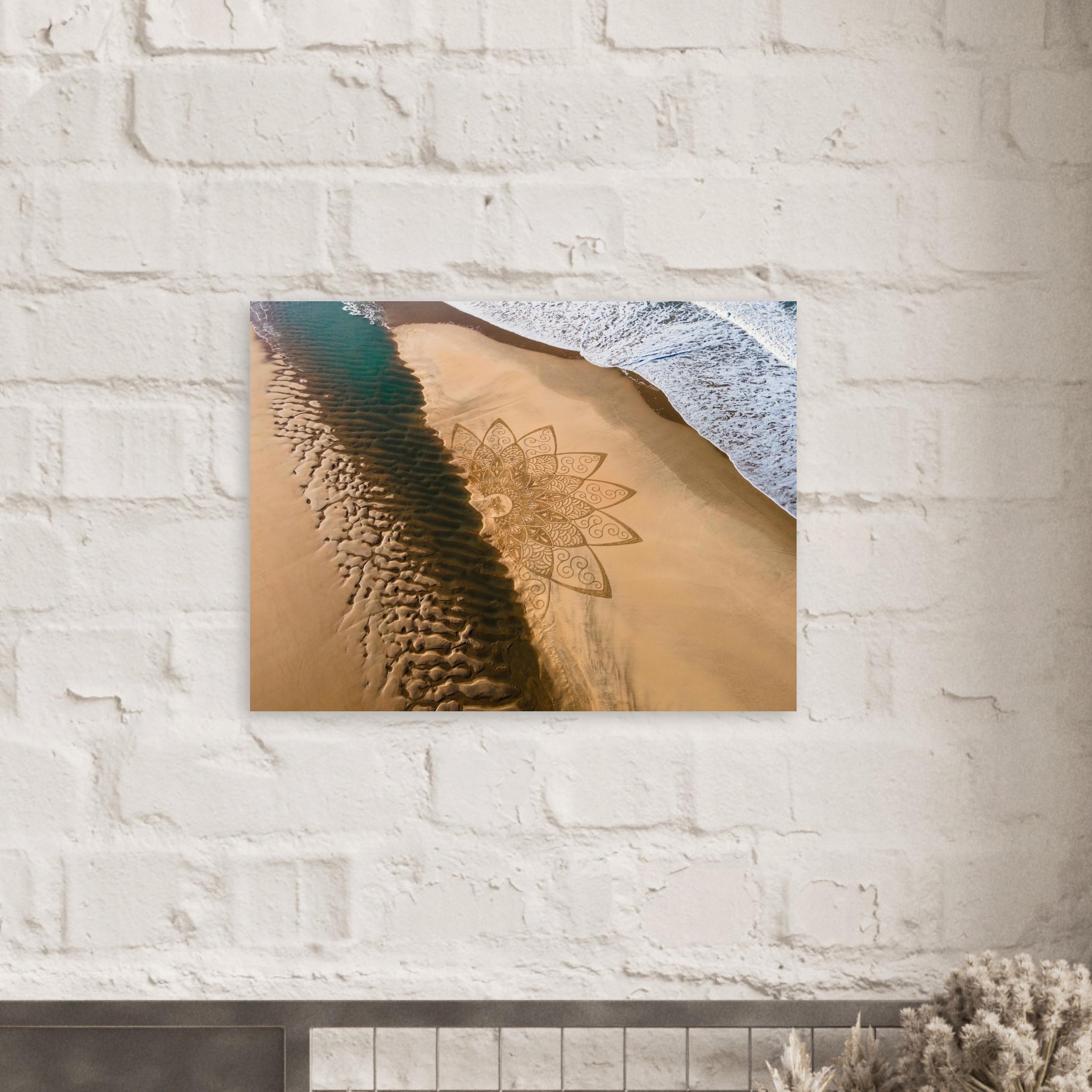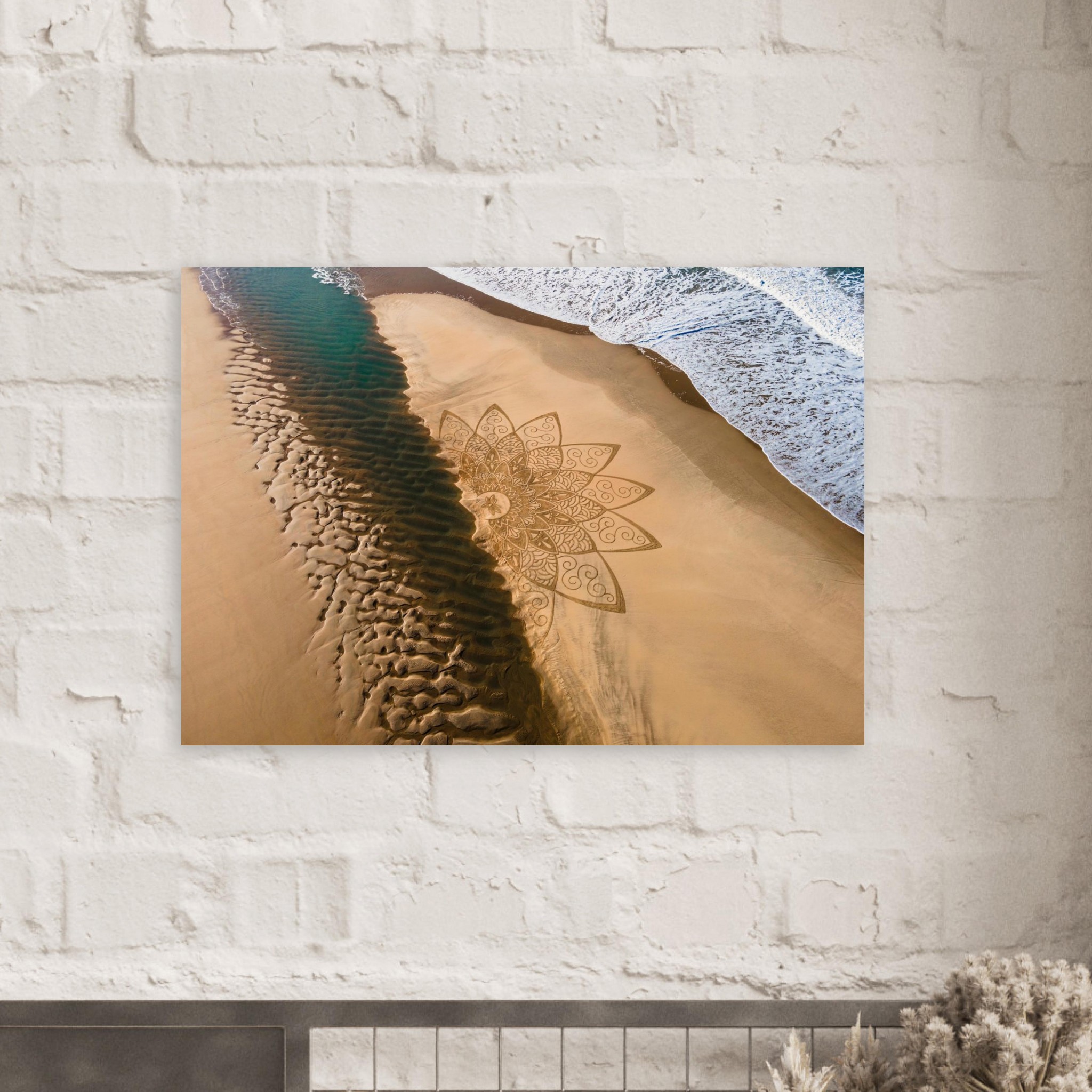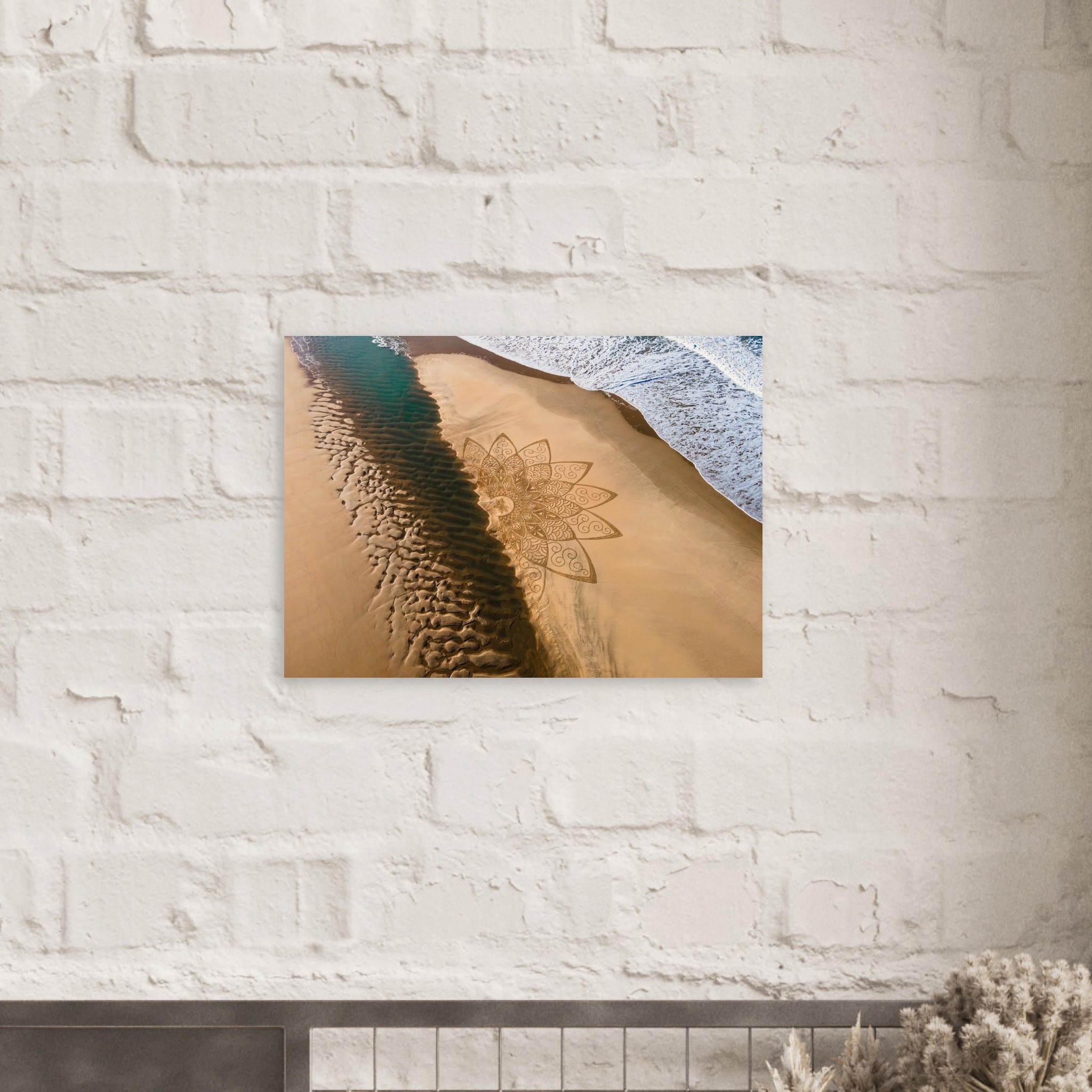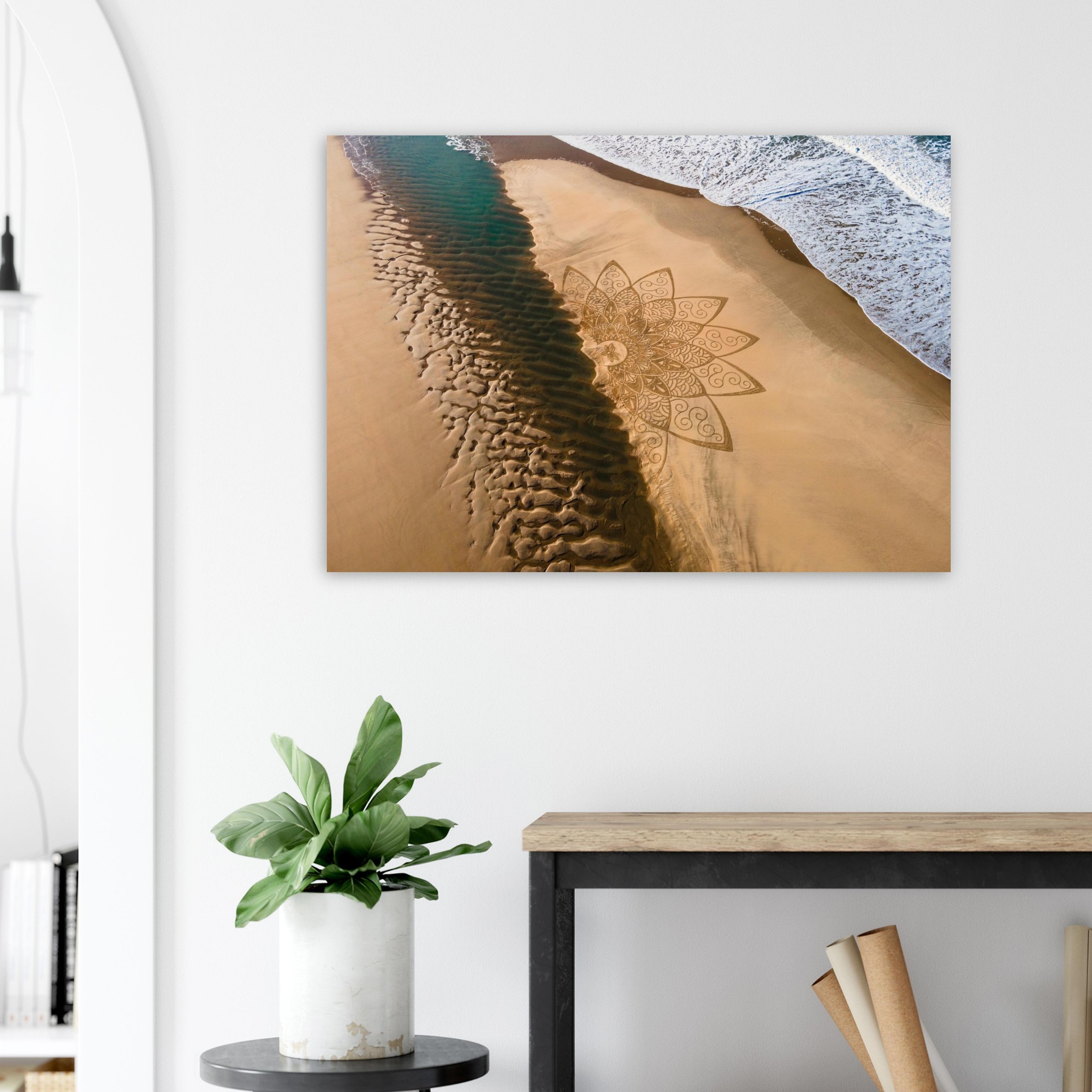 Un mandala éphémère tracé sur le sable, immortalisé avant d’être effacé par la mer. Une œuvre d’équilibre et de sérénité, prête à sublimer votre intérieur.