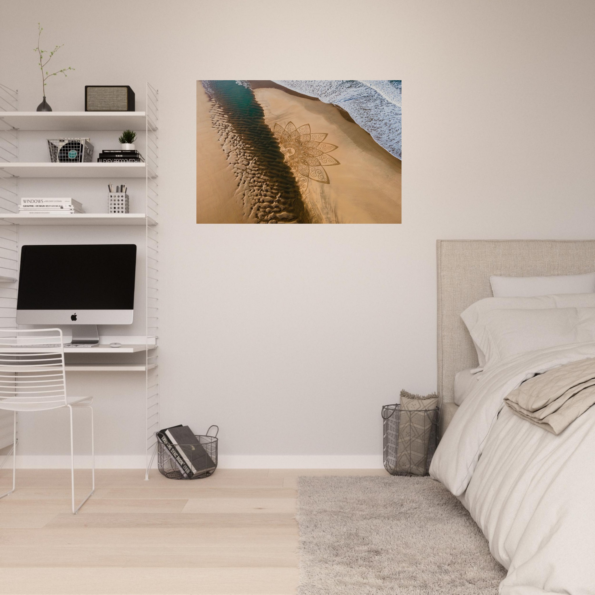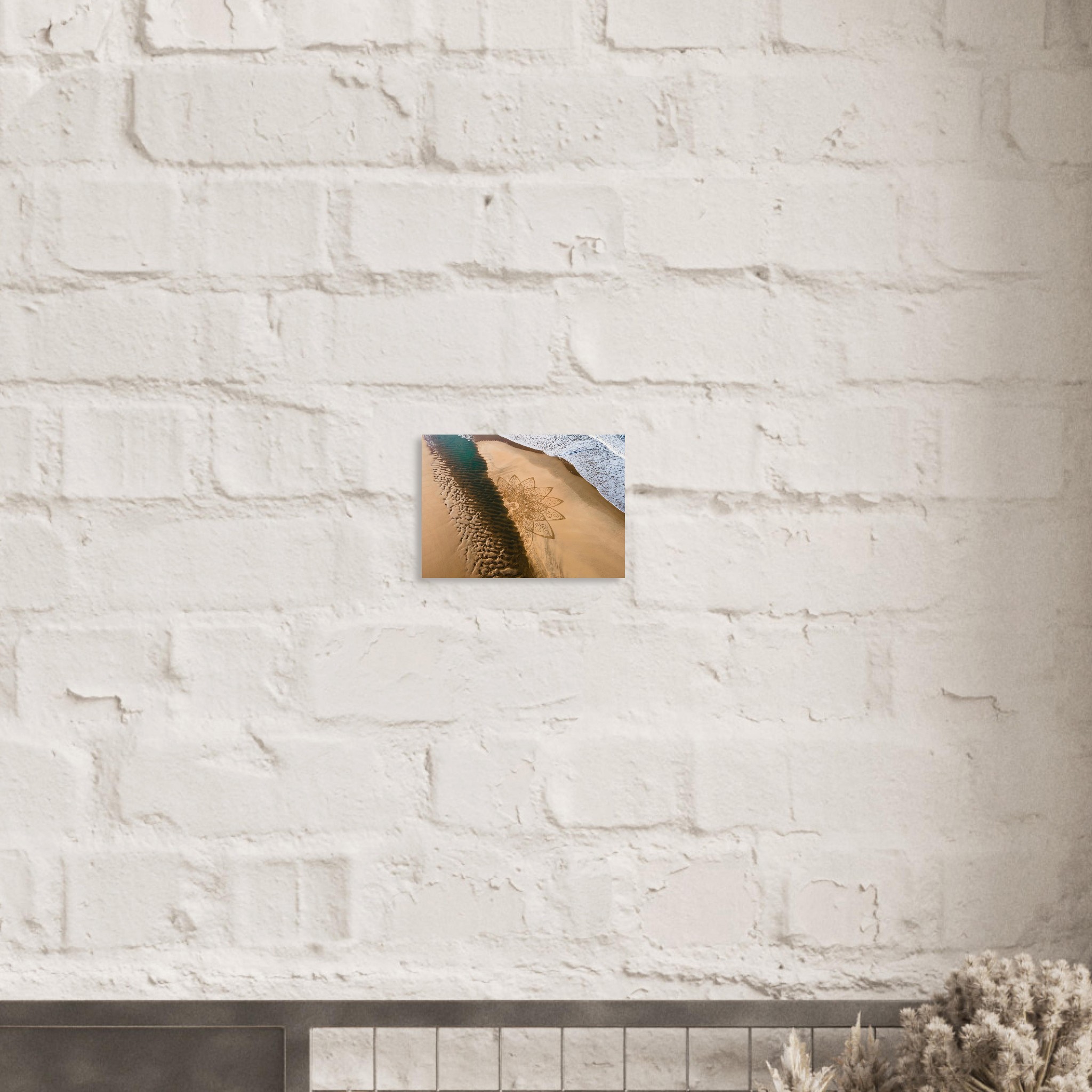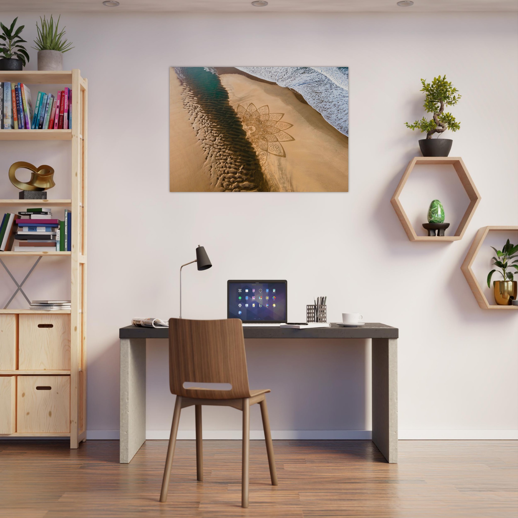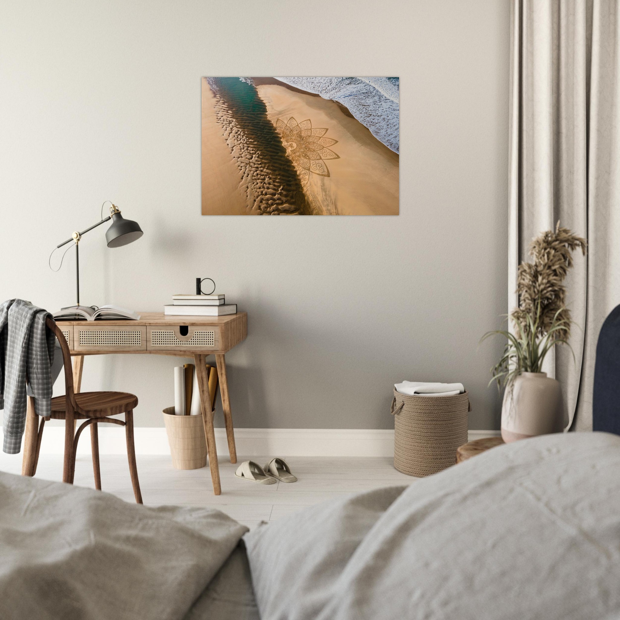 Un mandala éphémère tracé sur le sable, immortalisé avant d’être effacé par la mer. Une œuvre d’équilibre et de sérénité, prête à sublimer votre intérieur.
