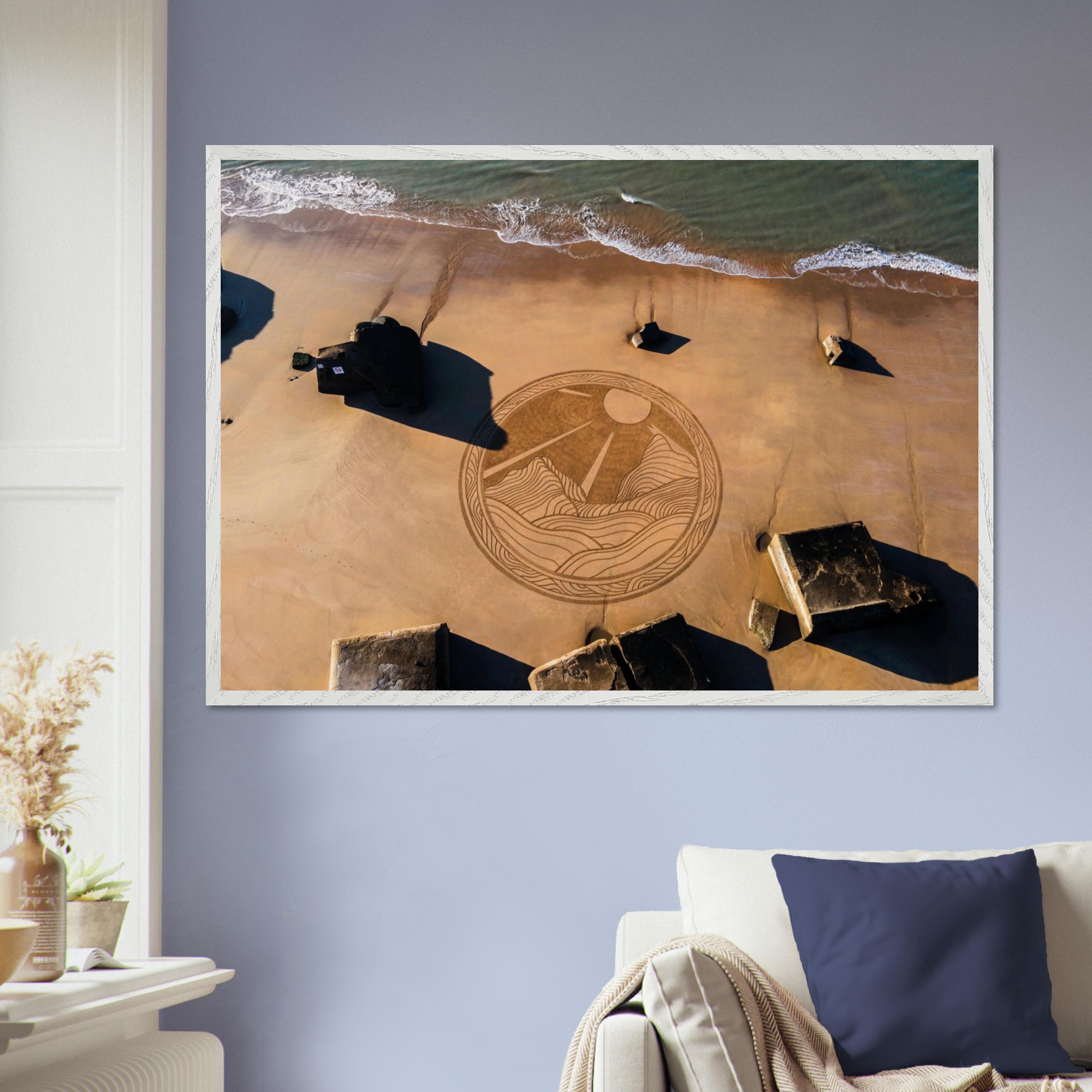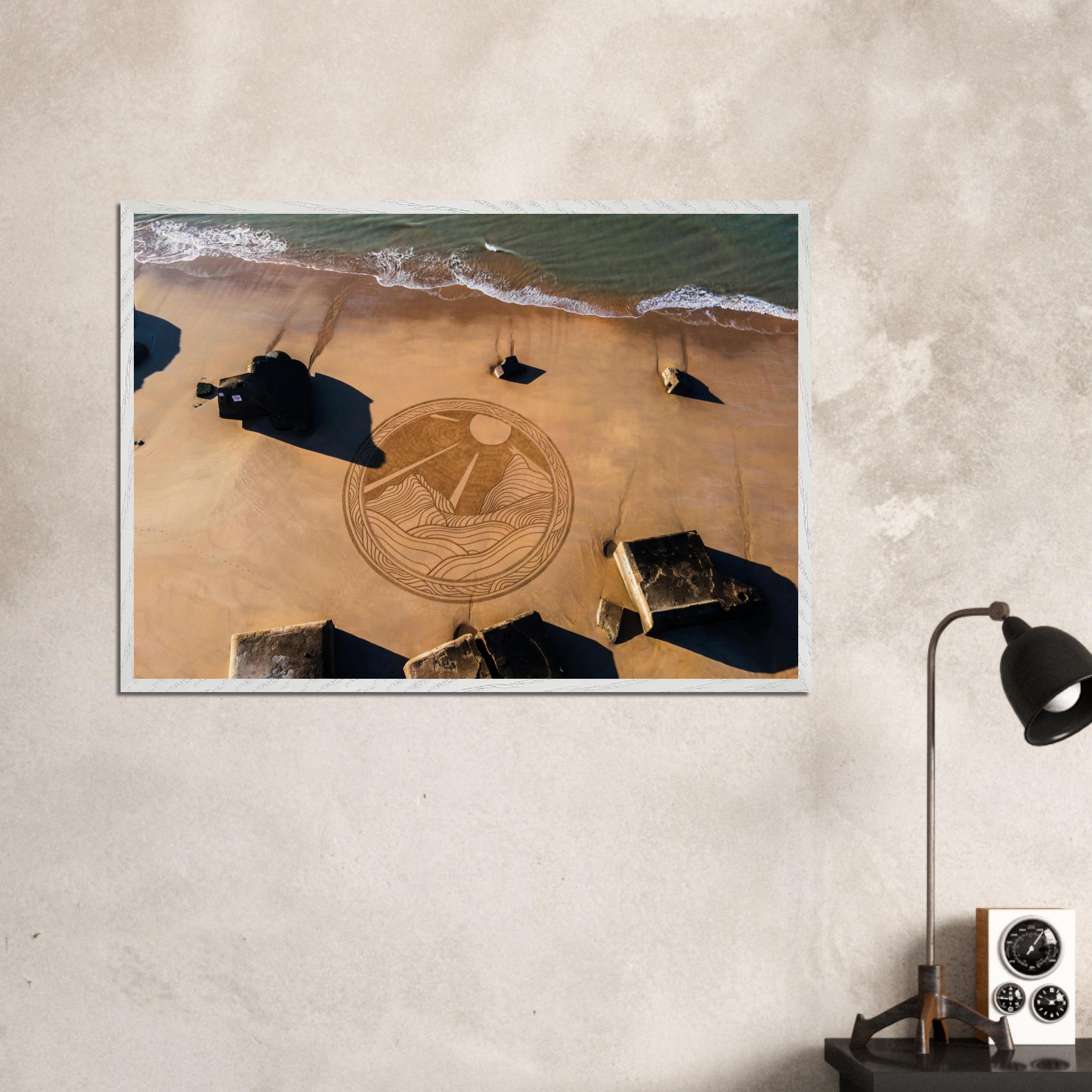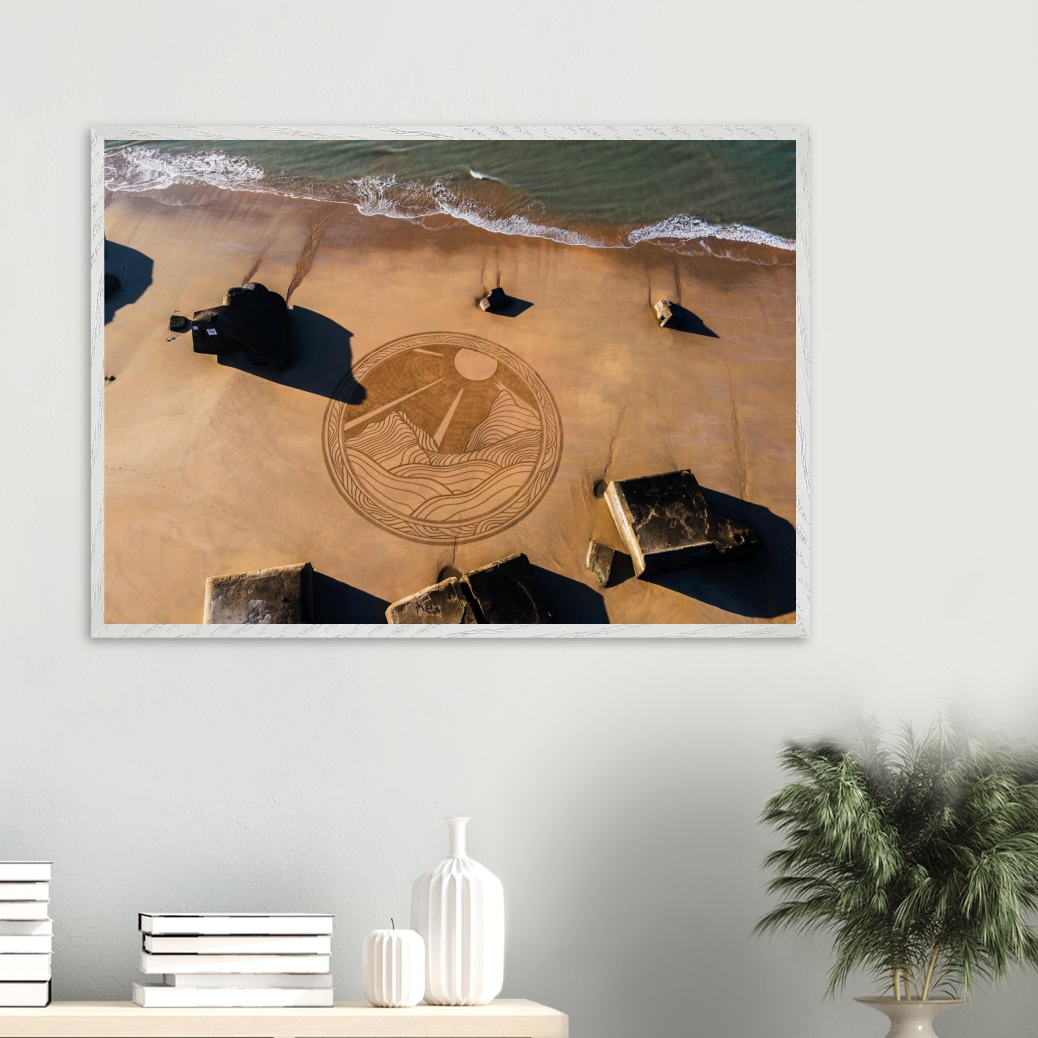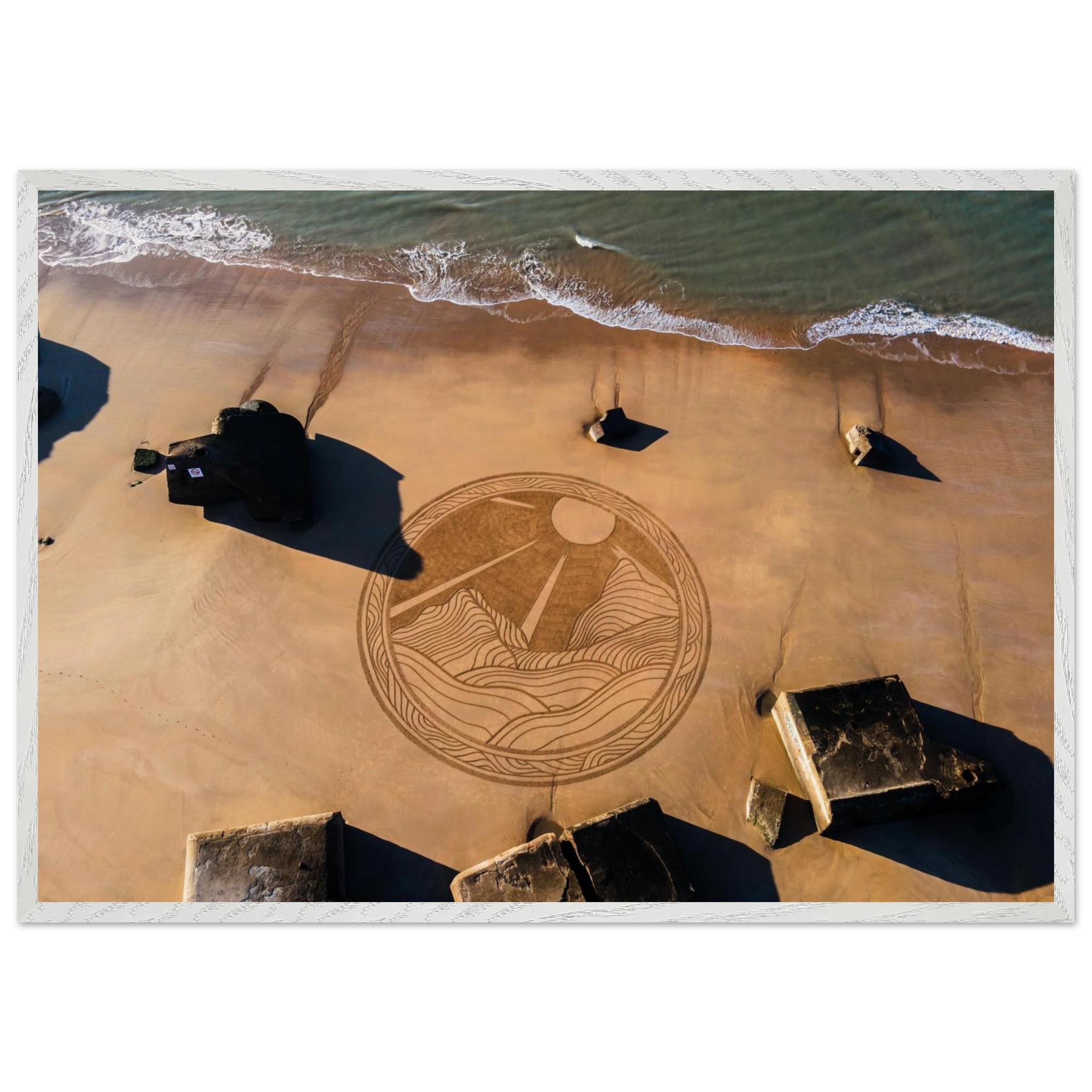 Un soleil éclatant se lève derrière des montagnes sculptées dans le sable, encerclées par un tracé parfait. Les bunkers, témoins muets de l’Histoire, encadrent l’œuvre et en renforcent la profondeur.