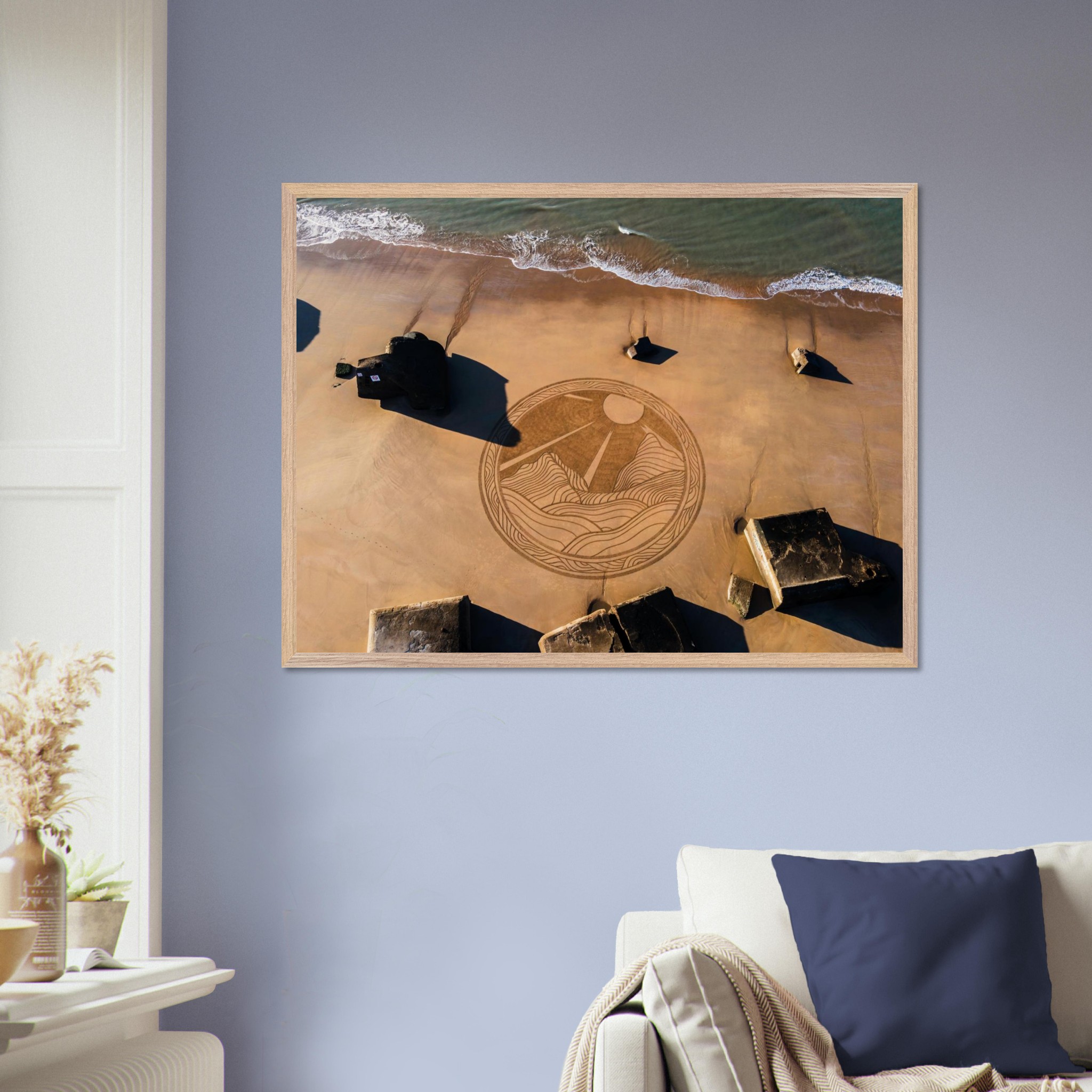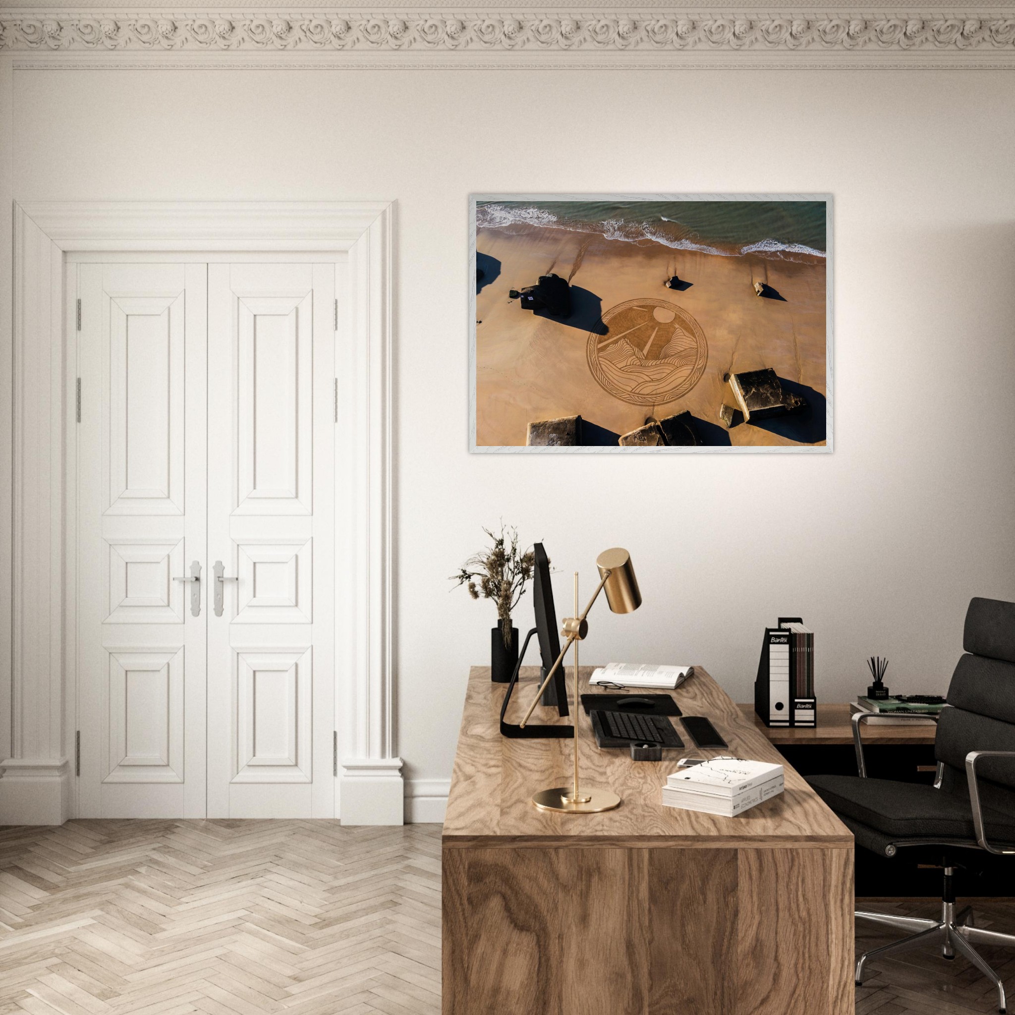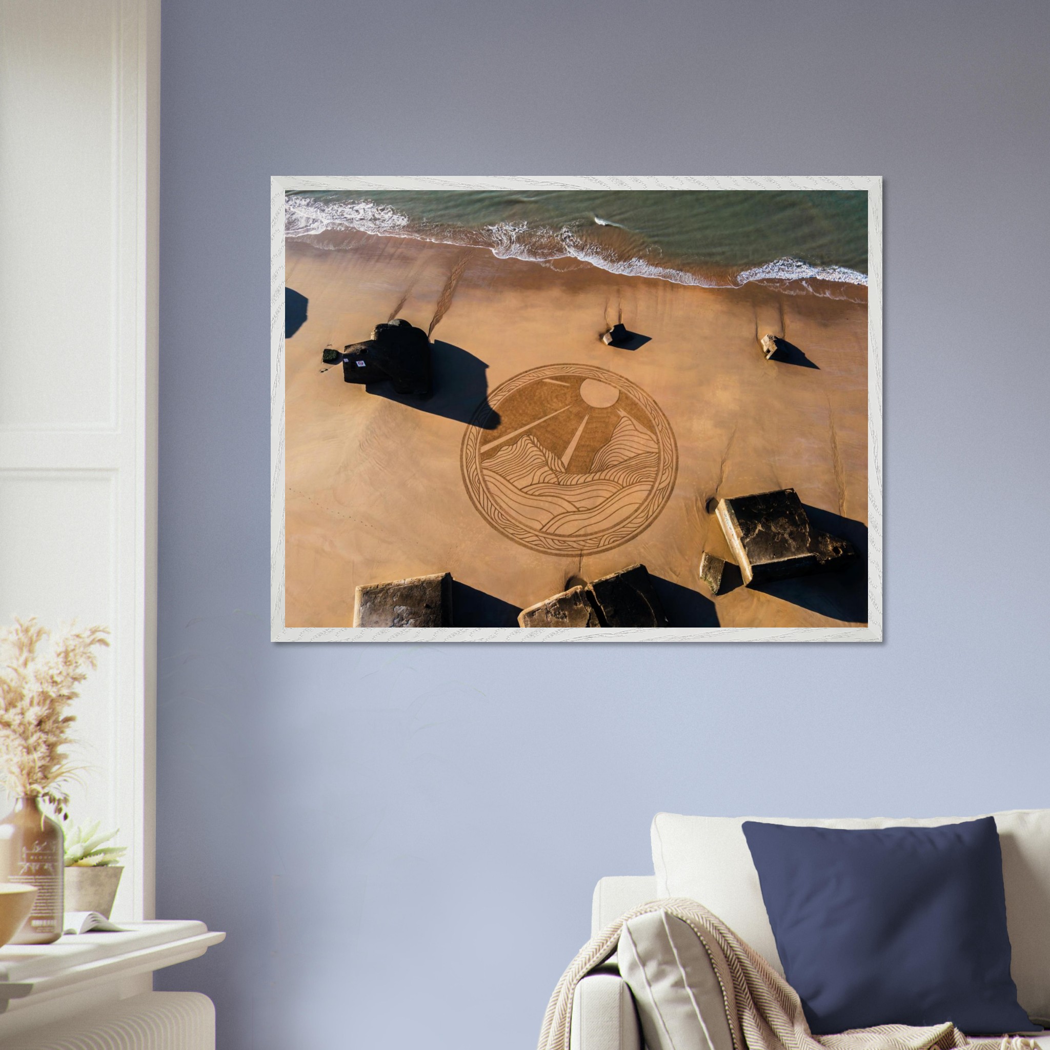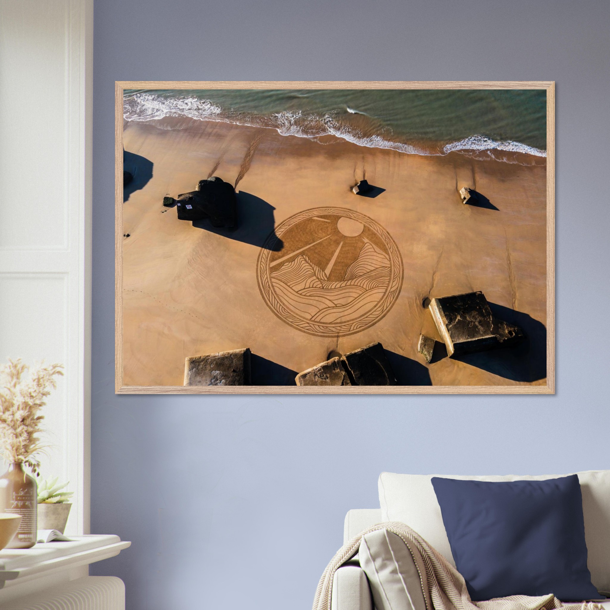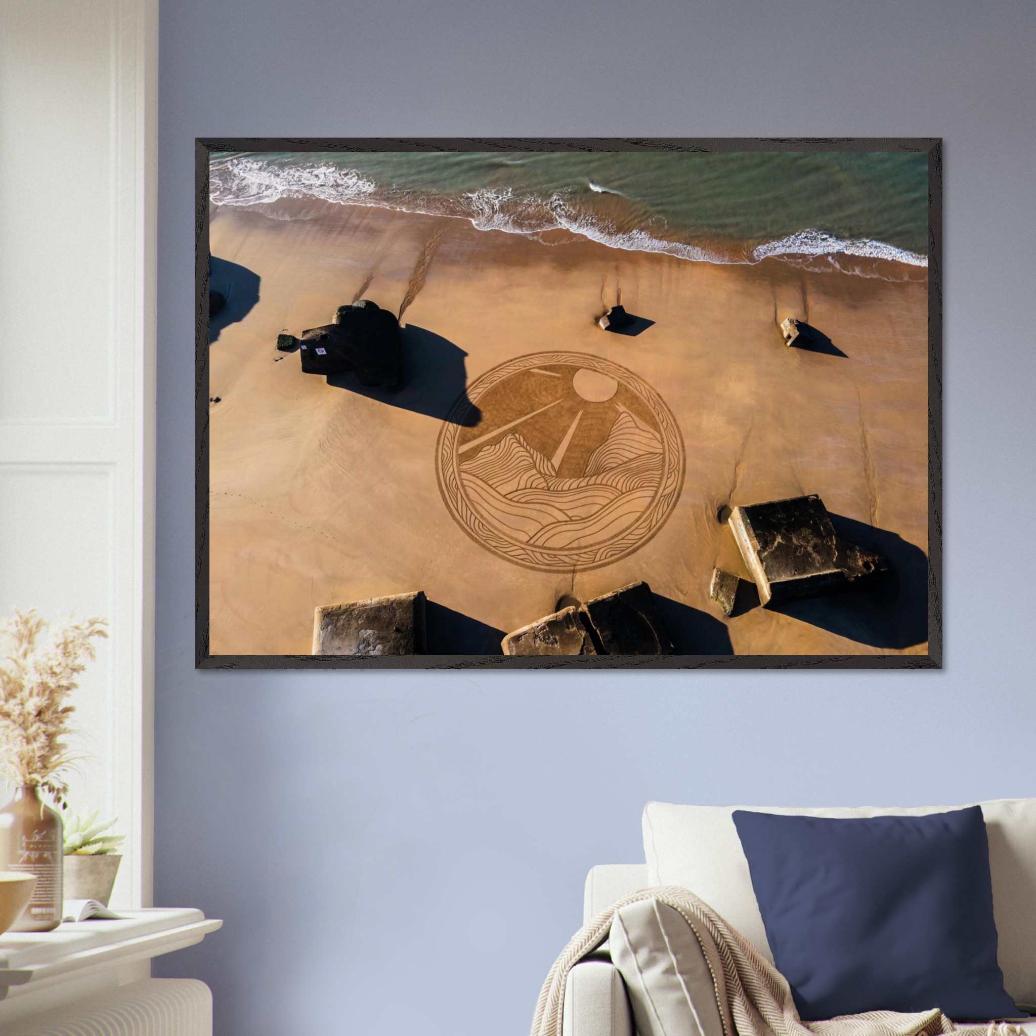 Un soleil éclatant se lève derrière des montagnes sculptées dans le sable, encerclées par un tracé parfait. Les bunkers, témoins muets de l’Histoire, encadrent l’œuvre et en renforcent la profondeur.
