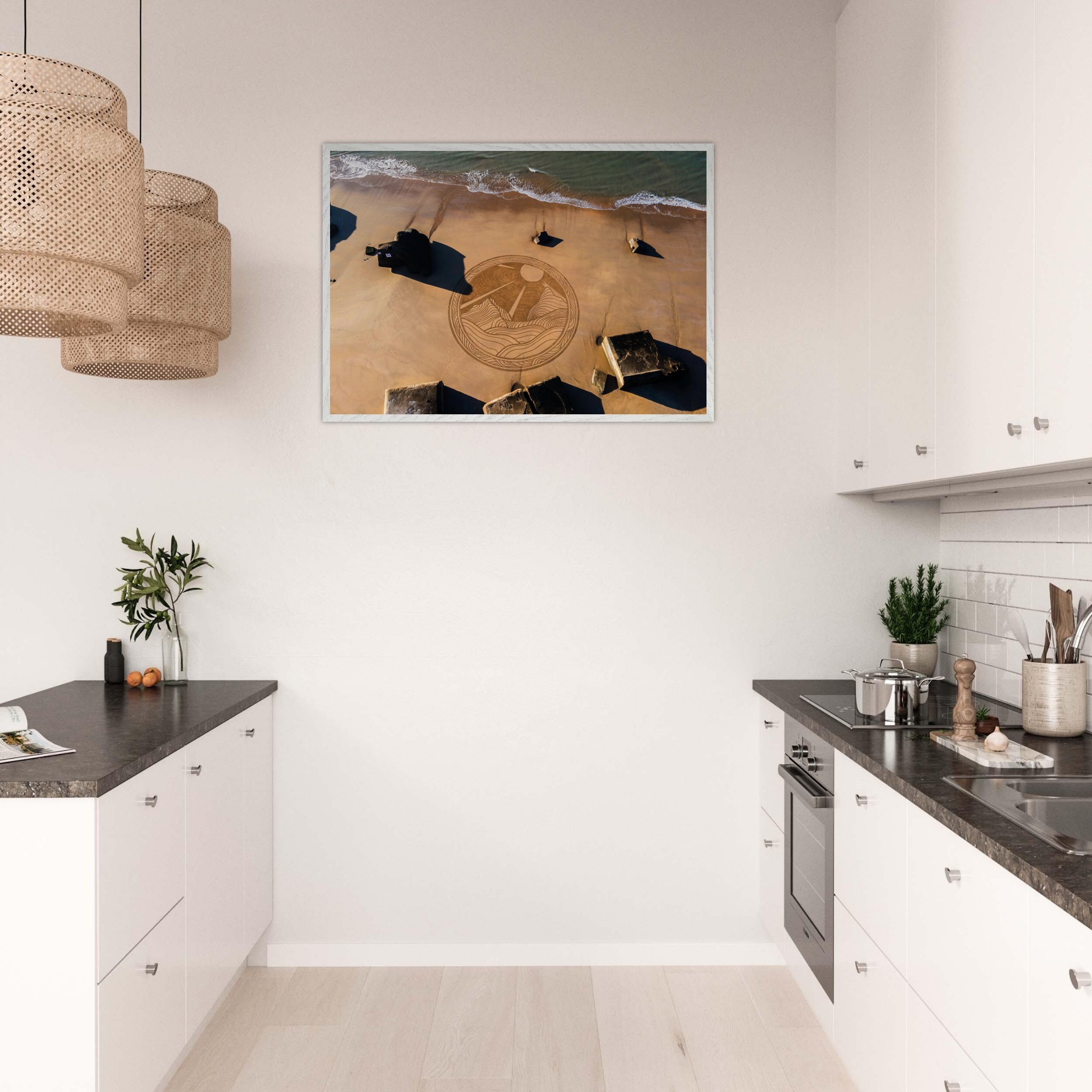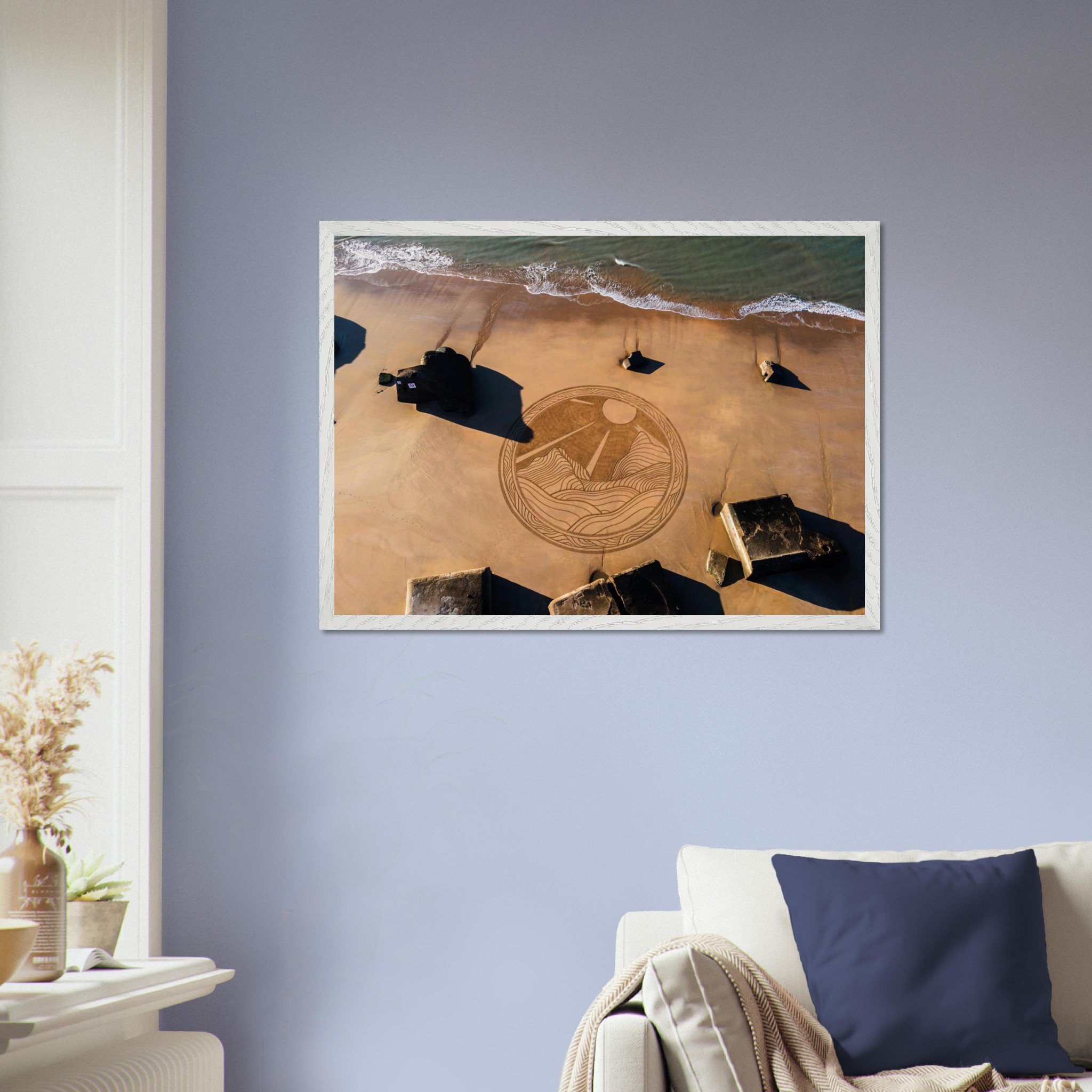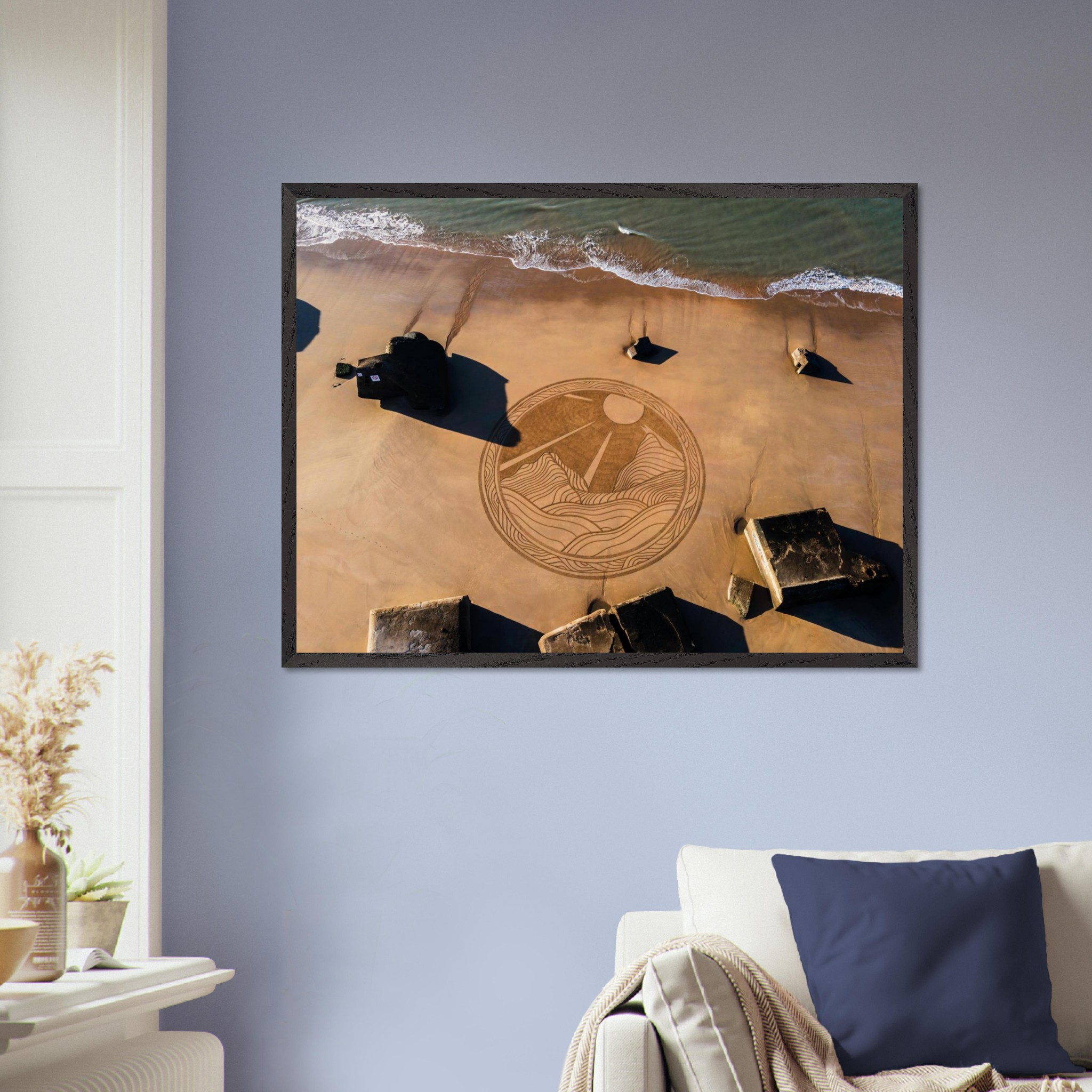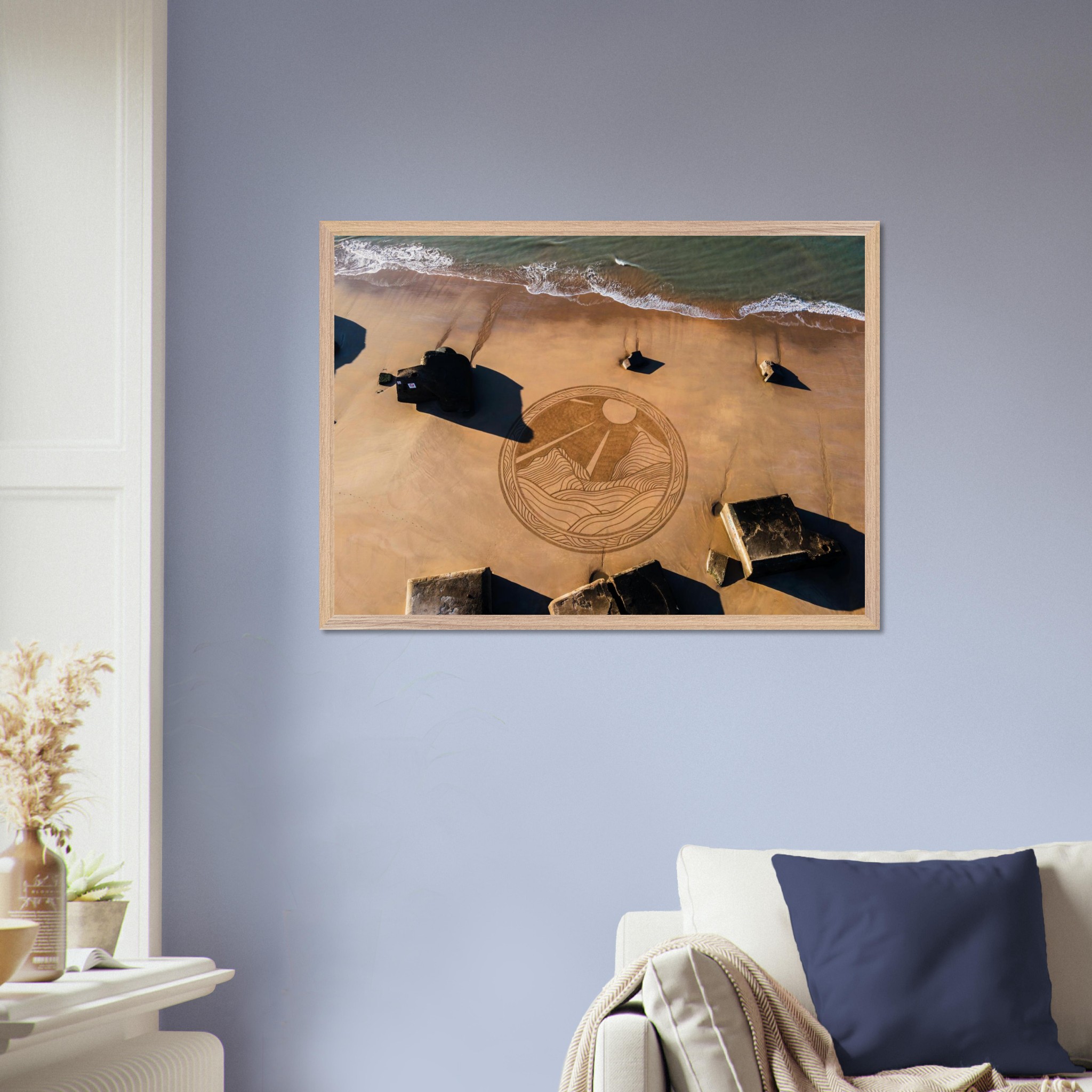 Un soleil éclatant se lève derrière des montagnes sculptées dans le sable, encerclées par un tracé parfait. Les bunkers, témoins muets de l’Histoire, encadrent l’œuvre et en renforcent la profondeur.