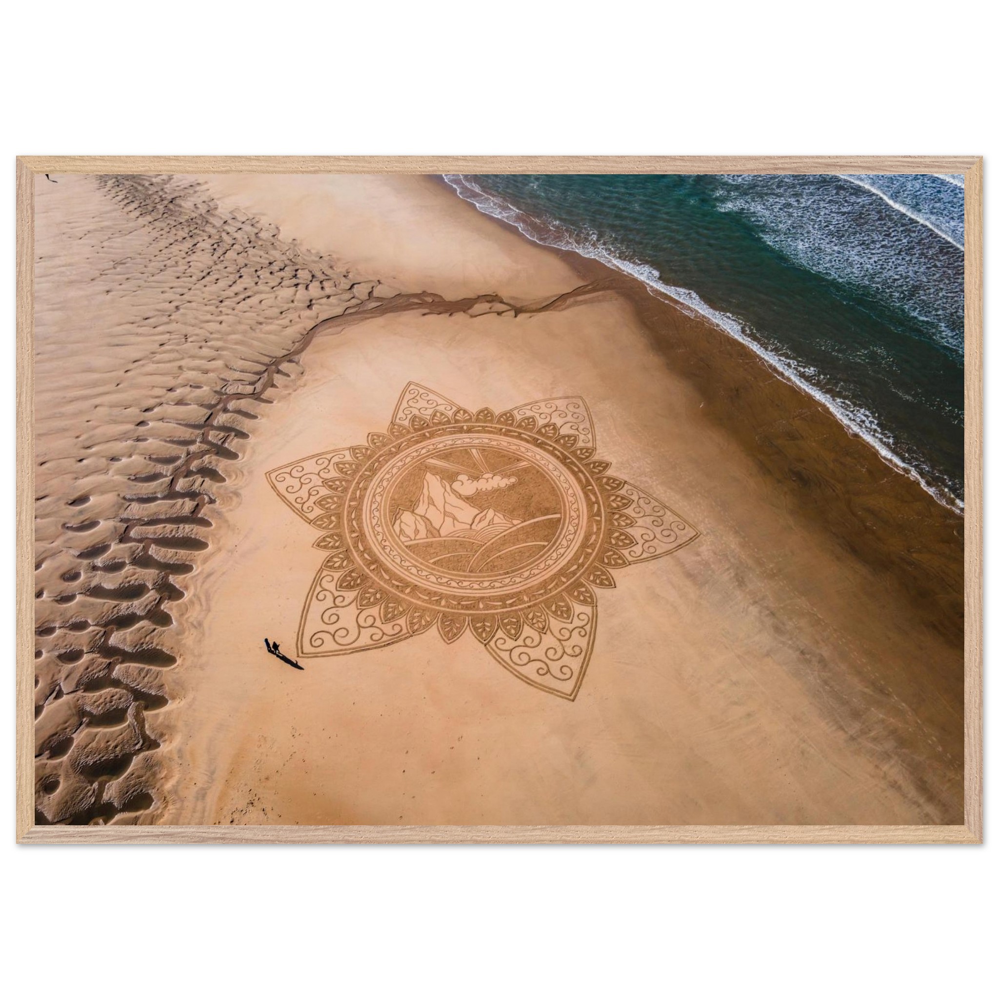 Le dessin circulaire évoque la plénitude des mandalas traditionnels, tandis que le paysage central invite à l’évasion et à l’élévation.