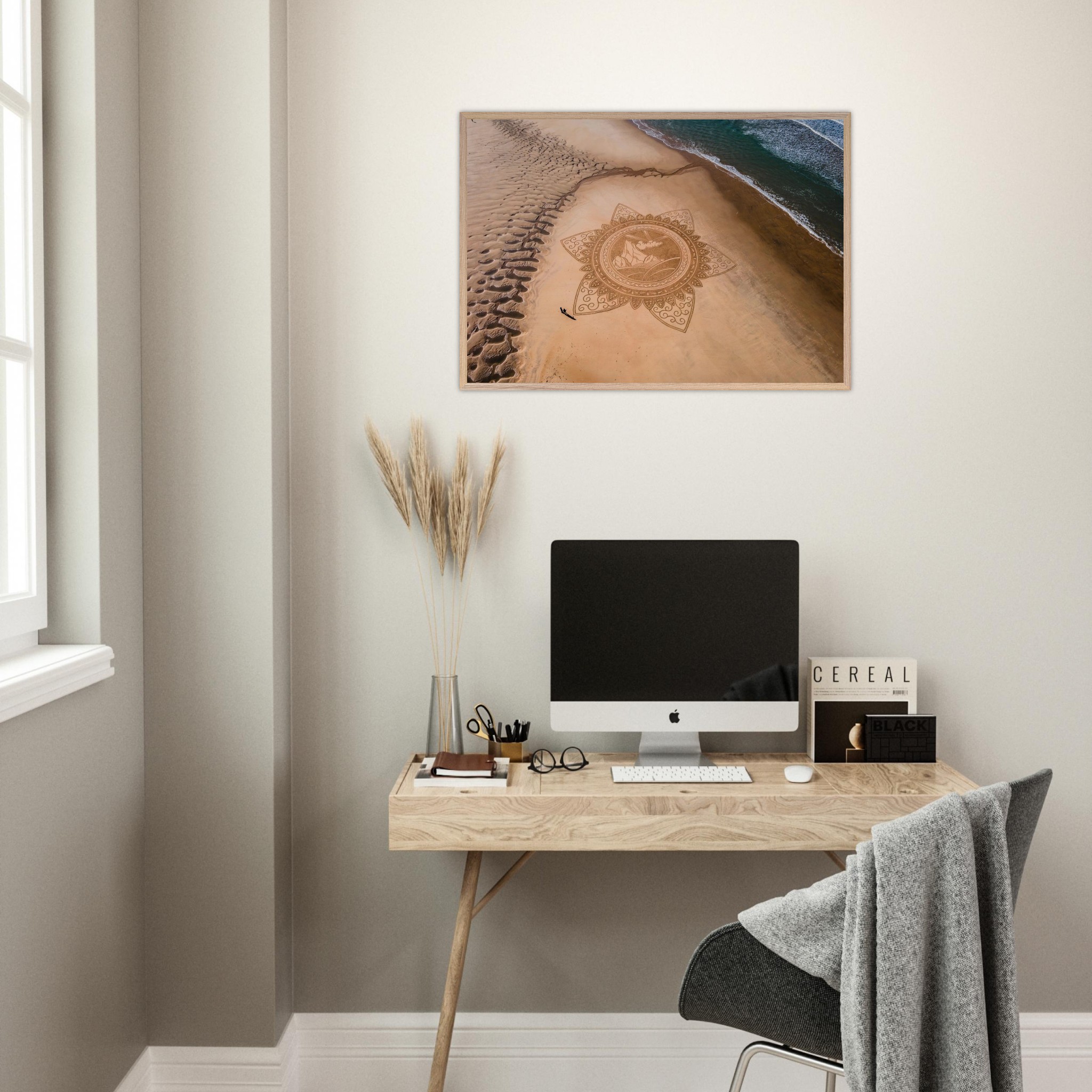 Suspendue au mur, l’œuvre prend toute sa dimension : à la fois graphique et méditative, elle capte le regard et inspire le calme intérieur.