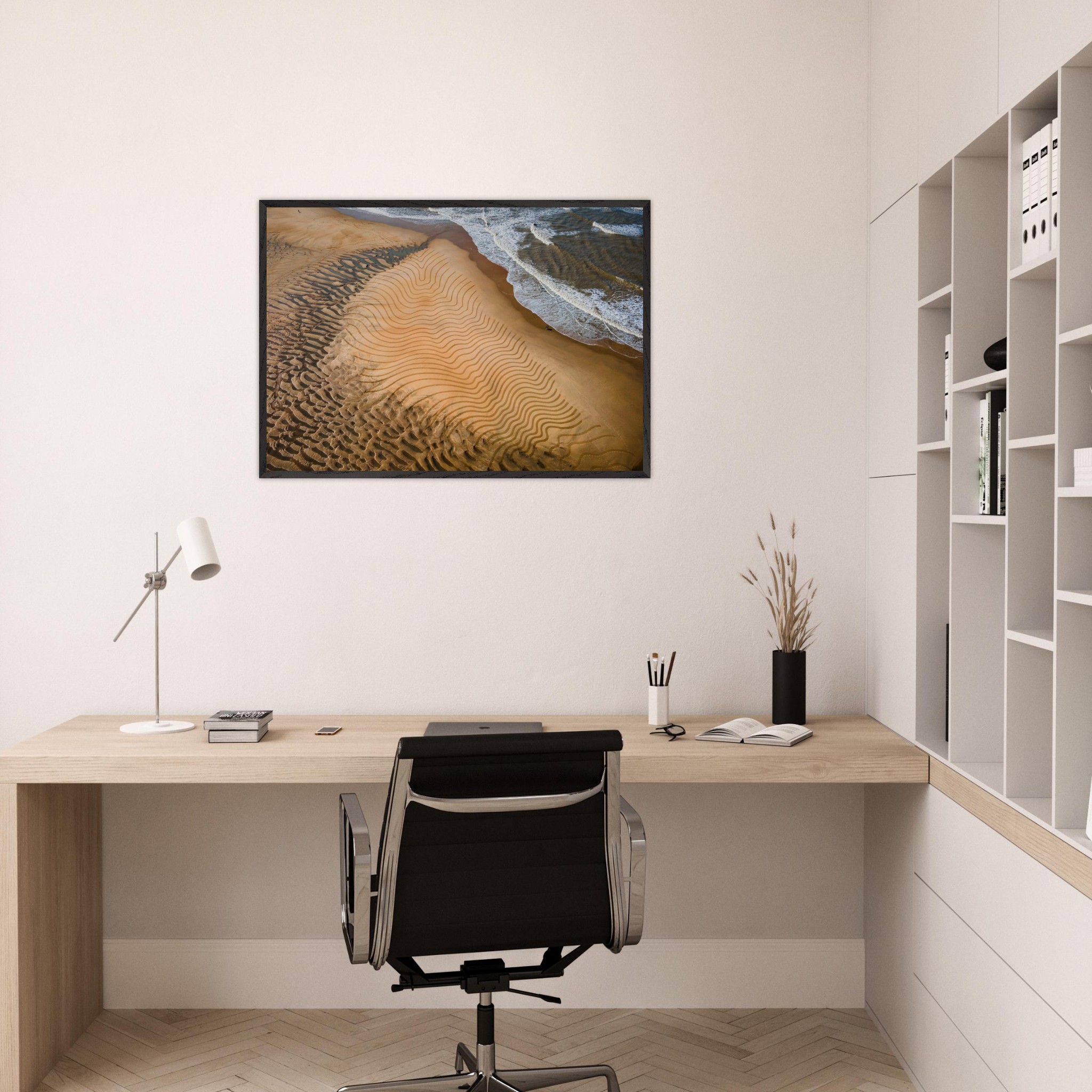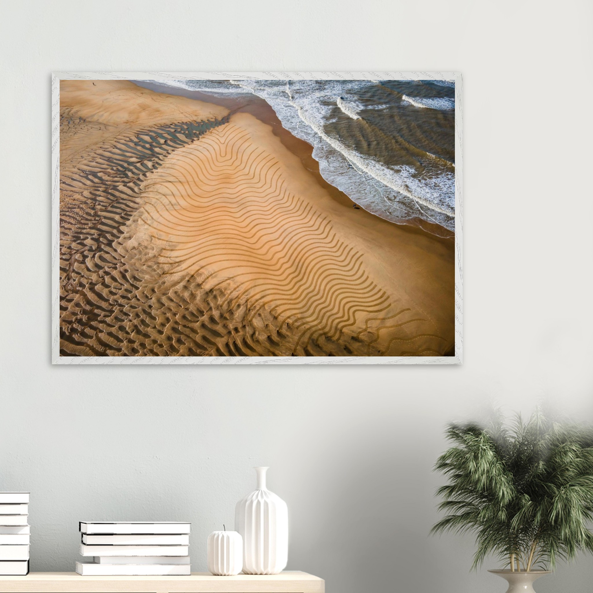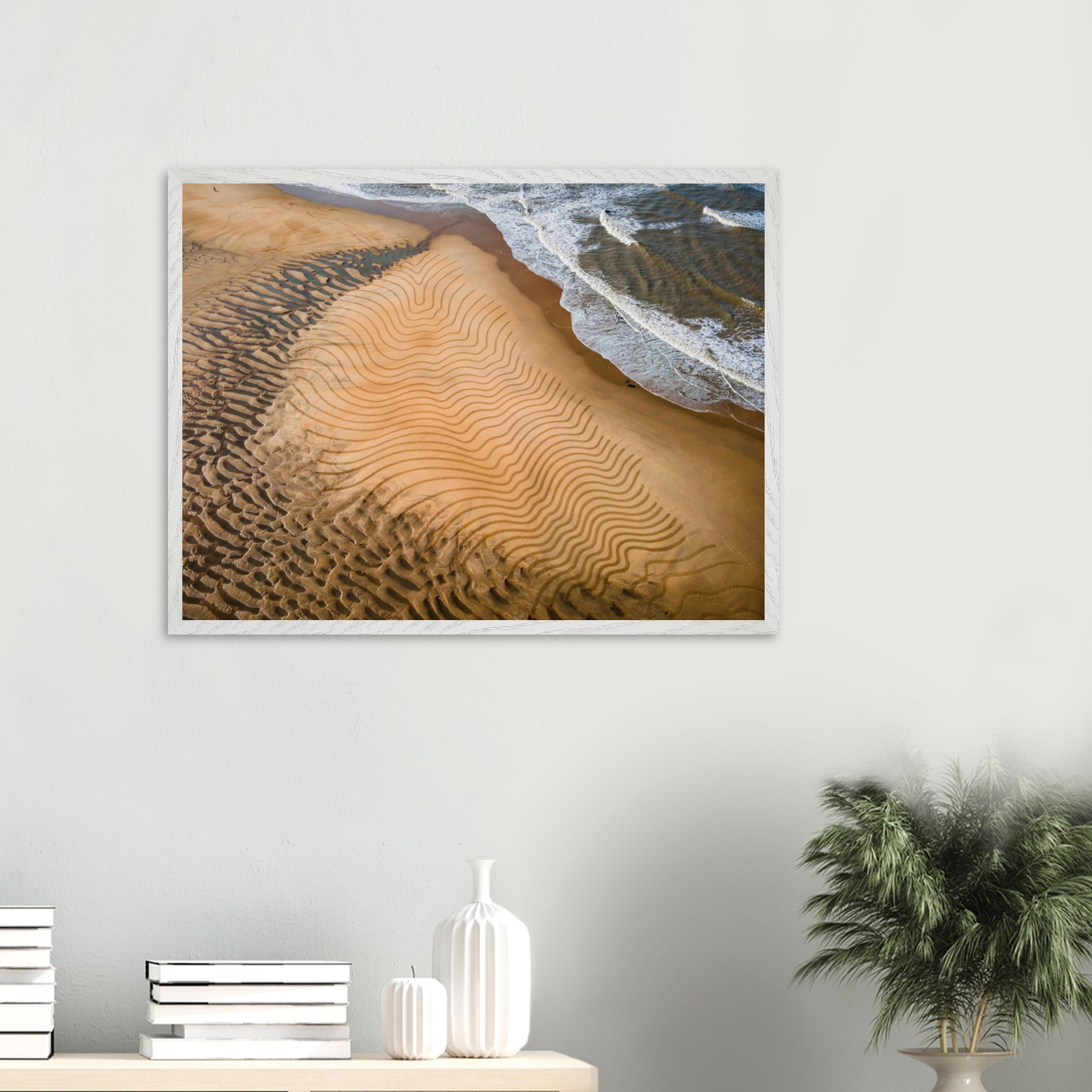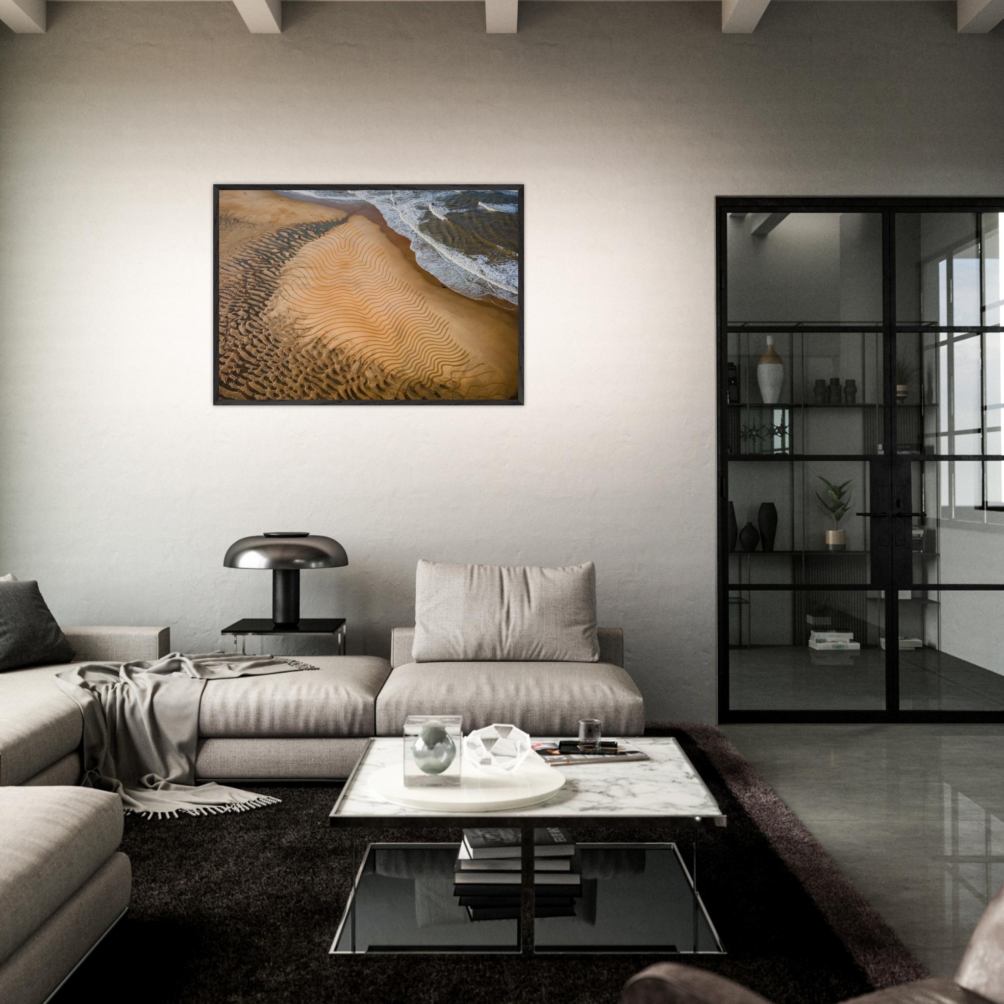 Une fresque effet mer minérale aux lignes organiques, sublimée dans un encadrement premium prêt à accrocher.