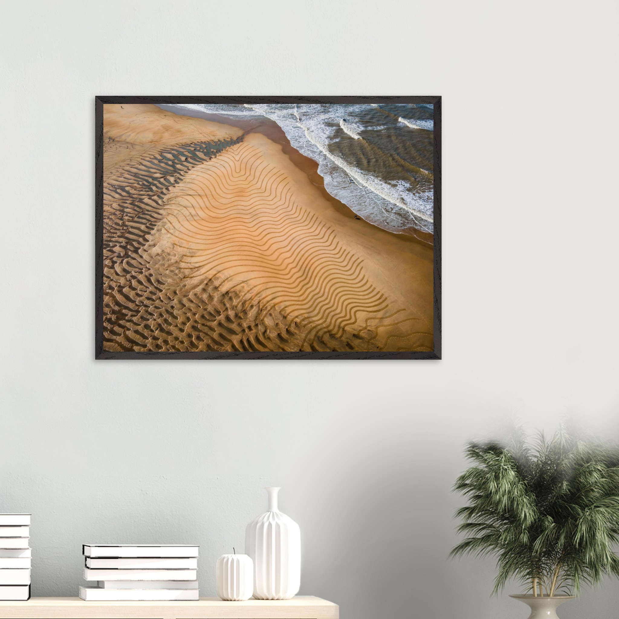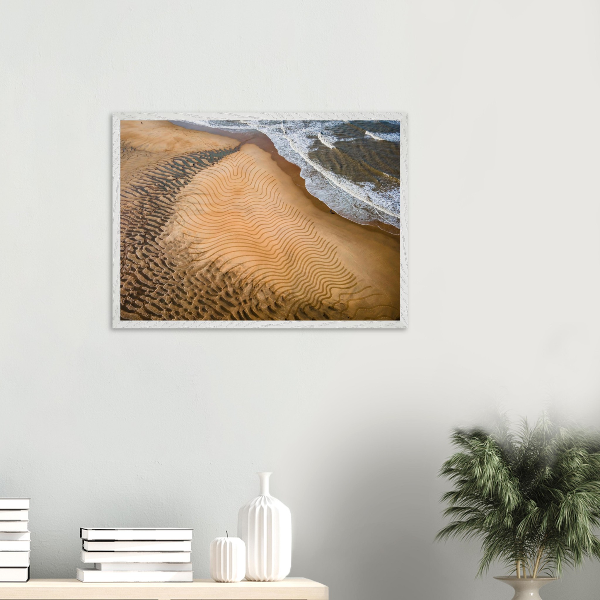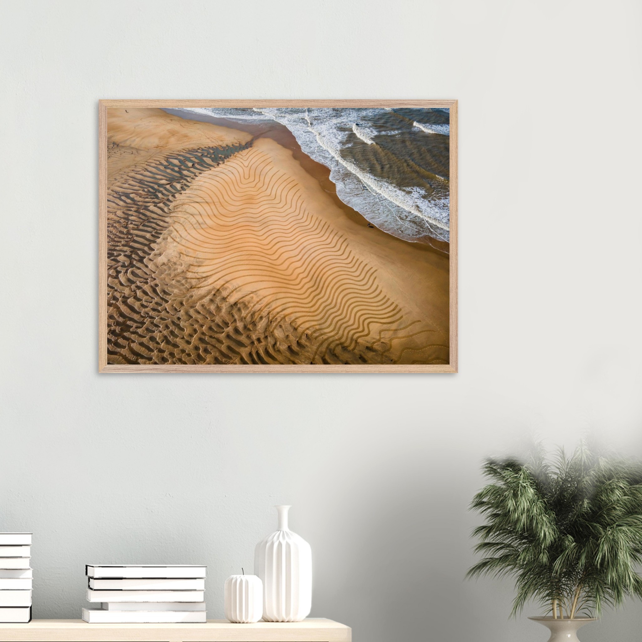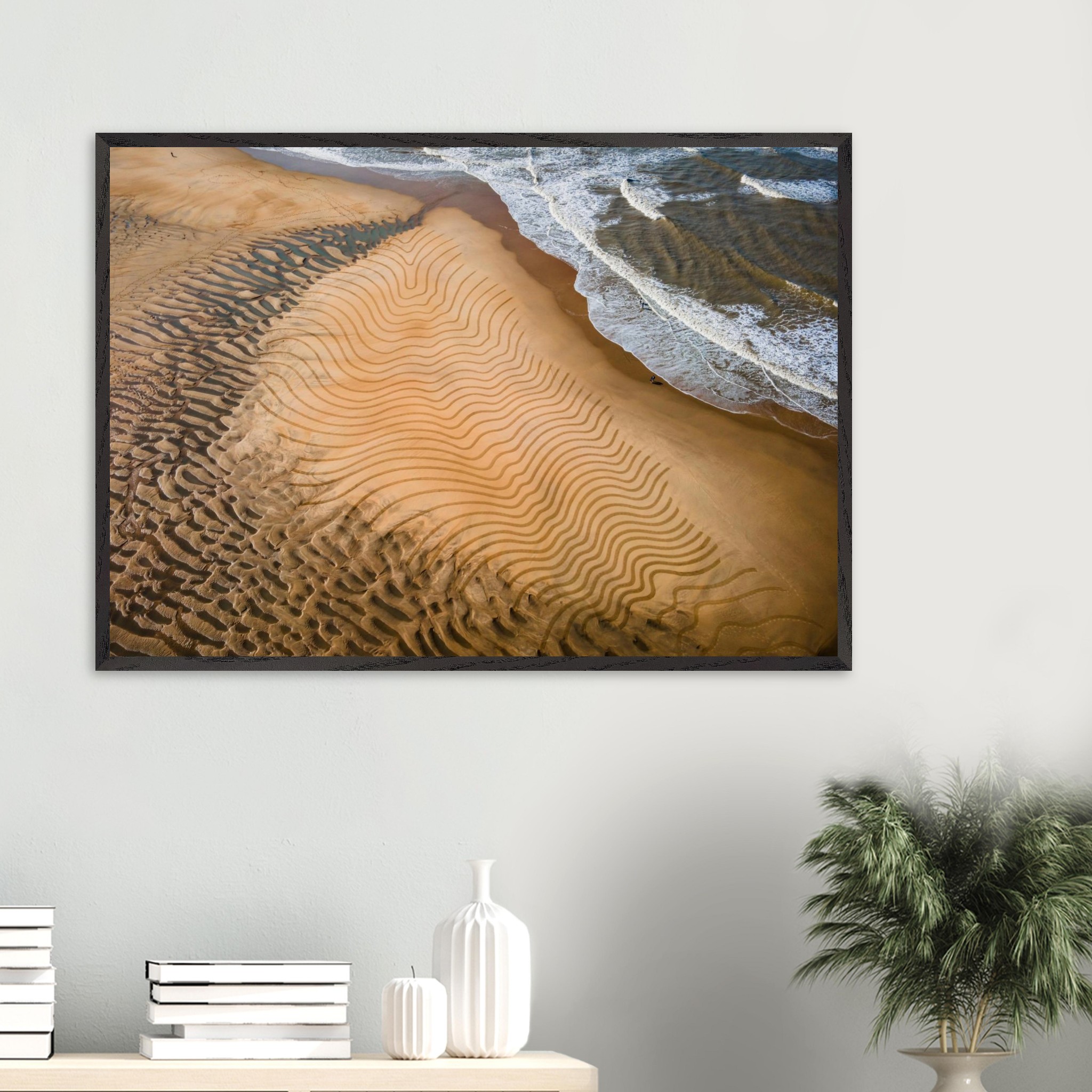 Une fresque effet mer minérale aux lignes organiques, sublimée dans un encadrement premium prêt à accrocher.