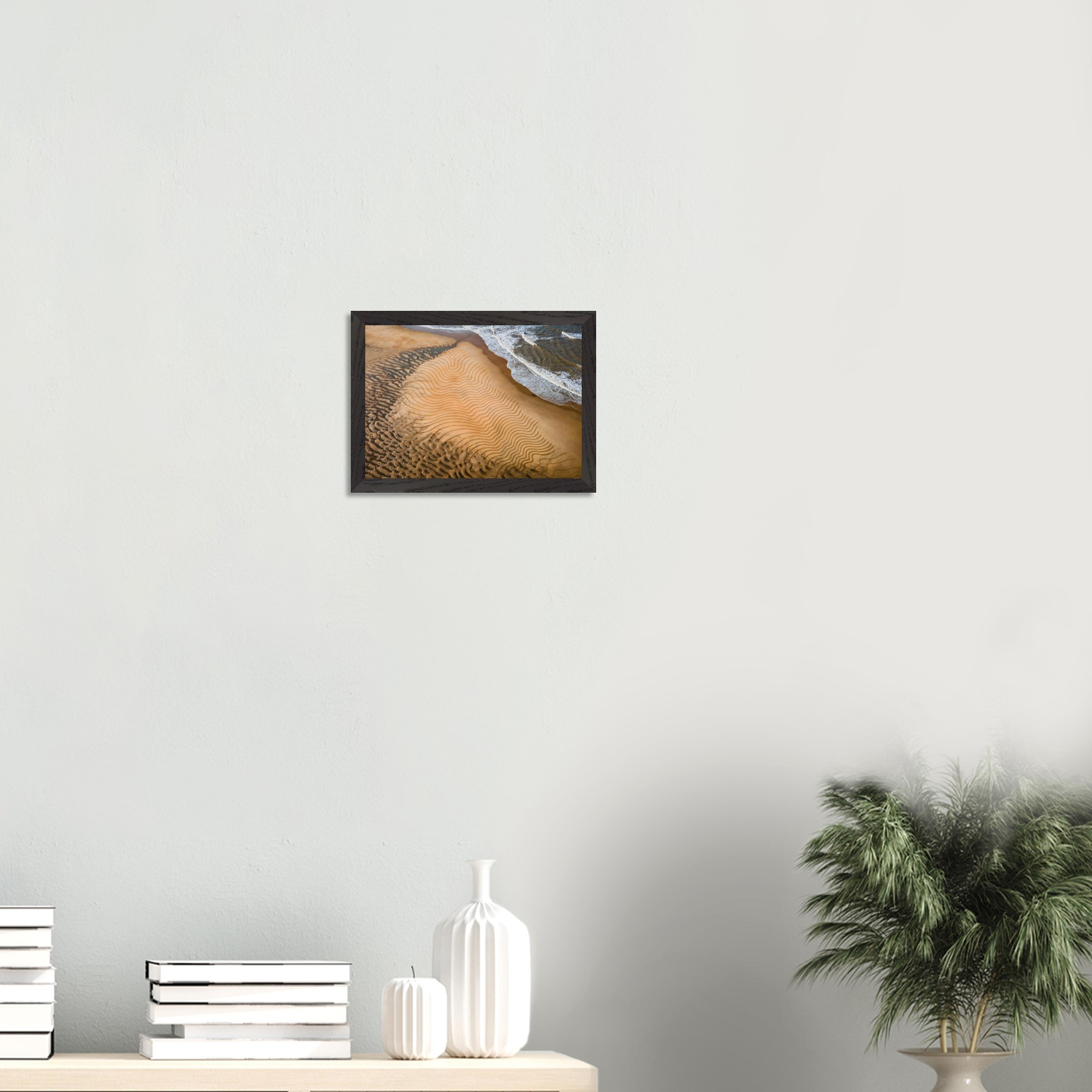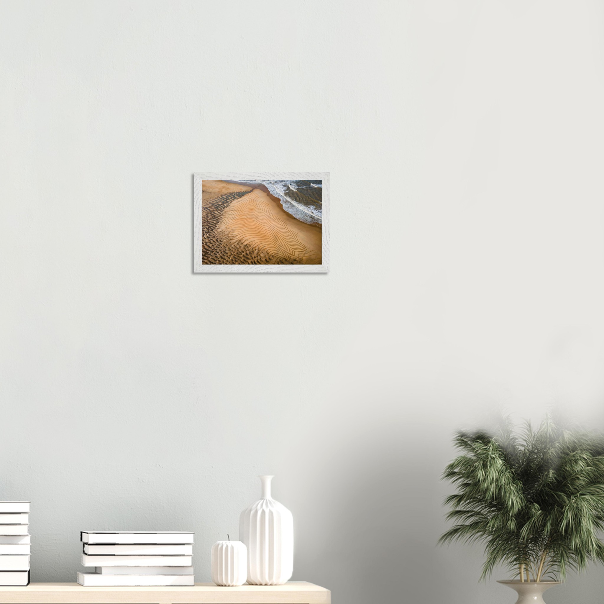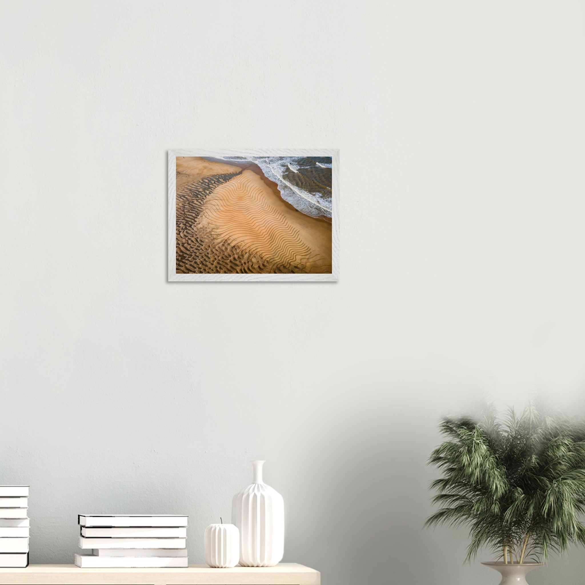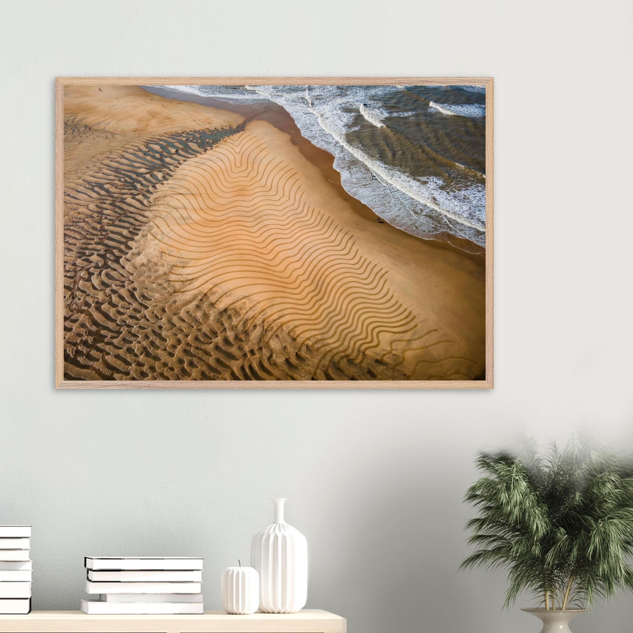 Une fresque effet mer minérale aux lignes organiques, sublimée dans un encadrement premium prêt à accrocher.