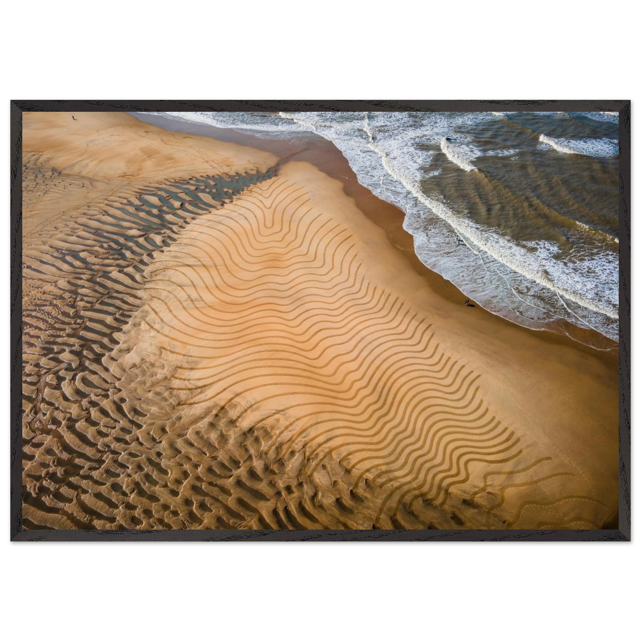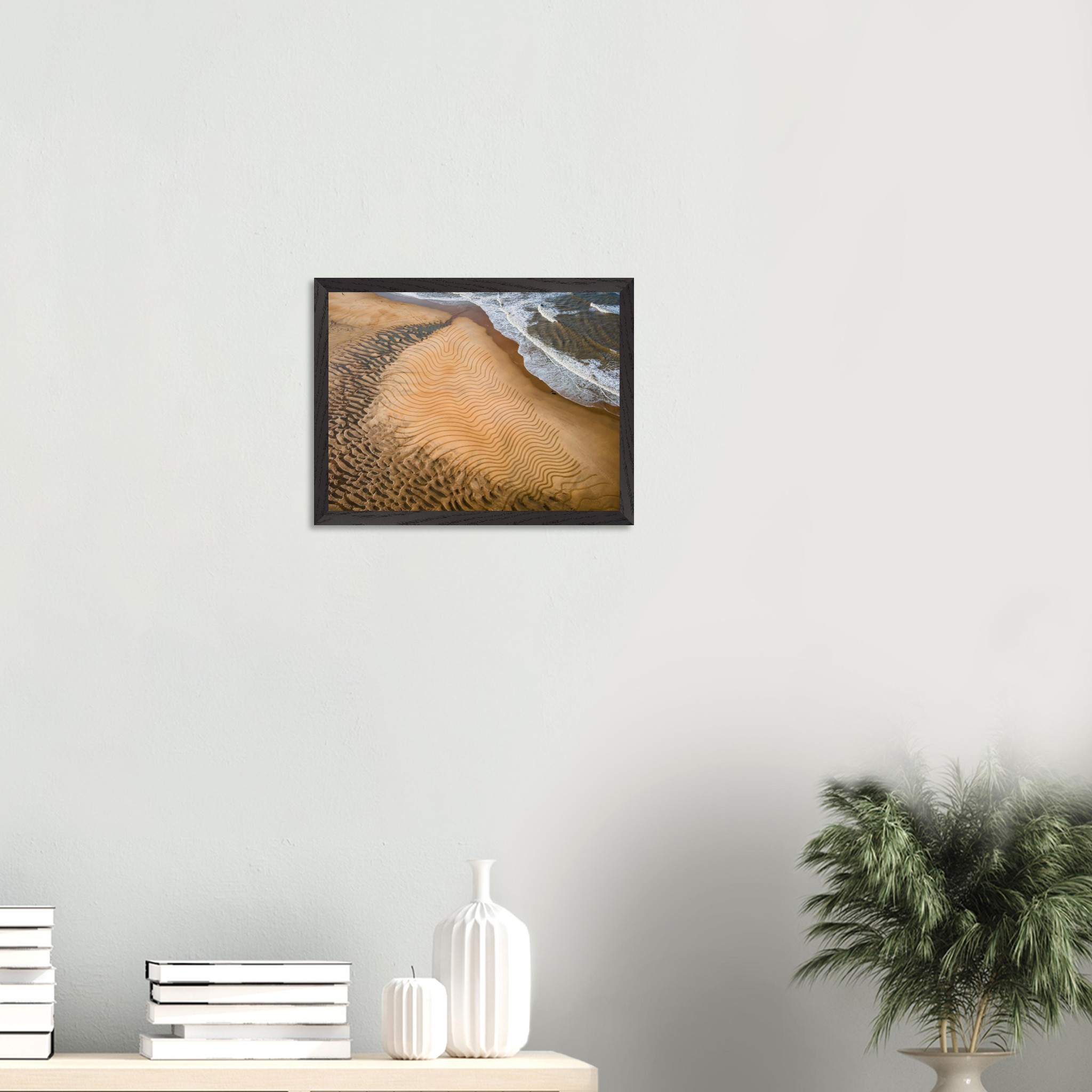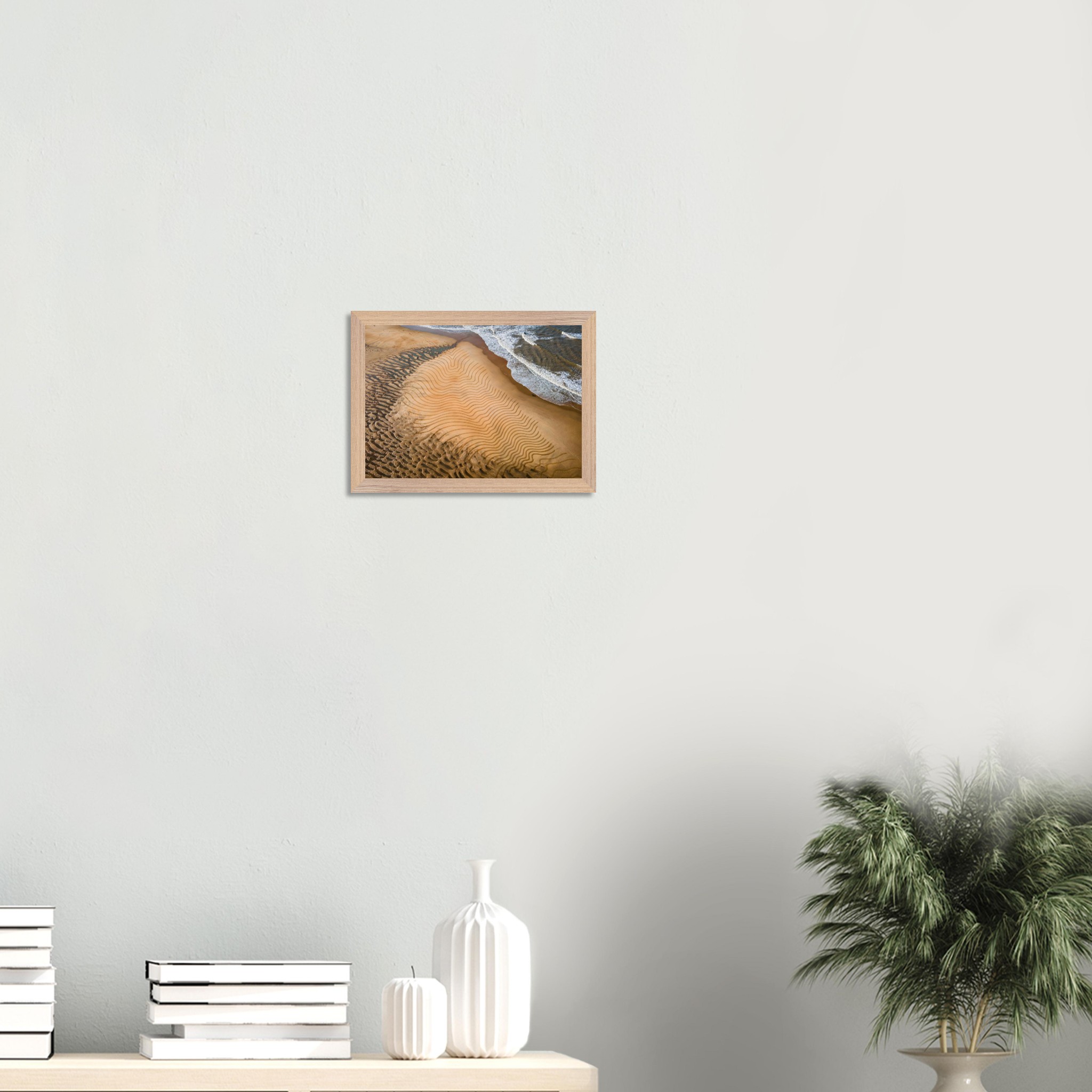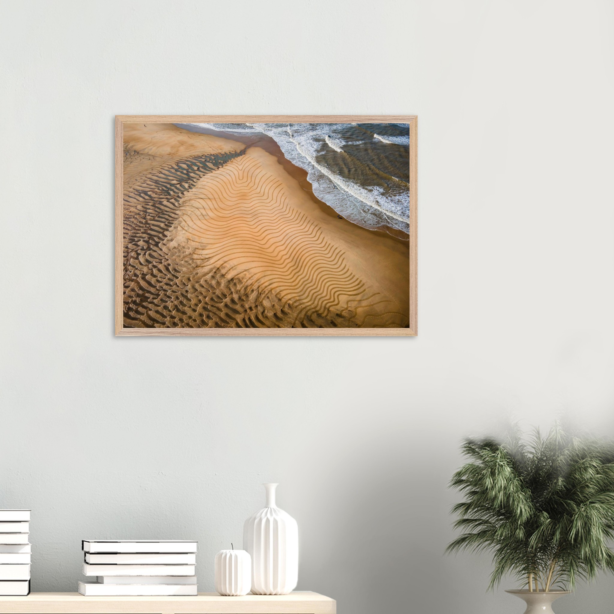 Une fresque effet mer minérale aux lignes organiques, sublimée dans un encadrement premium prêt à accrocher.