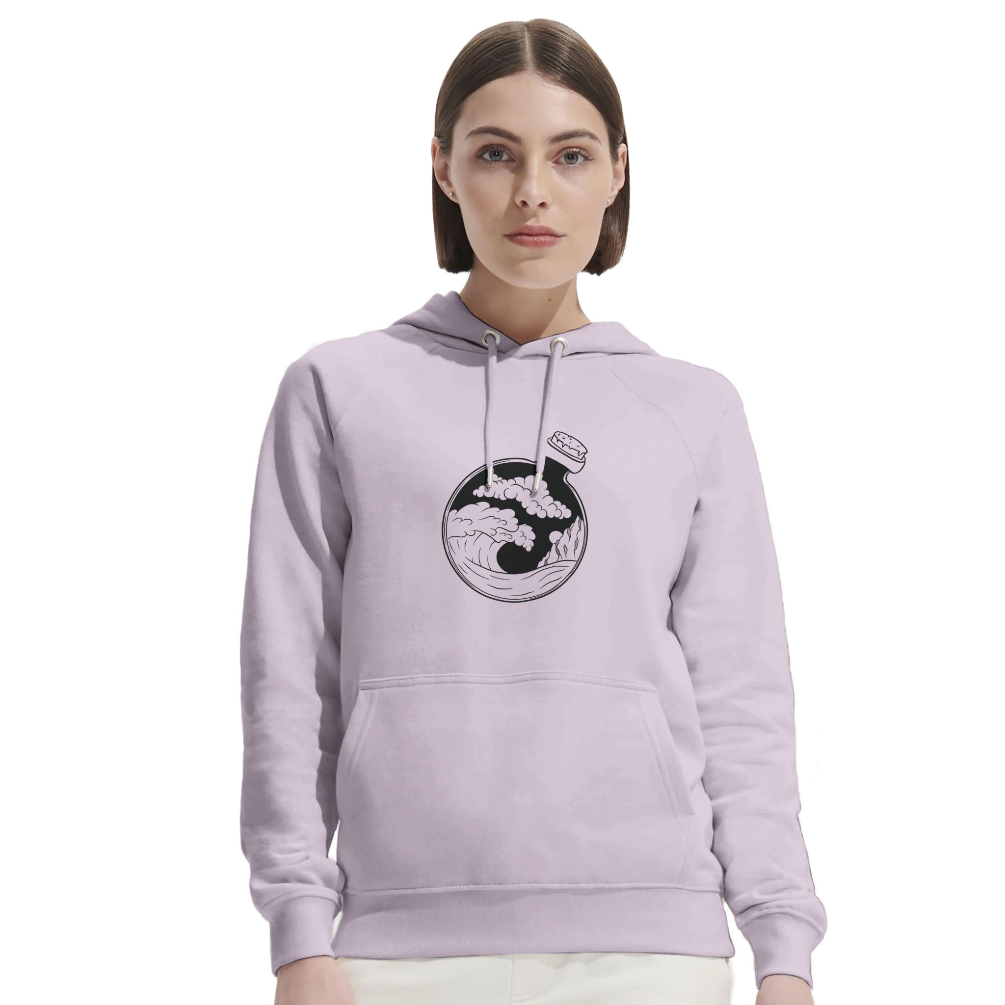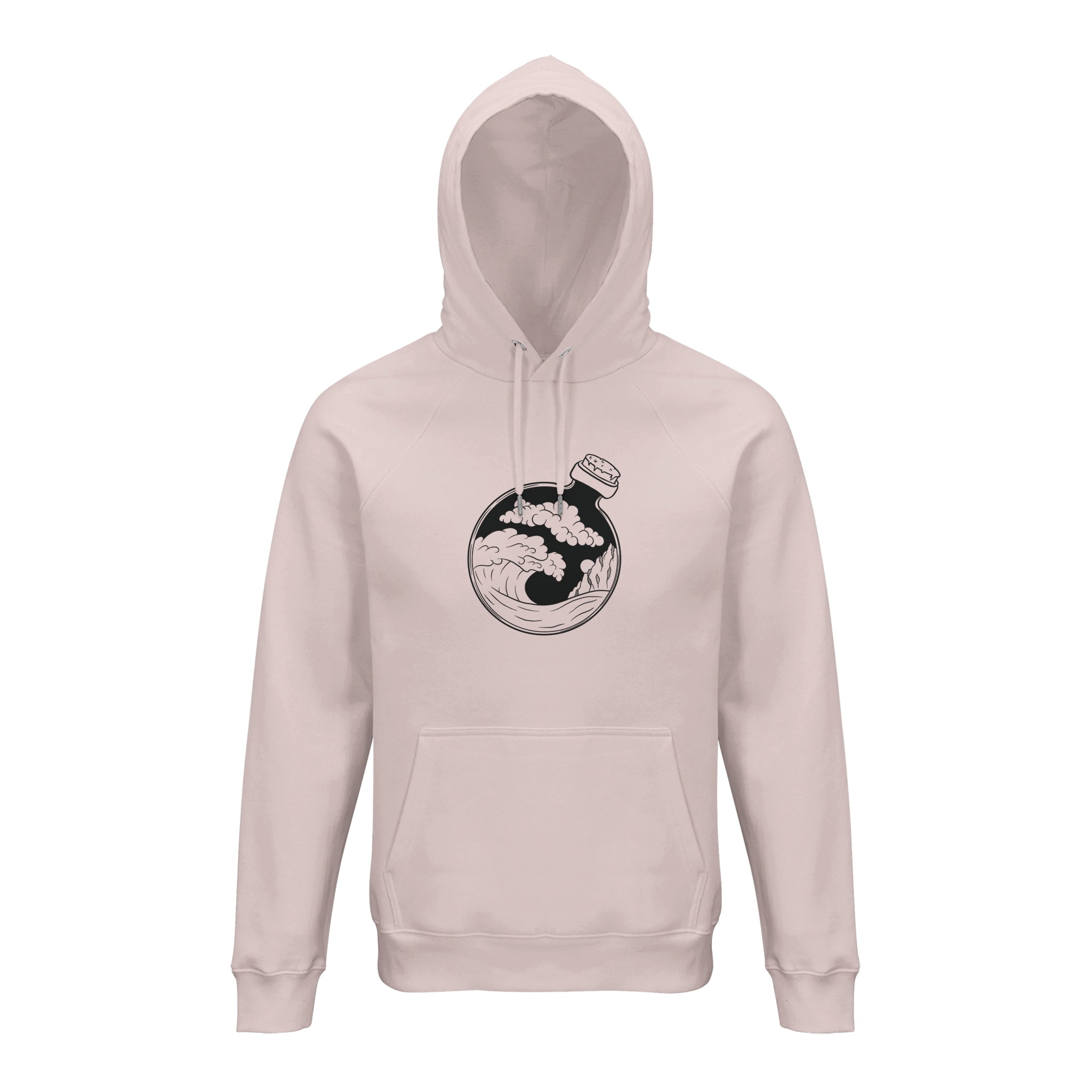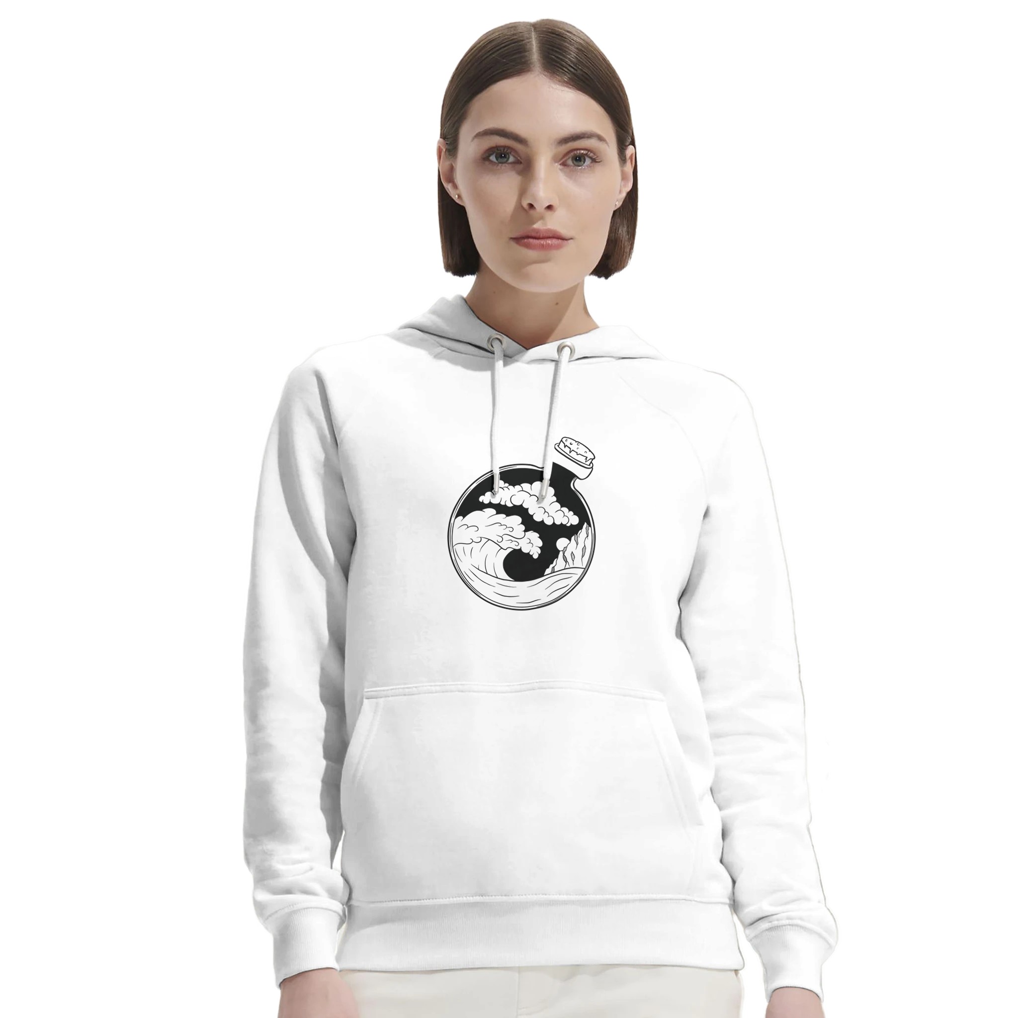 Un hoodie bio visuel noir « Earth in a Bottle », créatif et intemporel.