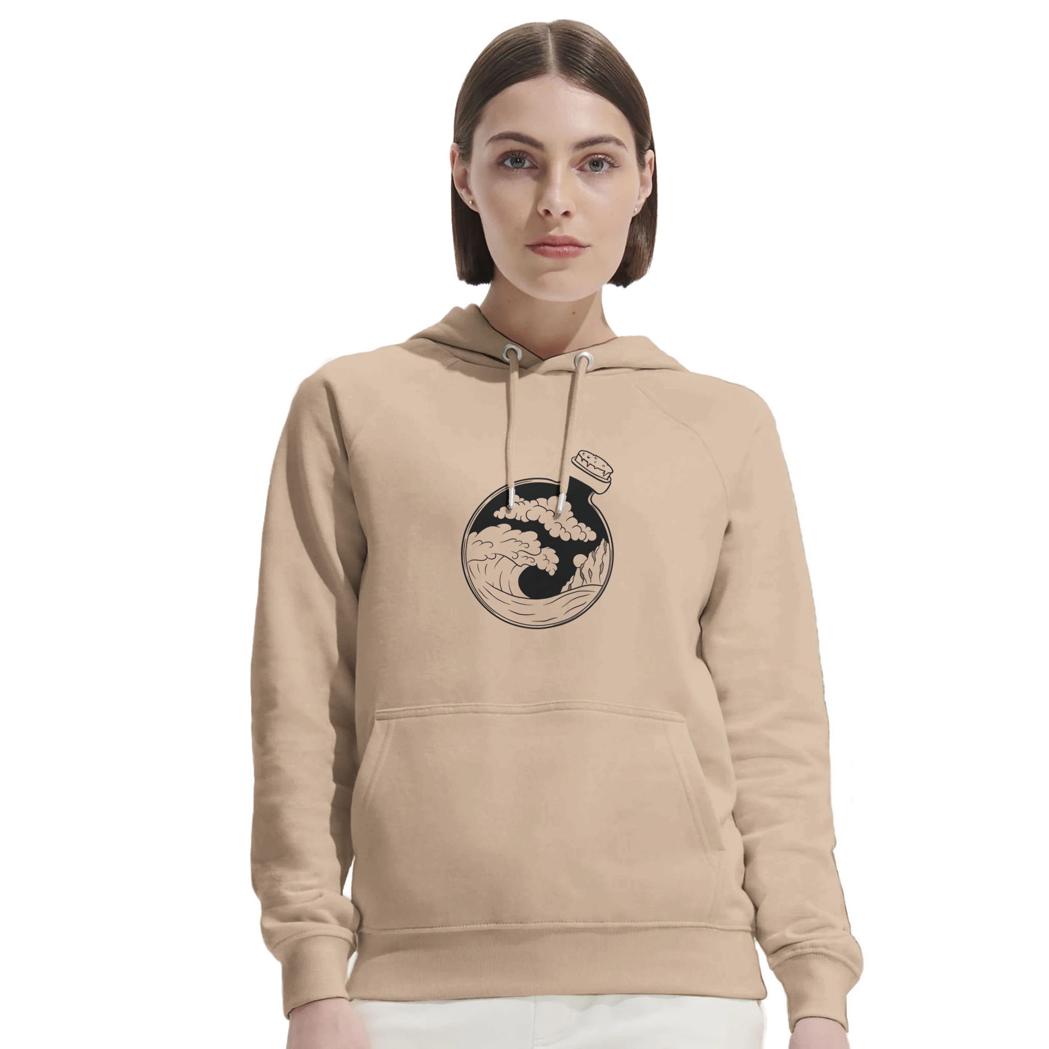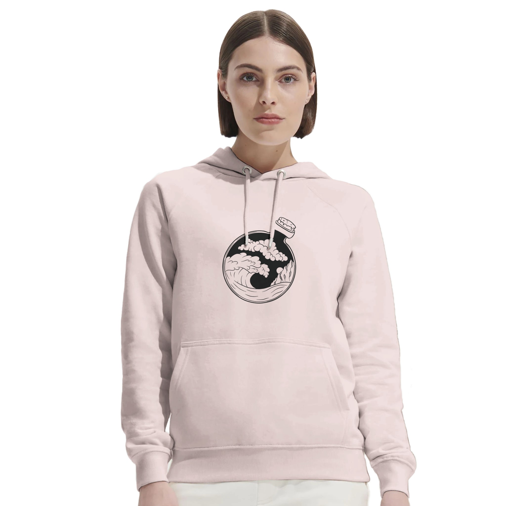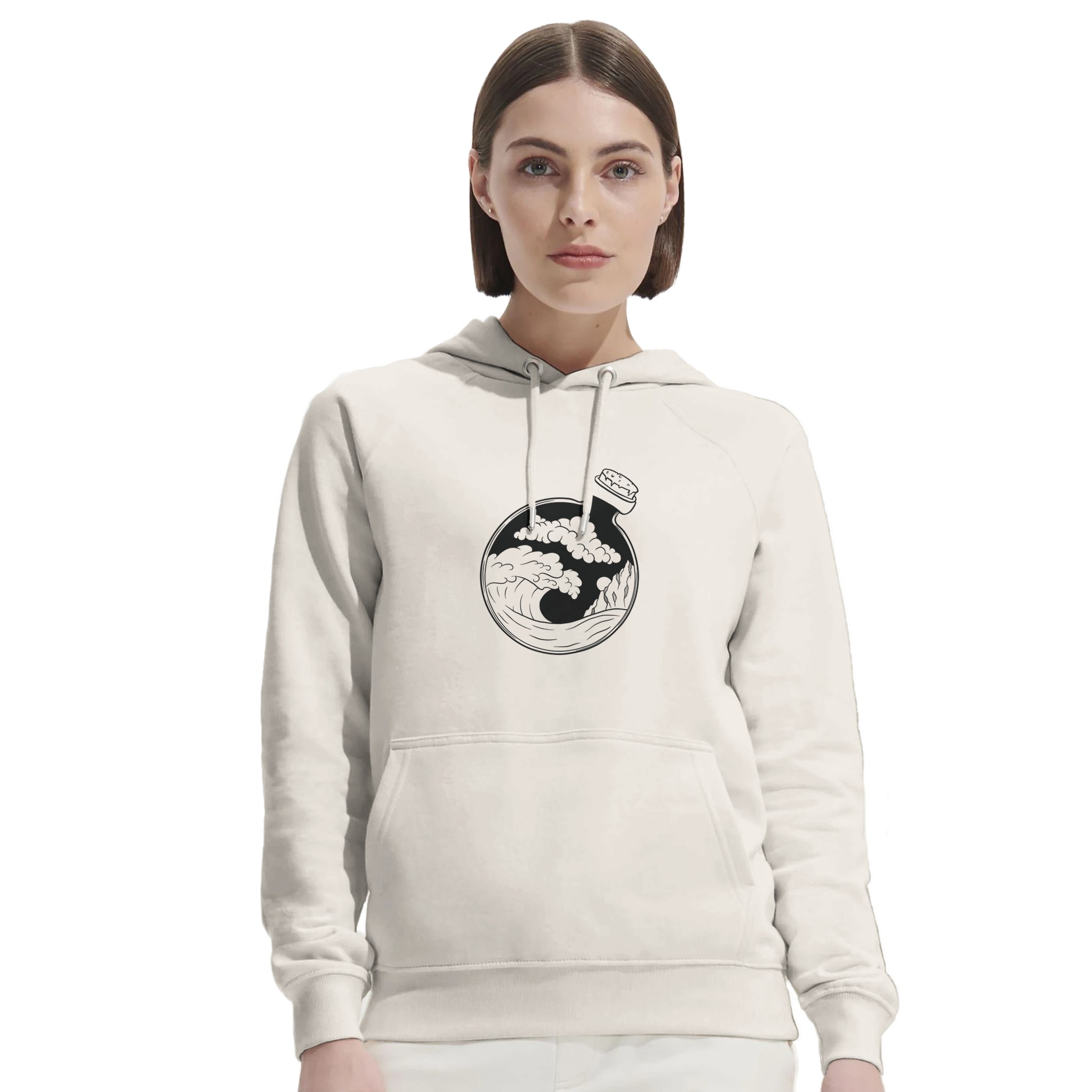 Un hoodie bio visuel noir « Earth in a Bottle », créatif et intemporel.