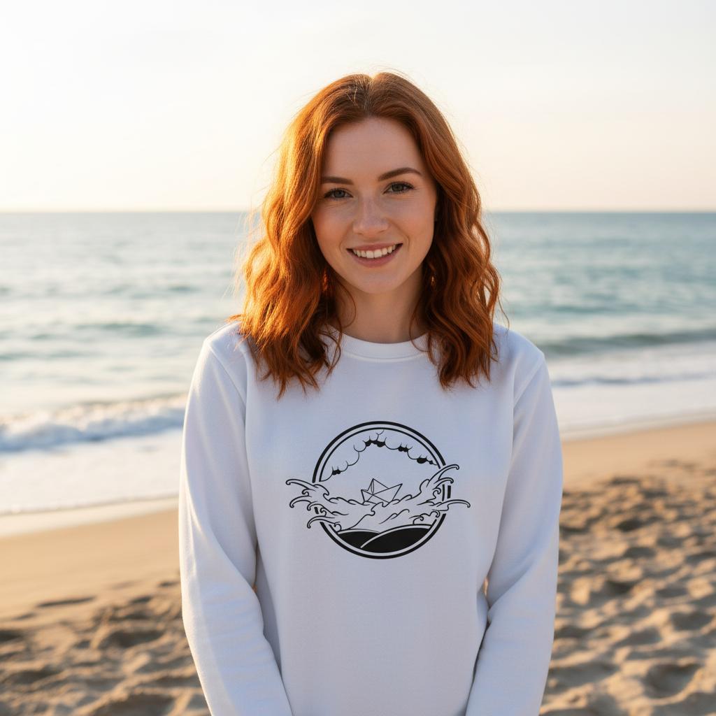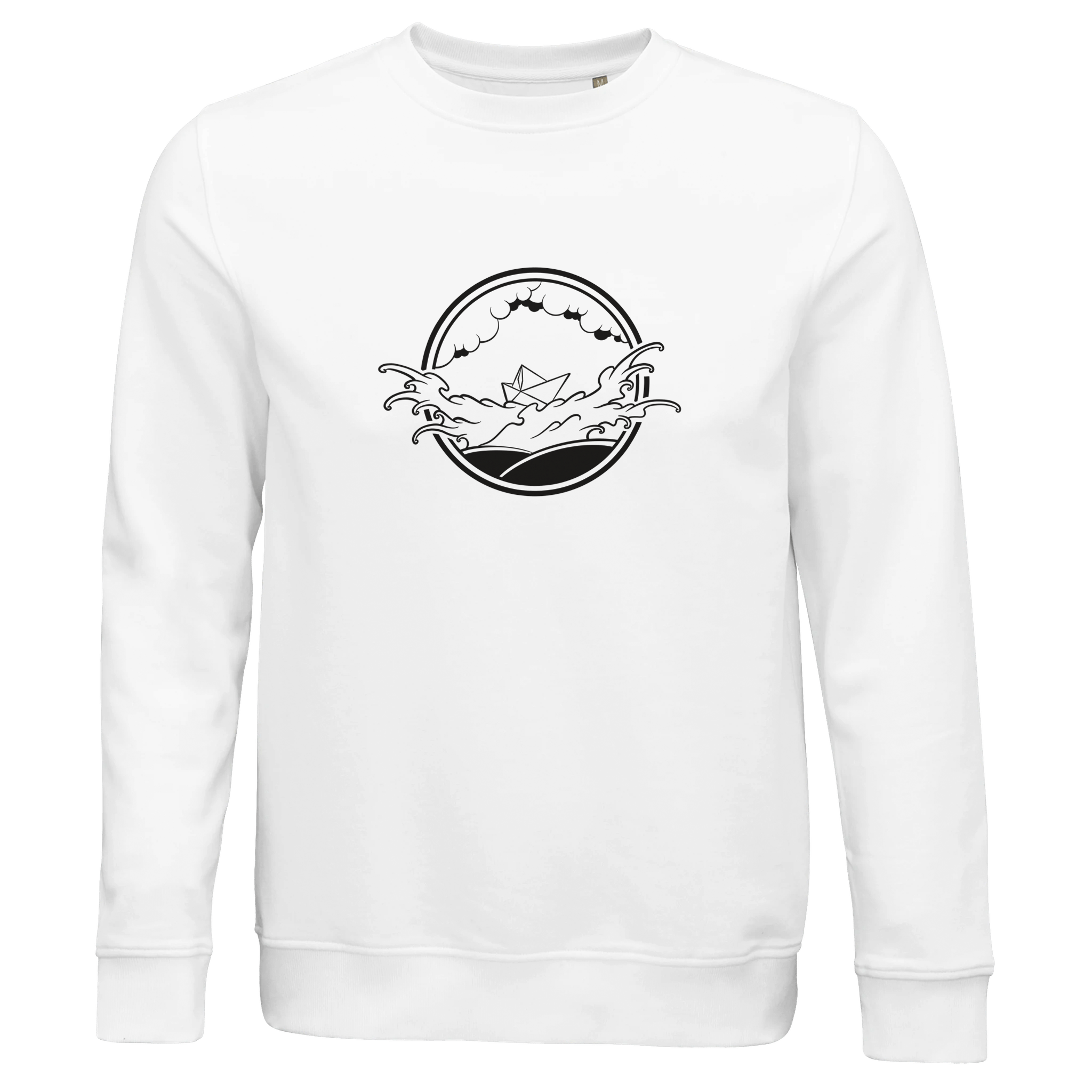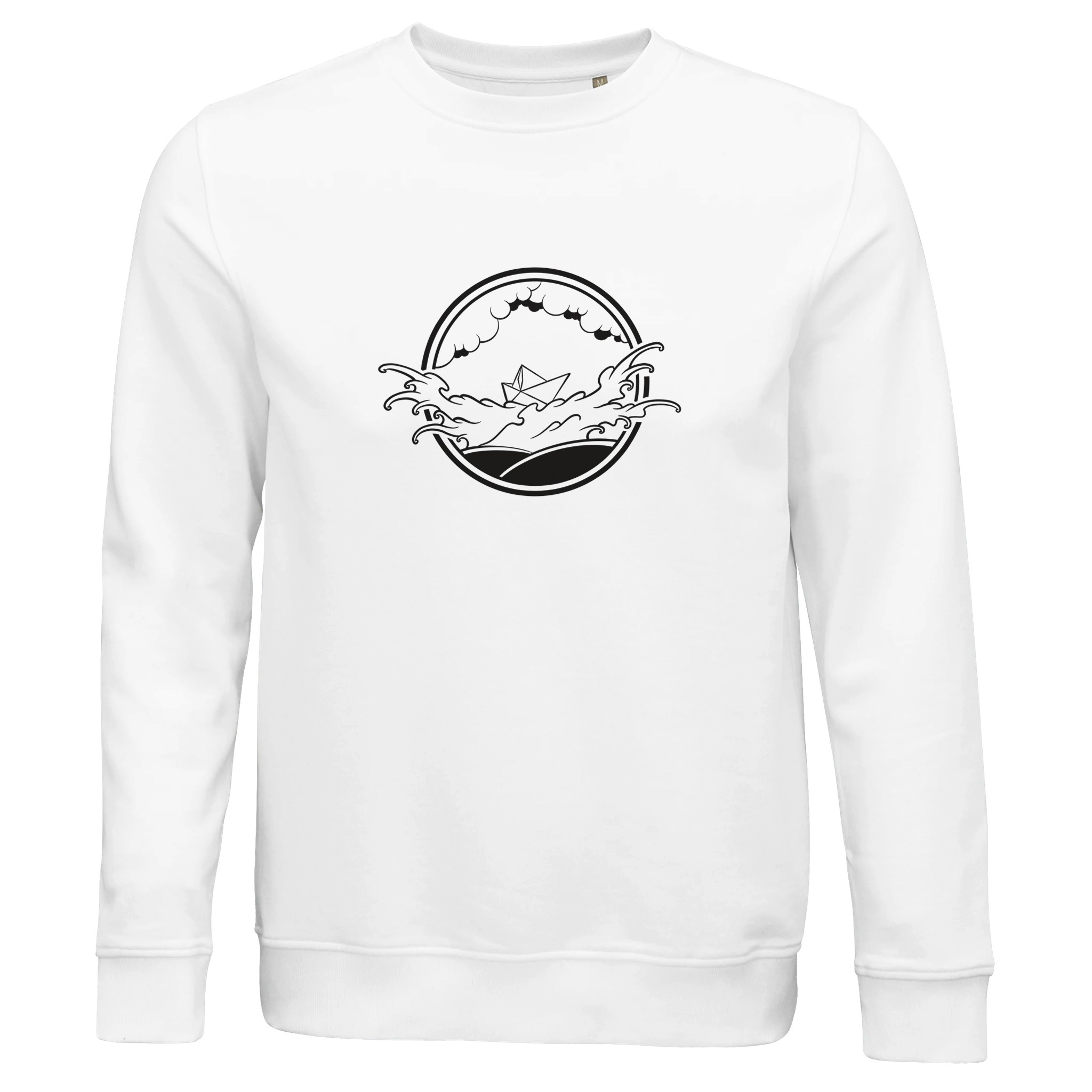 Enveloppez-vous dans le confort du sweat bio visuel noir « Petit Bateau ». Ce design met en avant la fragilité et la force de la mer à travers un petit bateau qui brave les vagues. Chaud, respirant et durable, il est parfait pour associer style urbain et engagement artistique.