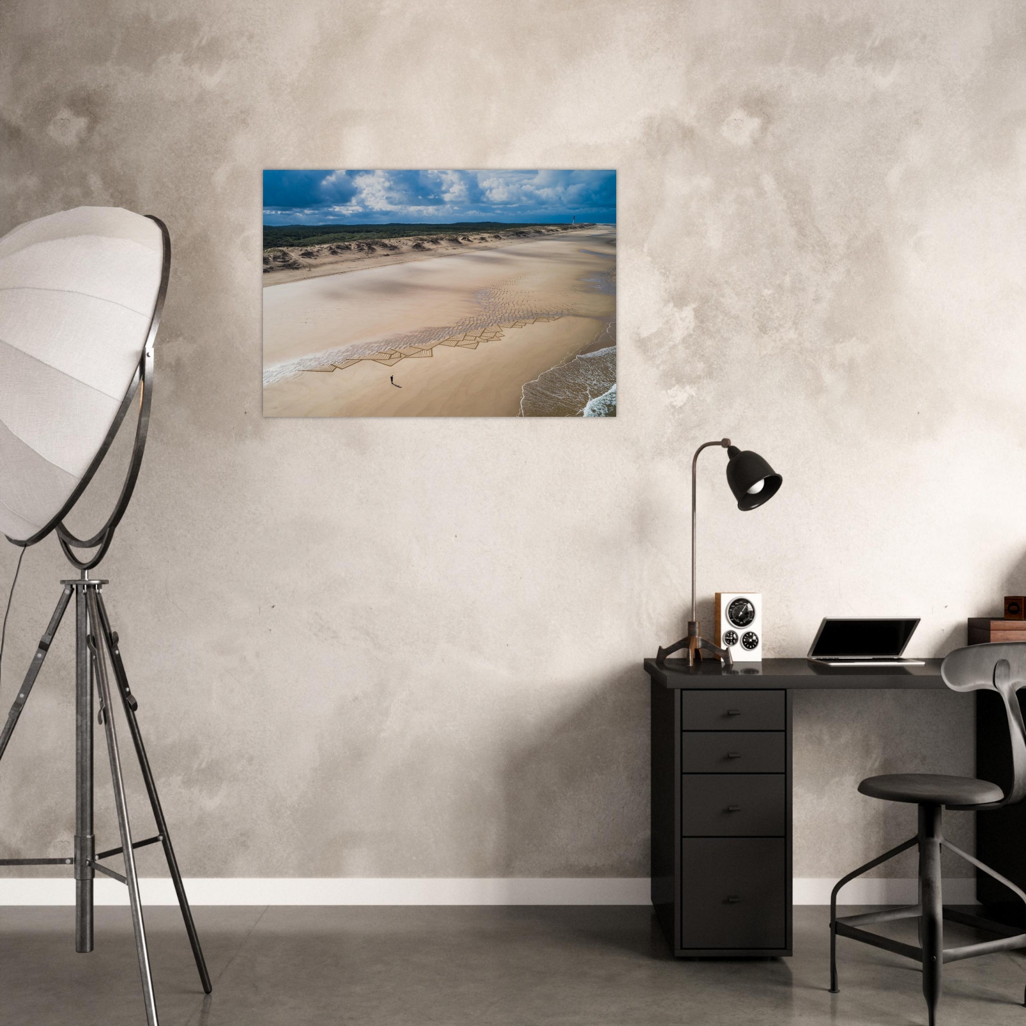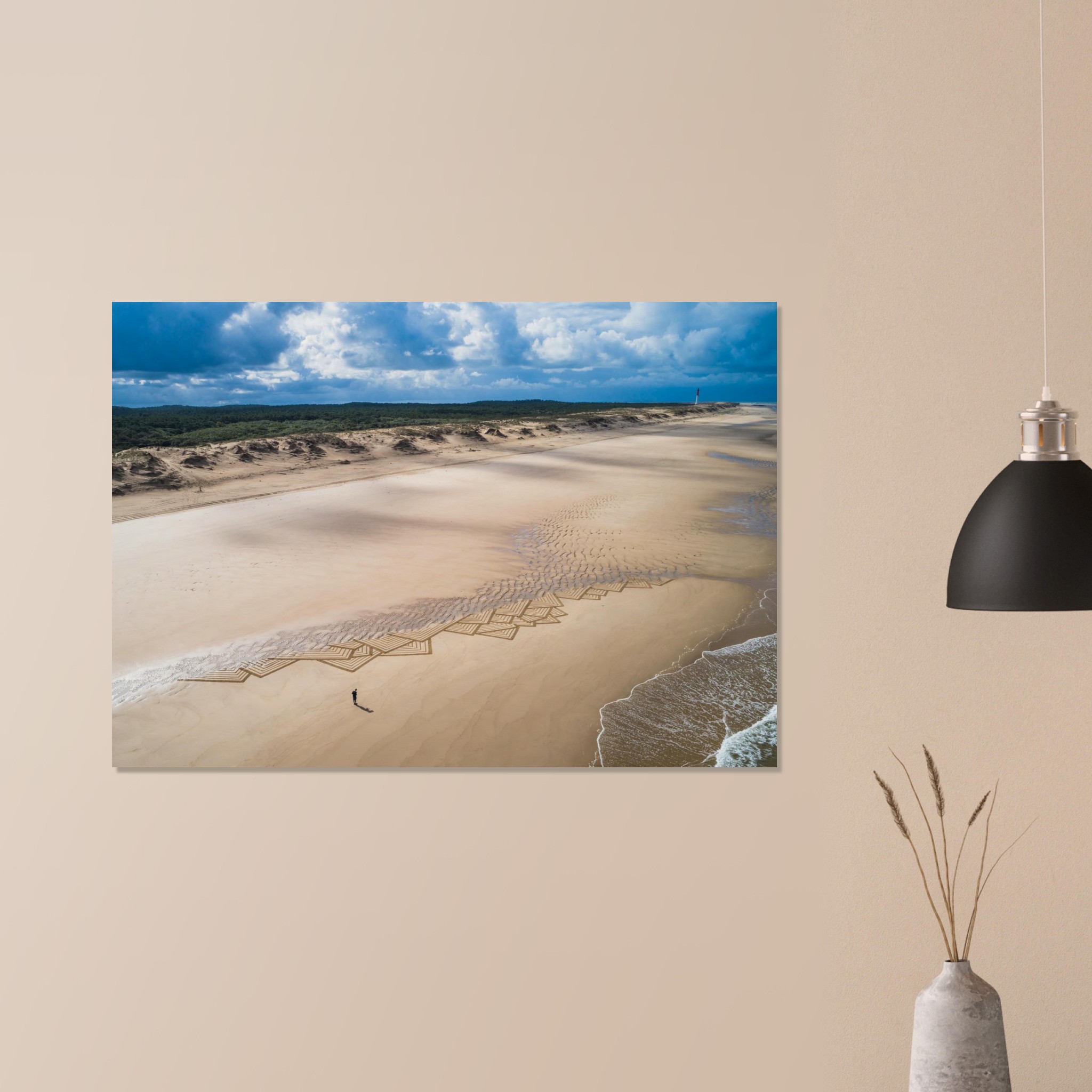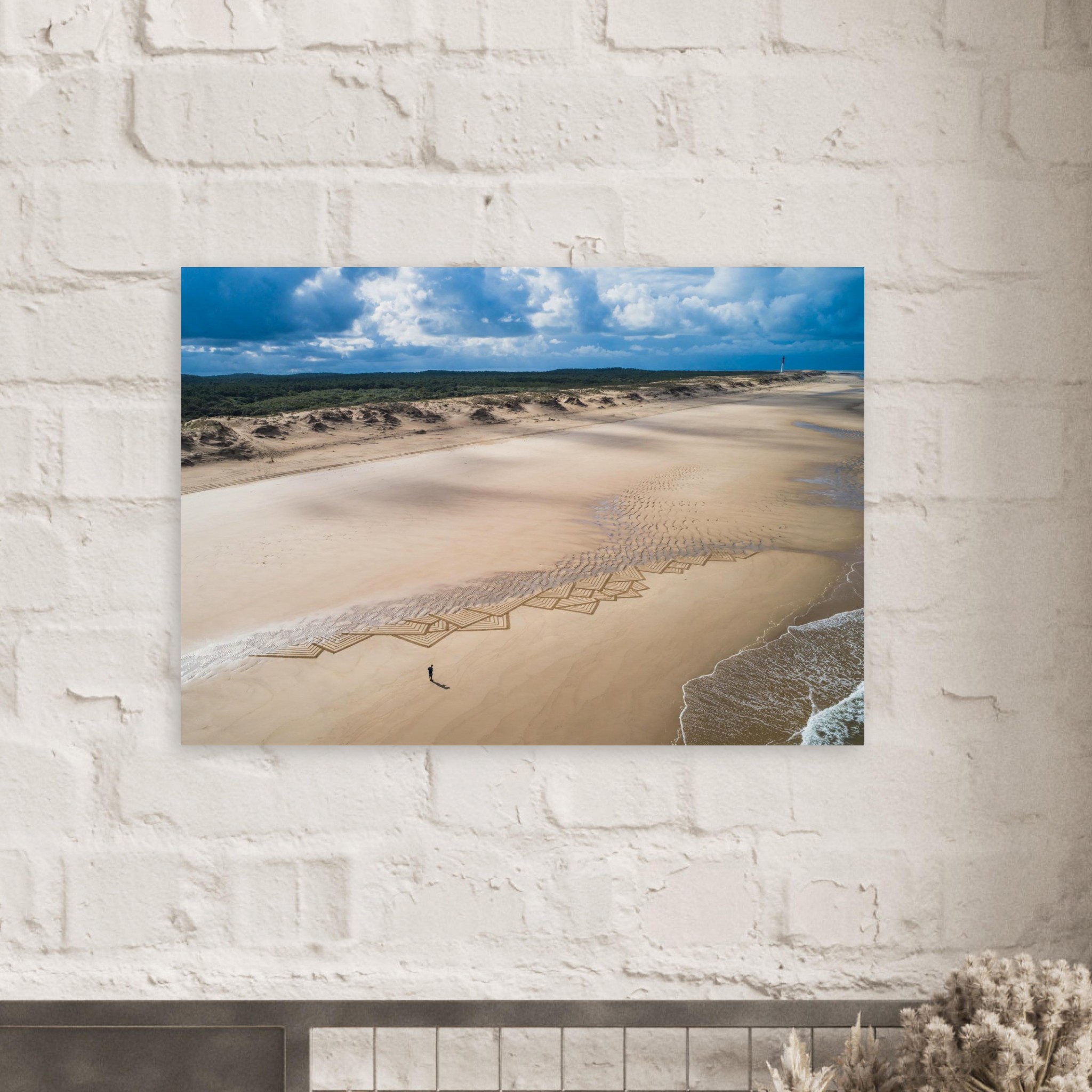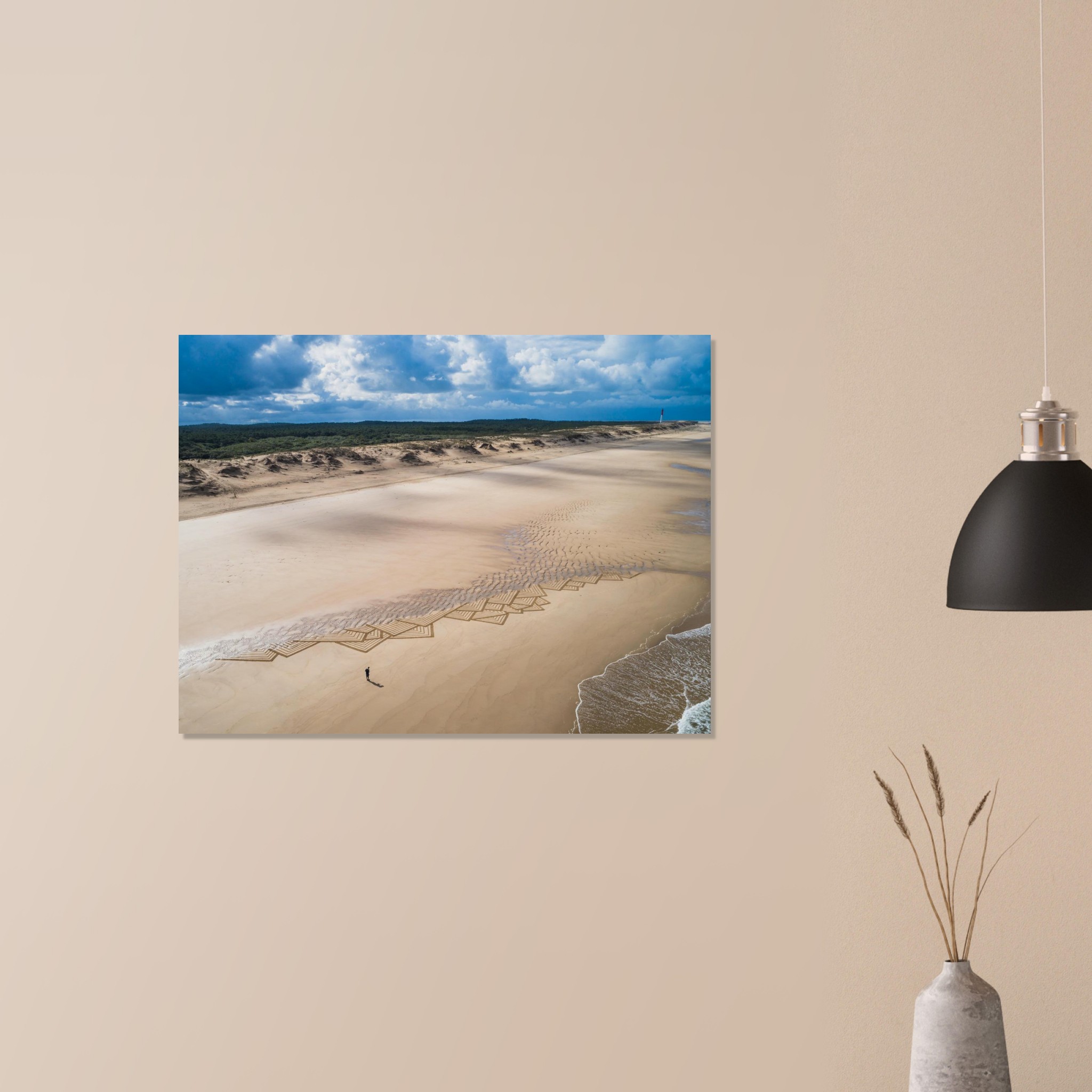 « Triangles des sables » est une composition hypnotique où les formes triangulaires s’enchaînent le long de la plage, dialoguant avec les ondulations naturelles laissées par la mer.