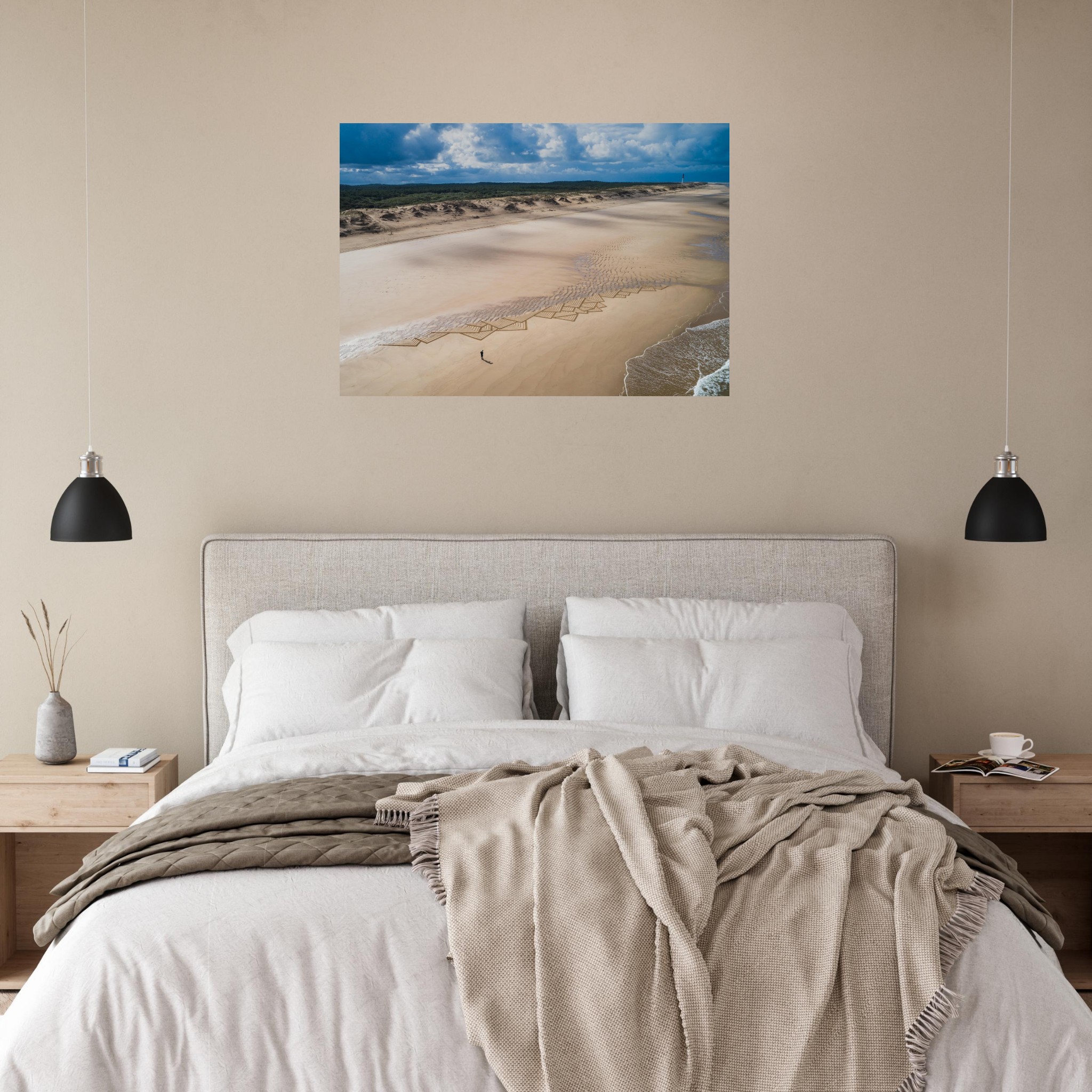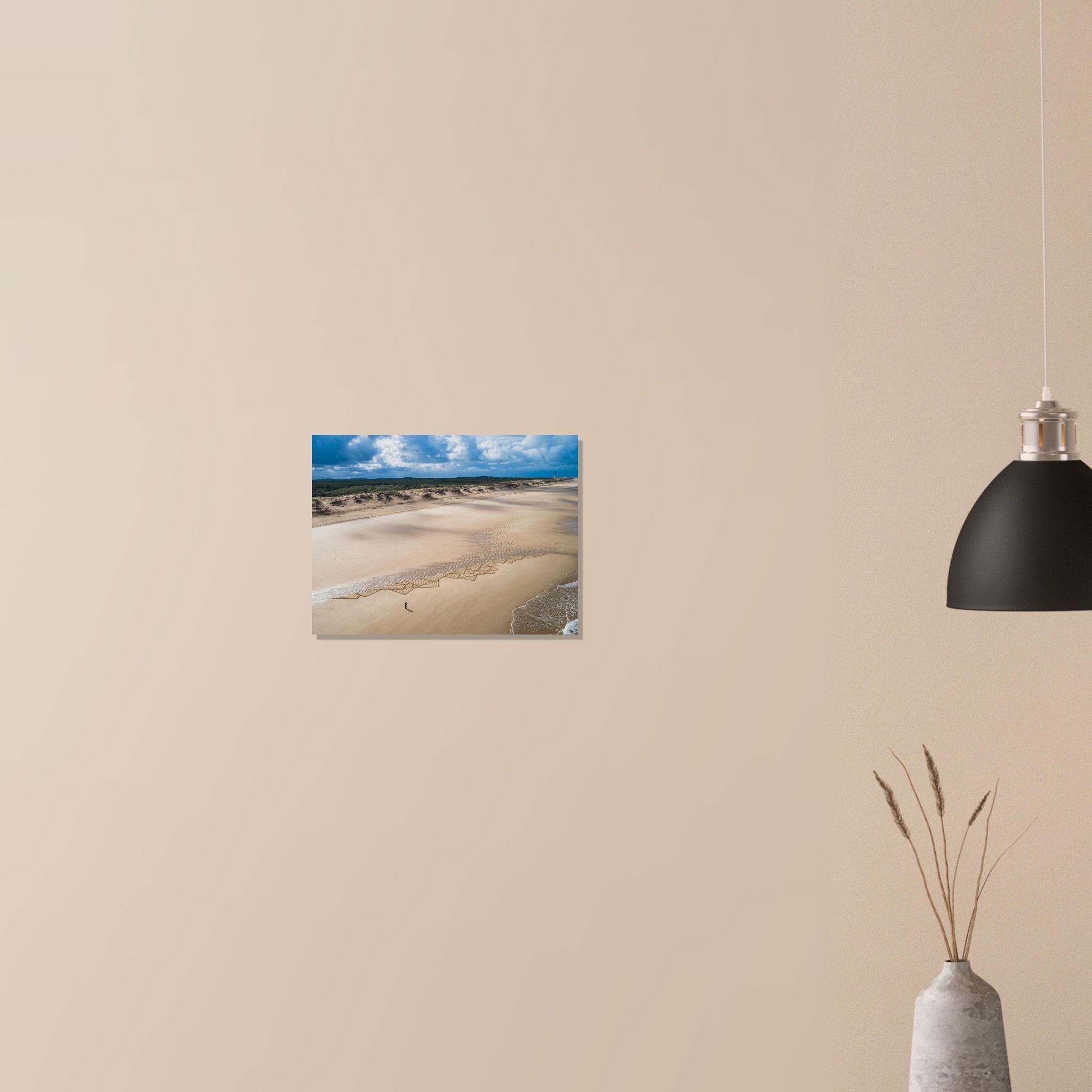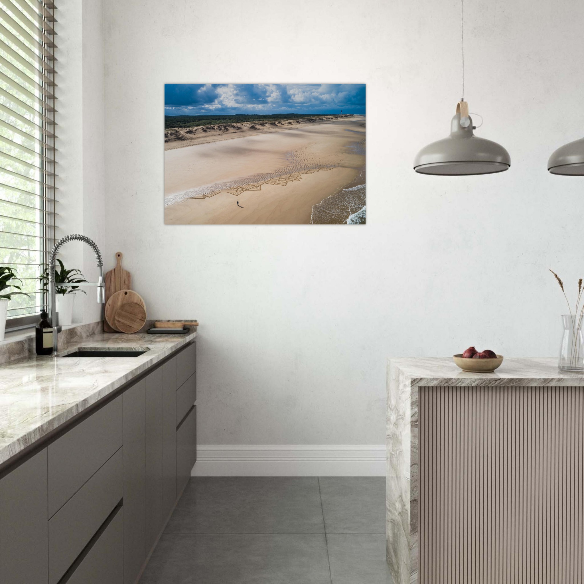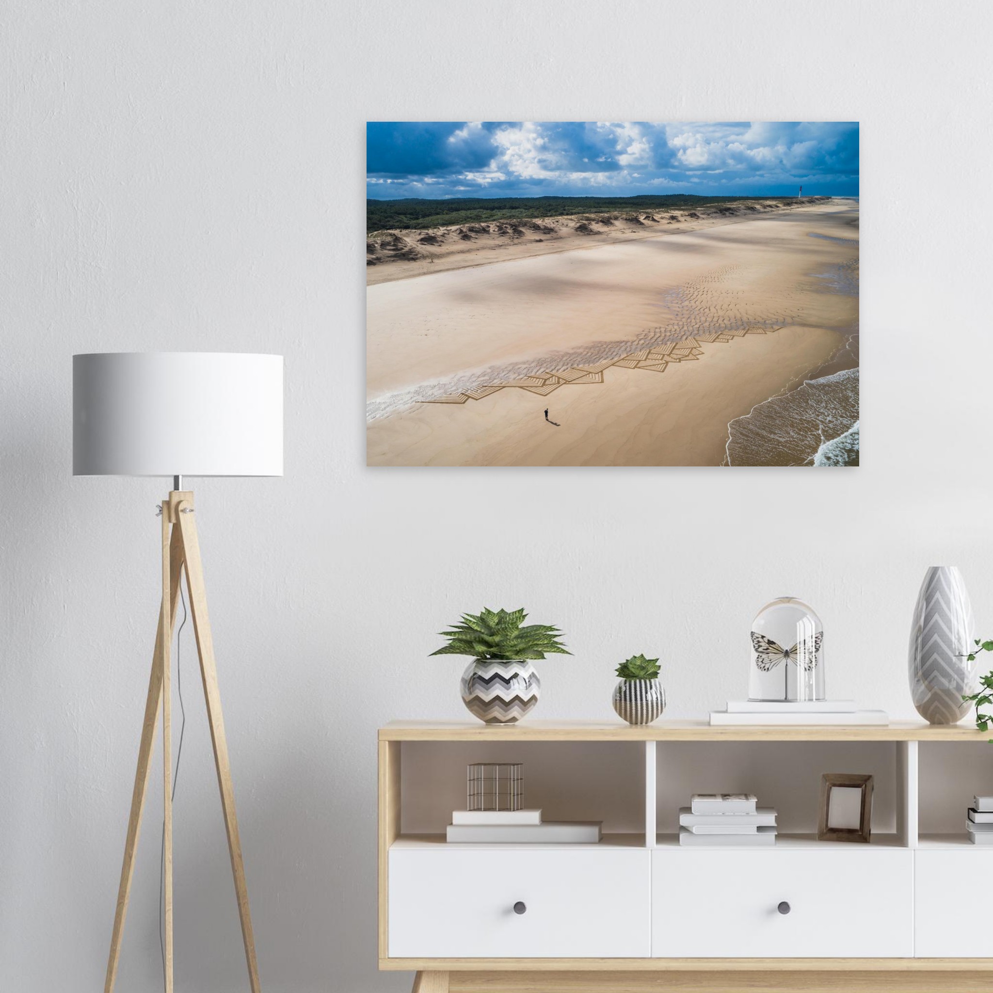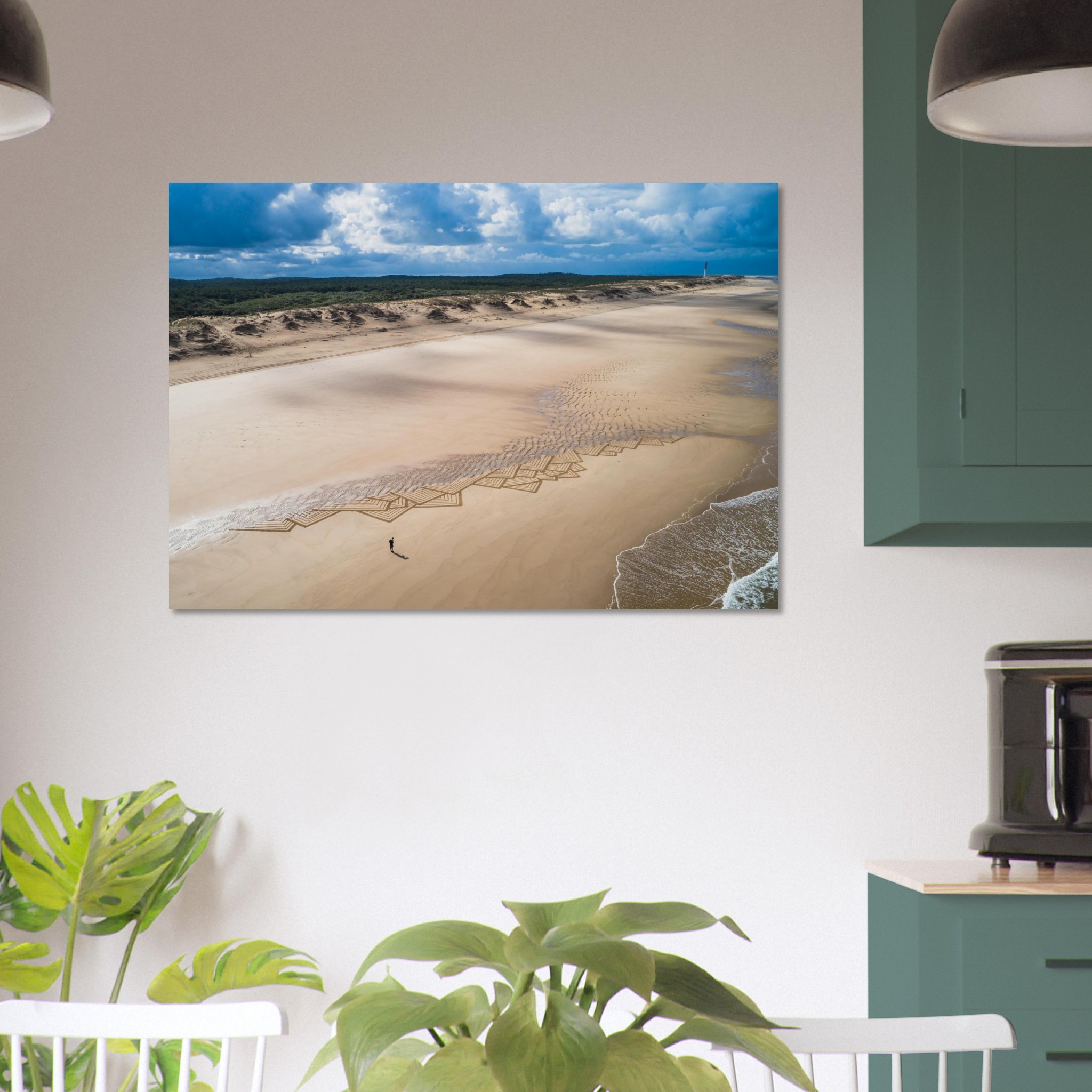 « Triangles des sables » est une composition hypnotique où les formes triangulaires s’enchaînent le long de la plage, dialoguant avec les ondulations naturelles laissées par la mer.