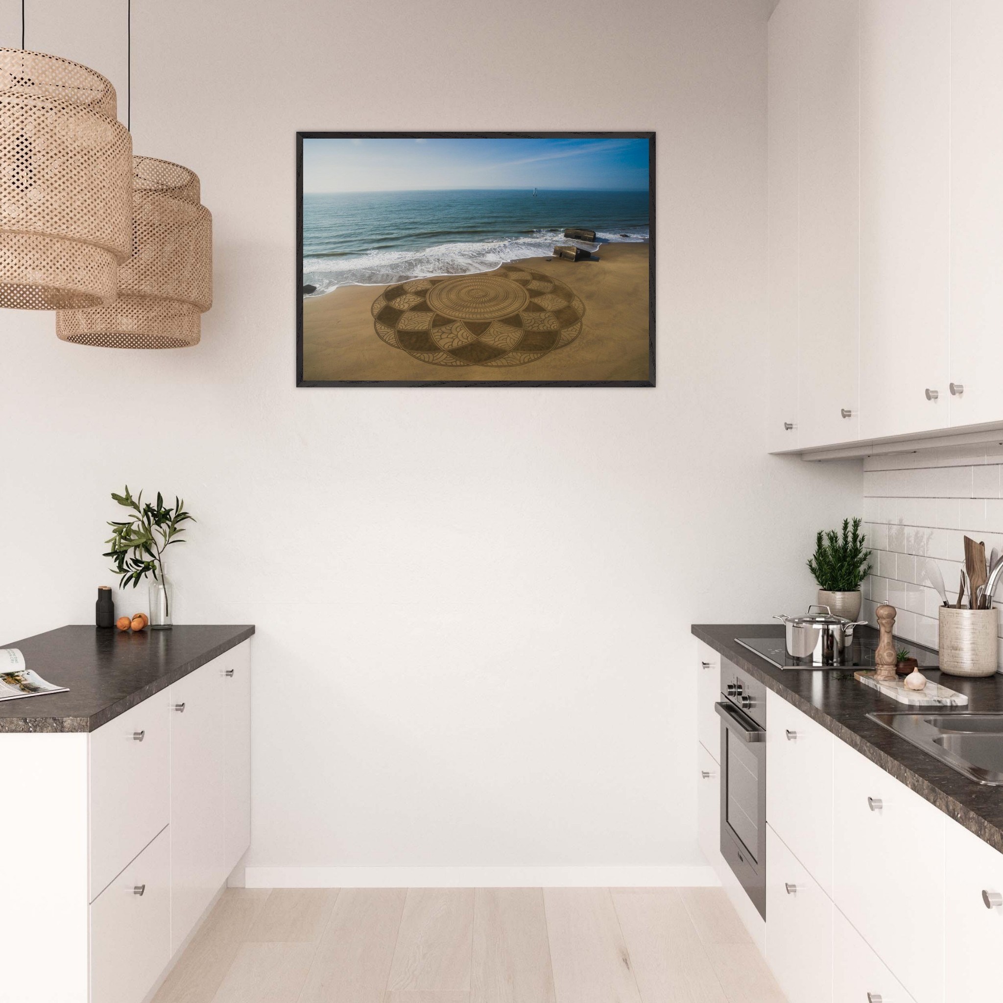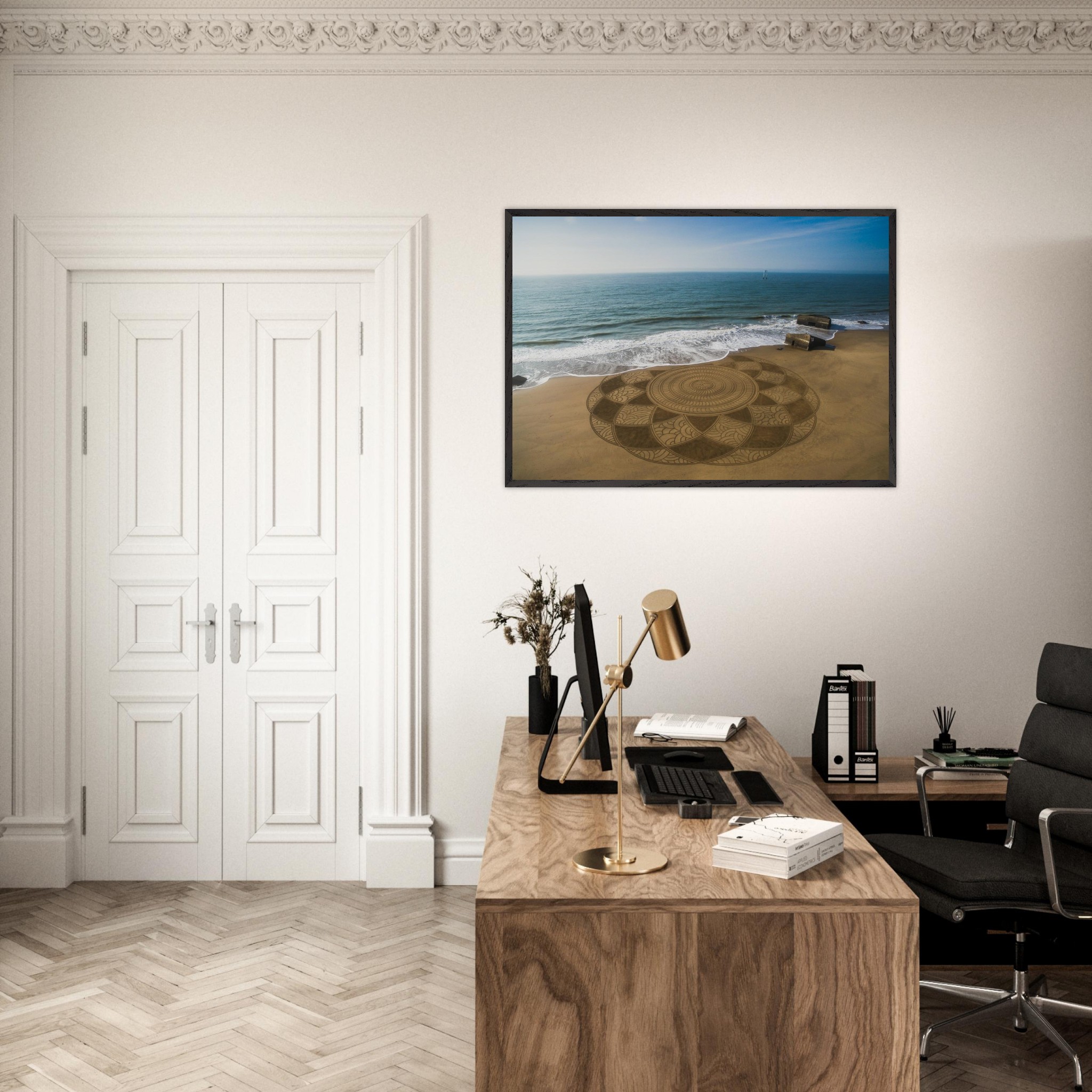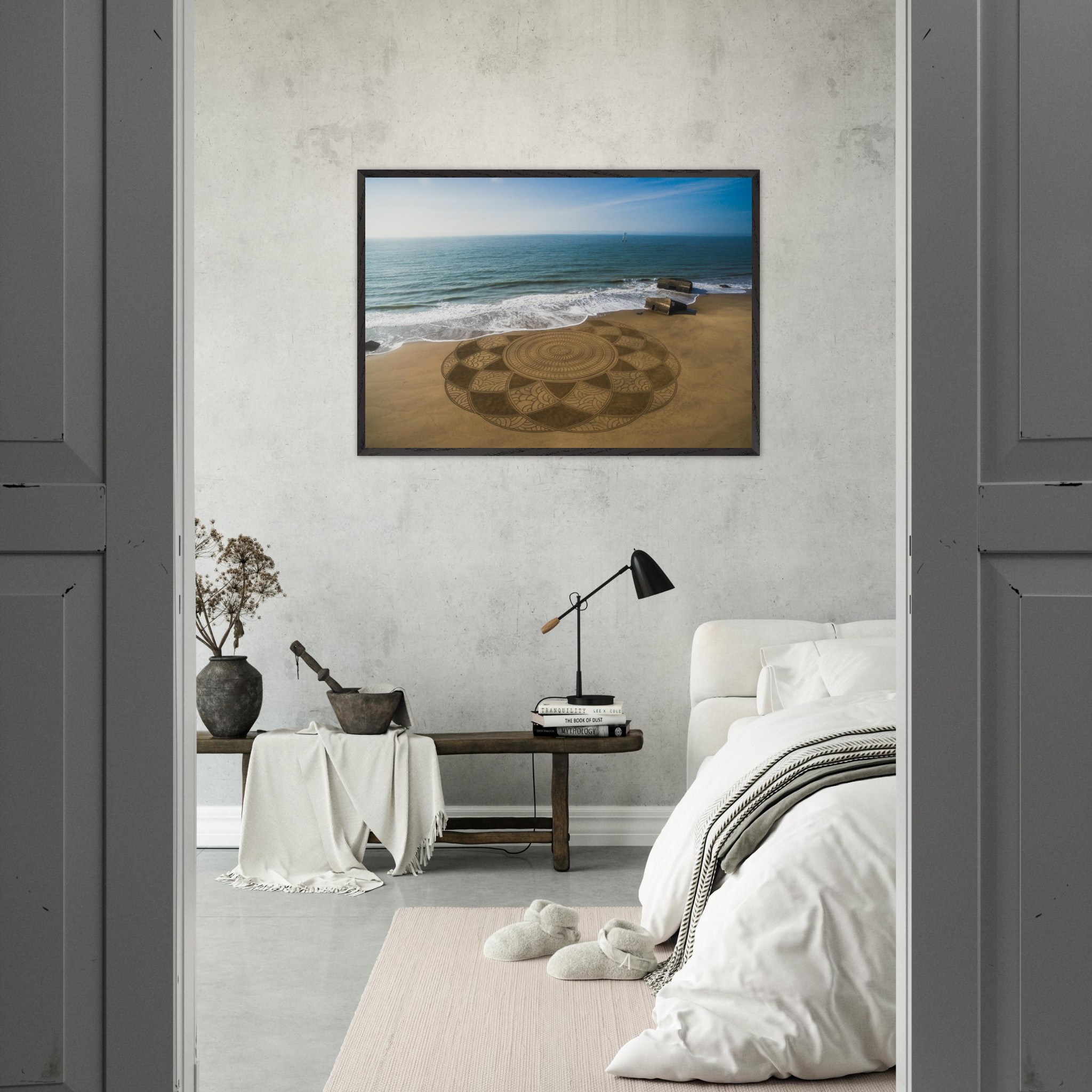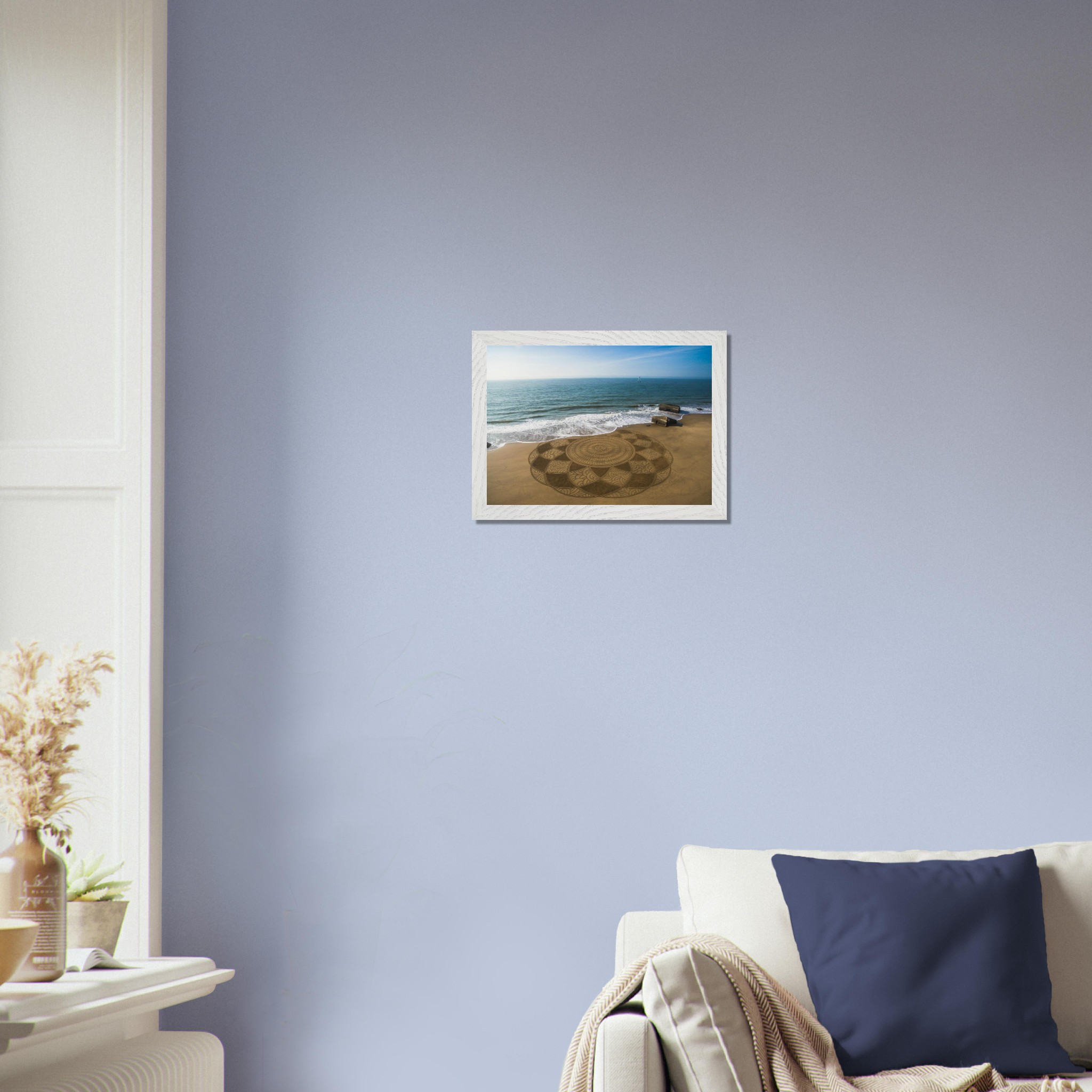 Symbole de plénitude et d’équilibre, ce mandala effet mer est préservé dans ce tirage encadré de qualité musée, transformant une création fragile en un objet d’art intemporel et puissant.