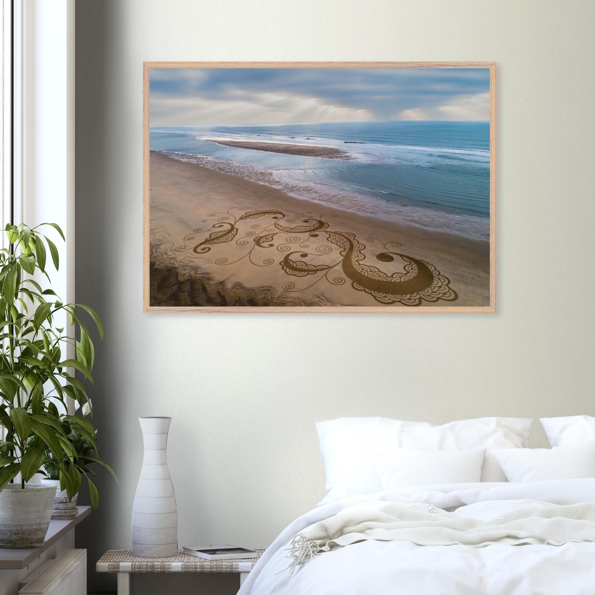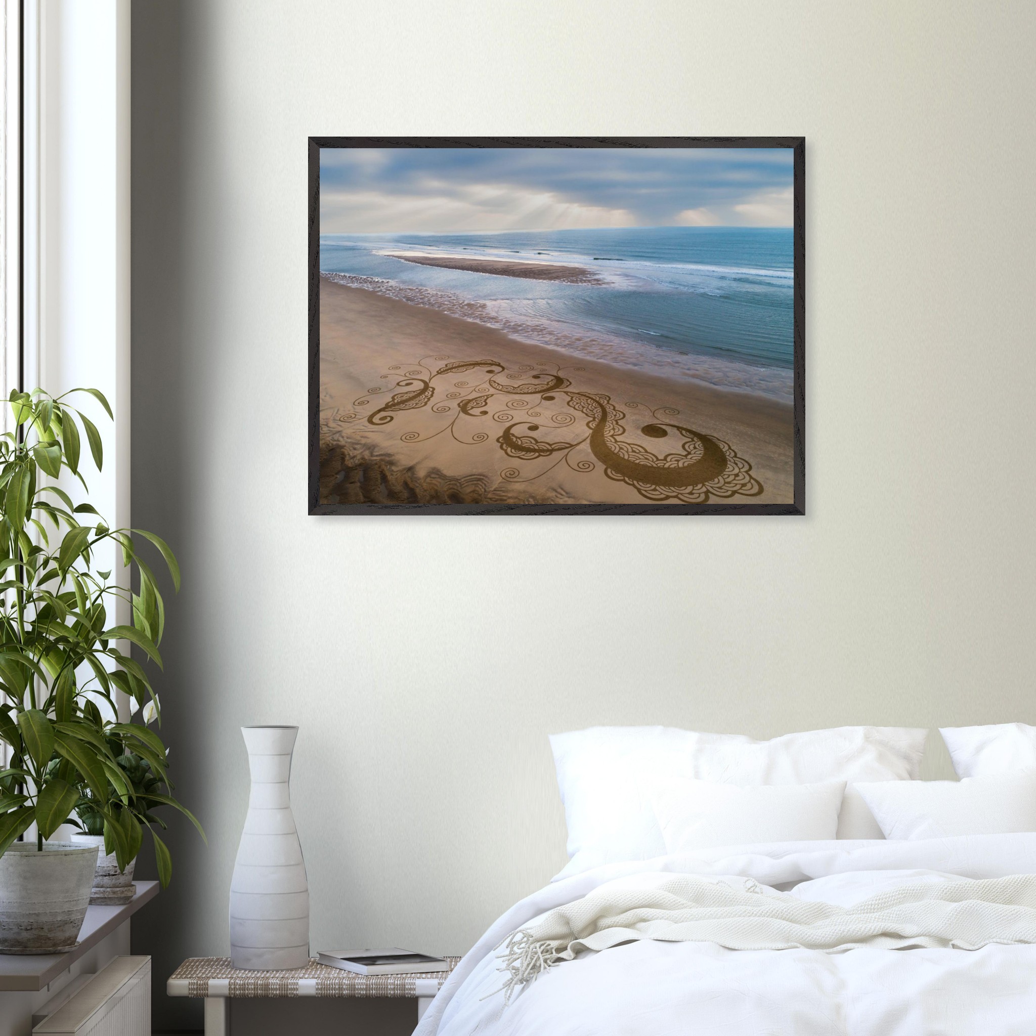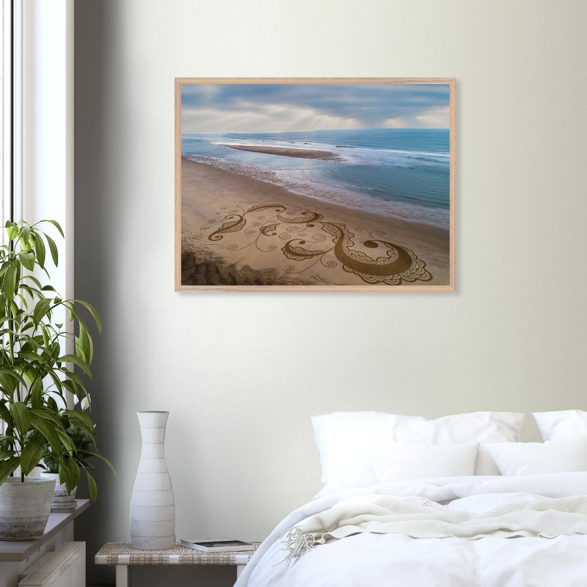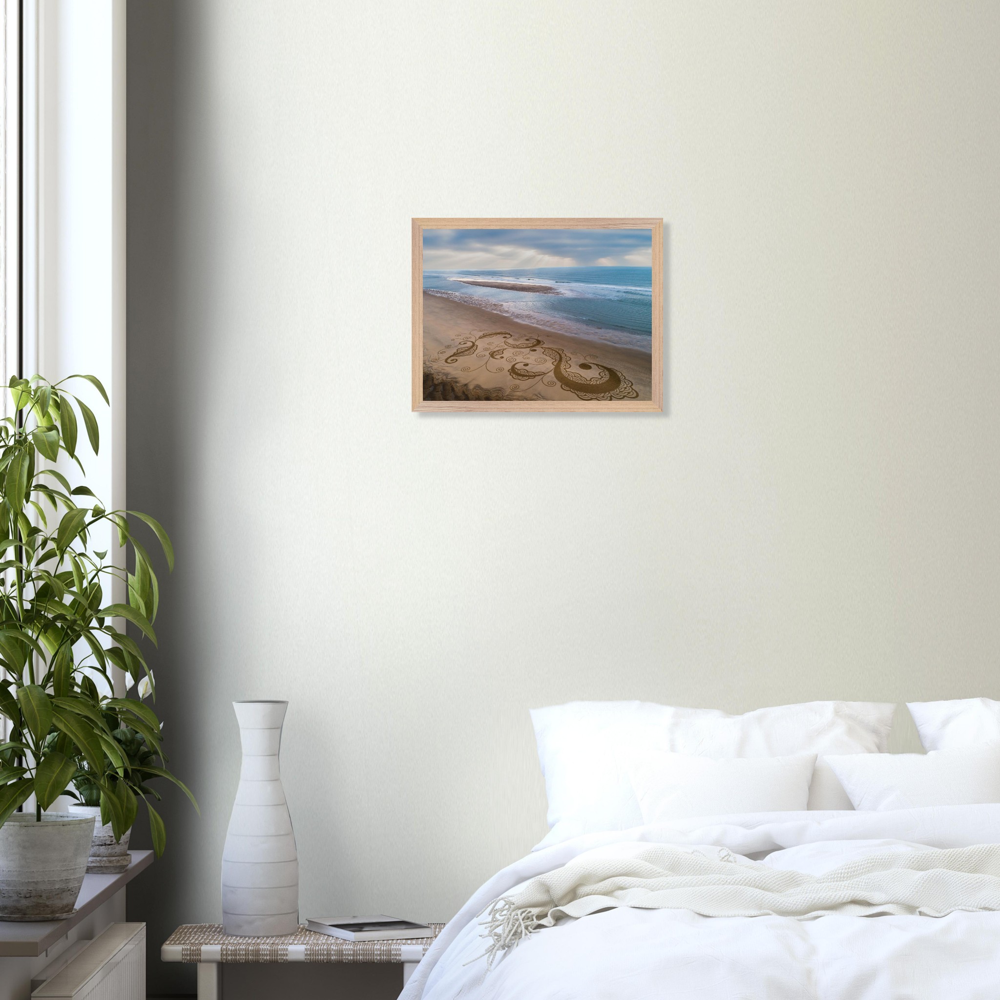 Un dessin sur le sable organique et hypnotique, sublimé dans un encadrement premium prêt à accrocher.