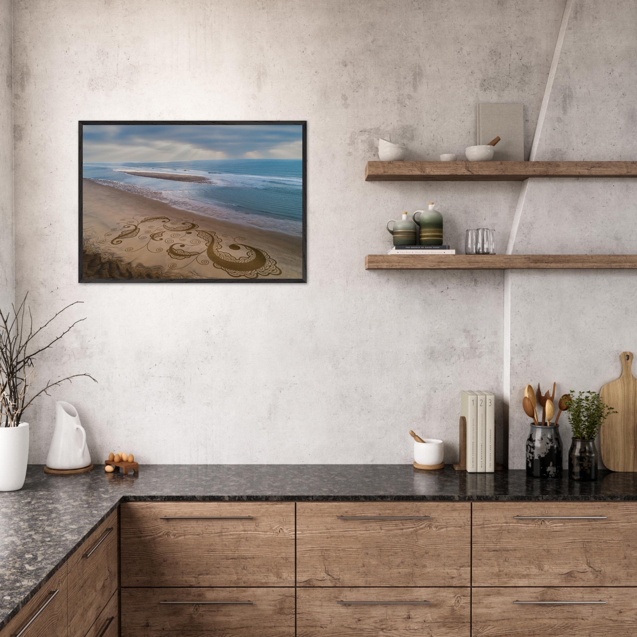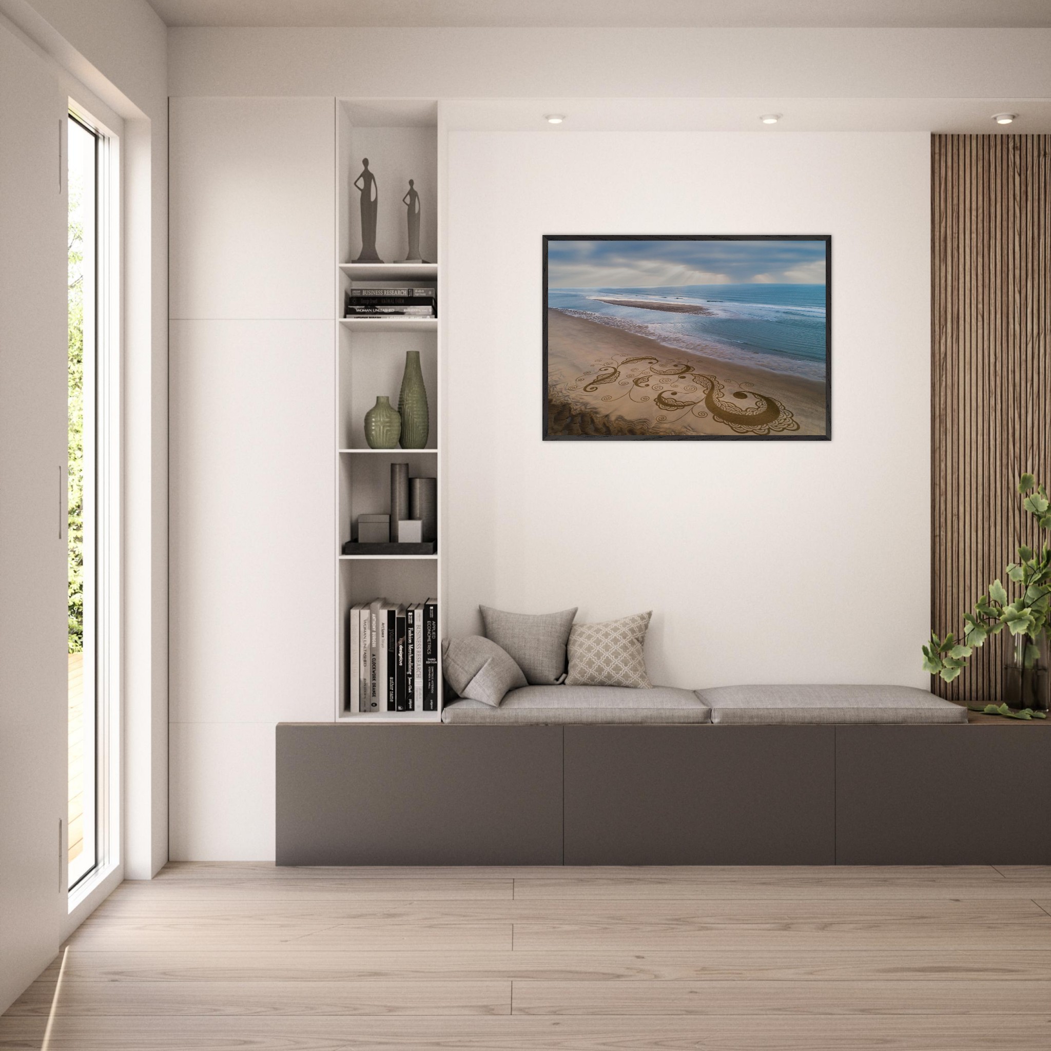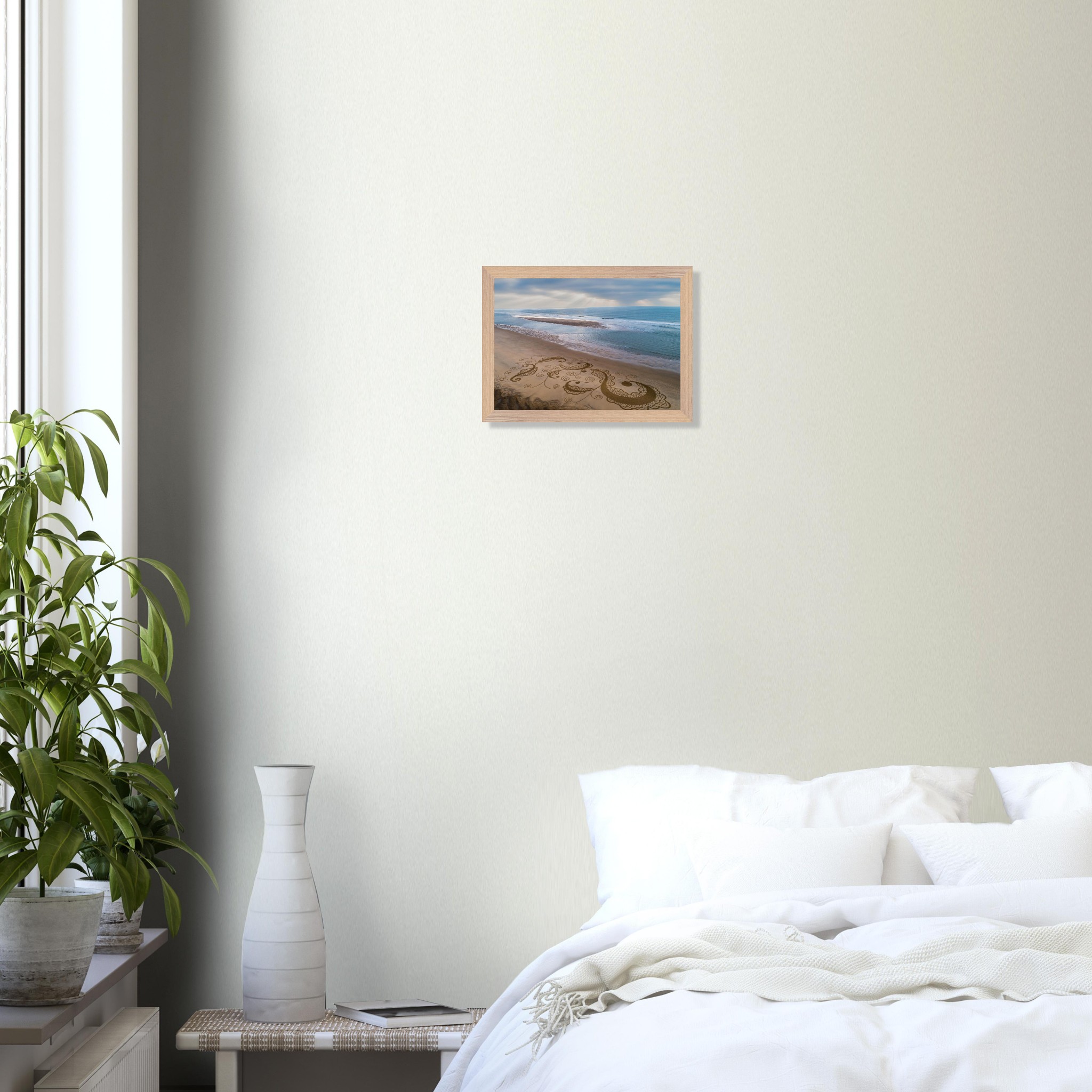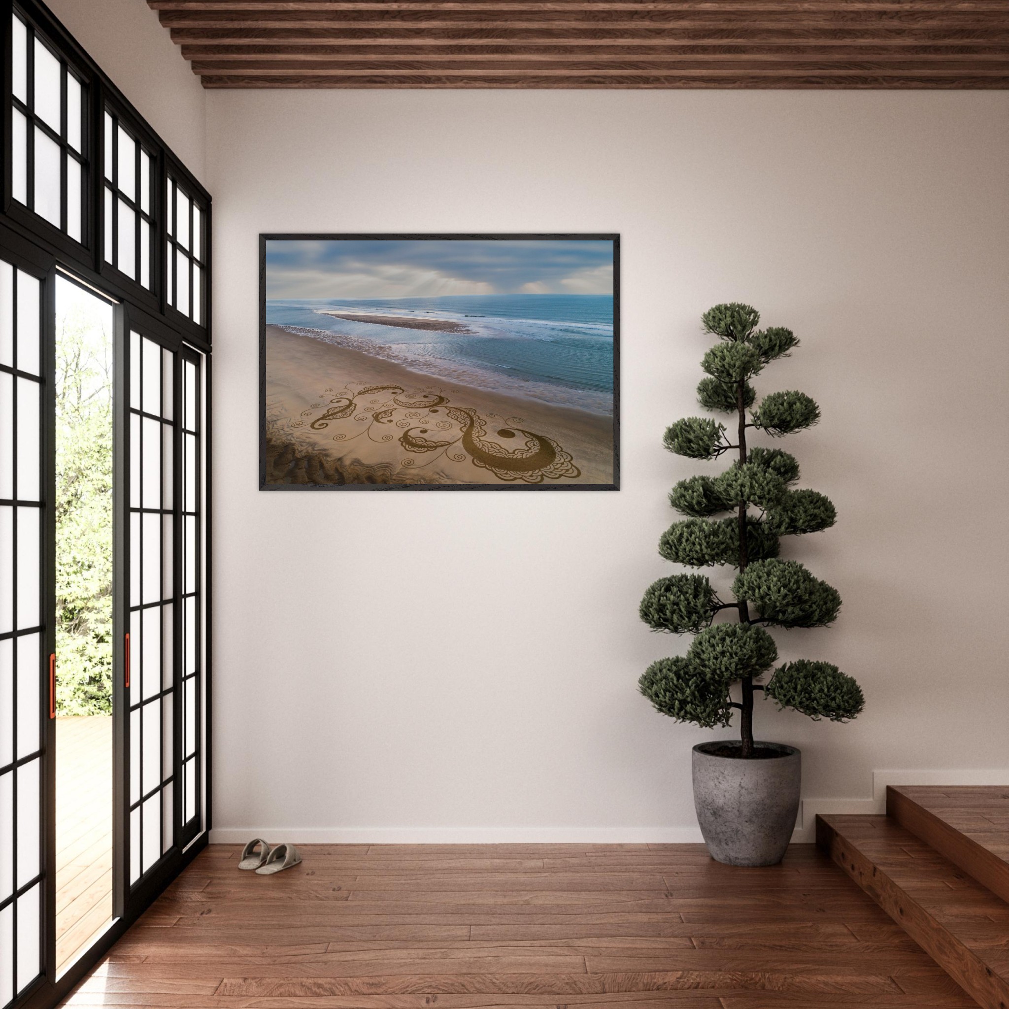 Un dessin sur le sable organique et hypnotique, sublimé dans un encadrement premium prêt à accrocher.