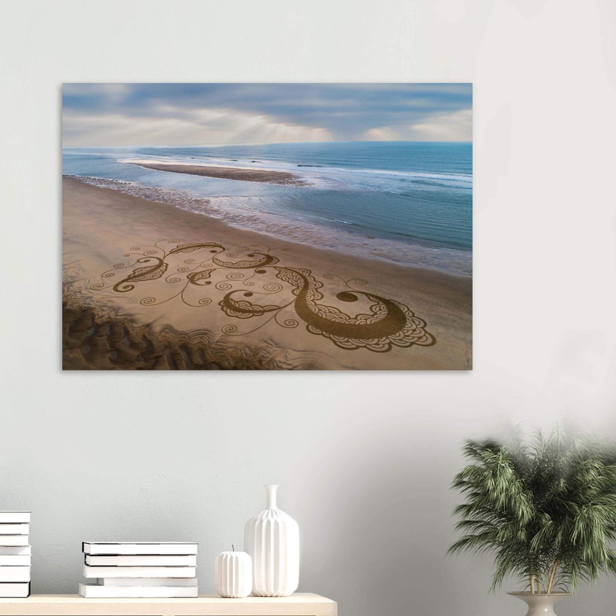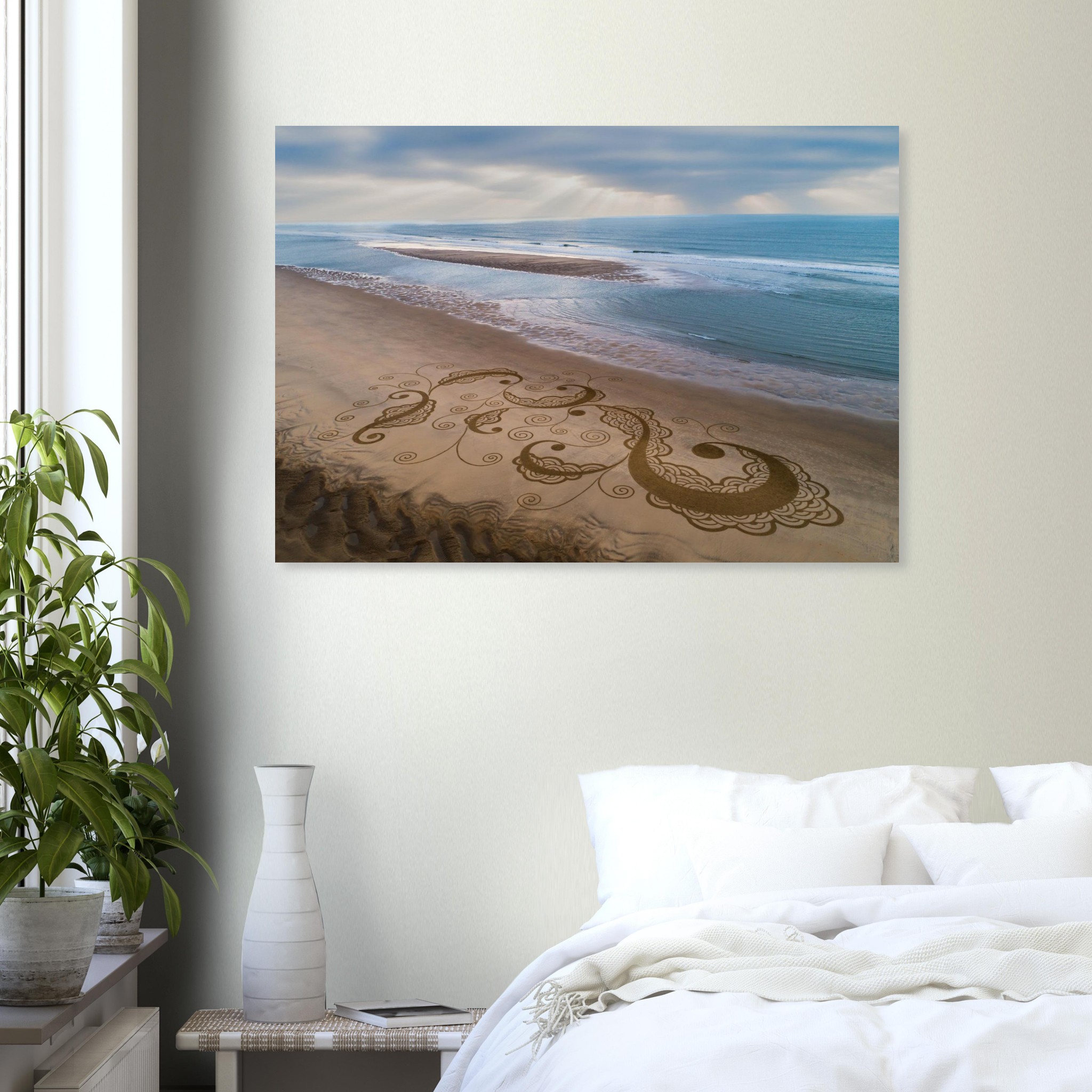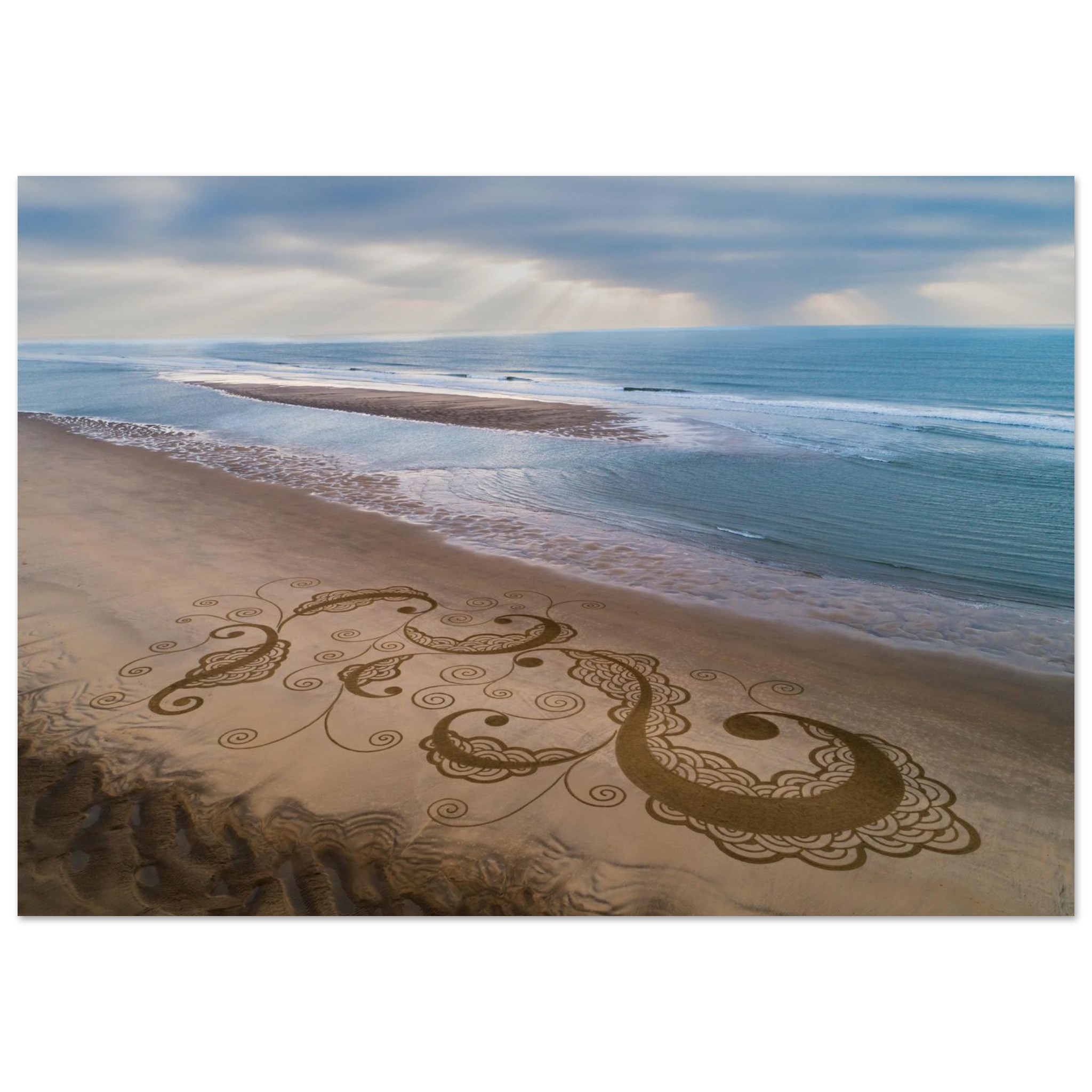 « Virgulus » est une danse visuelle sculptée dans le sable, faite de spirales délicates et de volutes végétales. Chaque courbe invite à suivre un mouvement fluide, comme une respiration reliant ciel, mer et terre.
